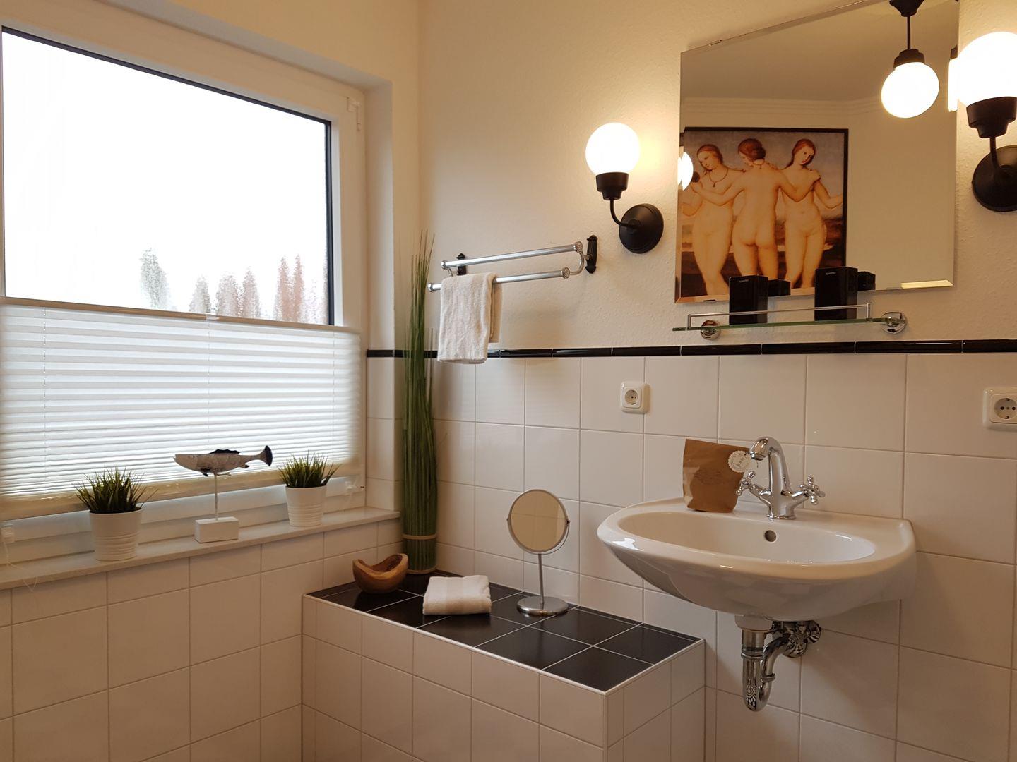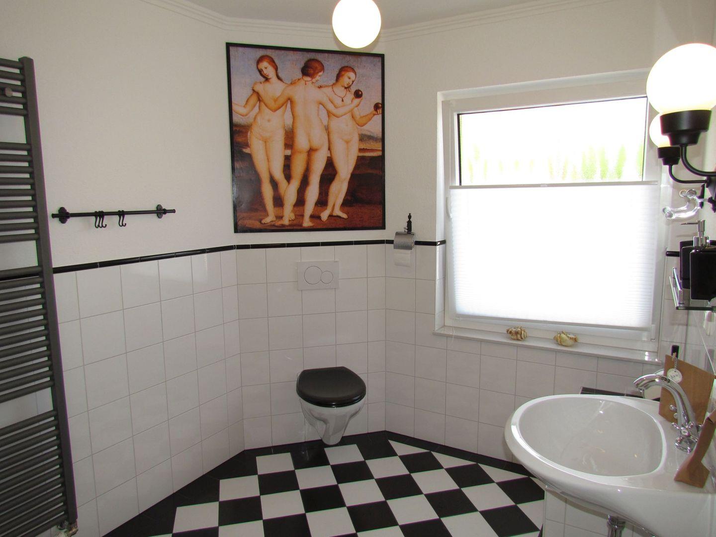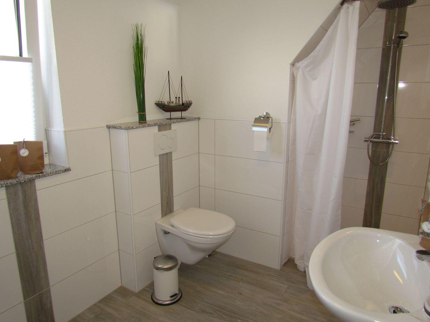 Ein Schlafzimmer mit TV und ein behindertenfreundliches Badezimmer mit Fußbodenheizung befinden sich ebenfalls im Erdgeschoss. Es gibt allerdings keine verbreiterten Türen, so das nur Platz für kleinere Rollstühle und Rollatoren vorhanden ist.