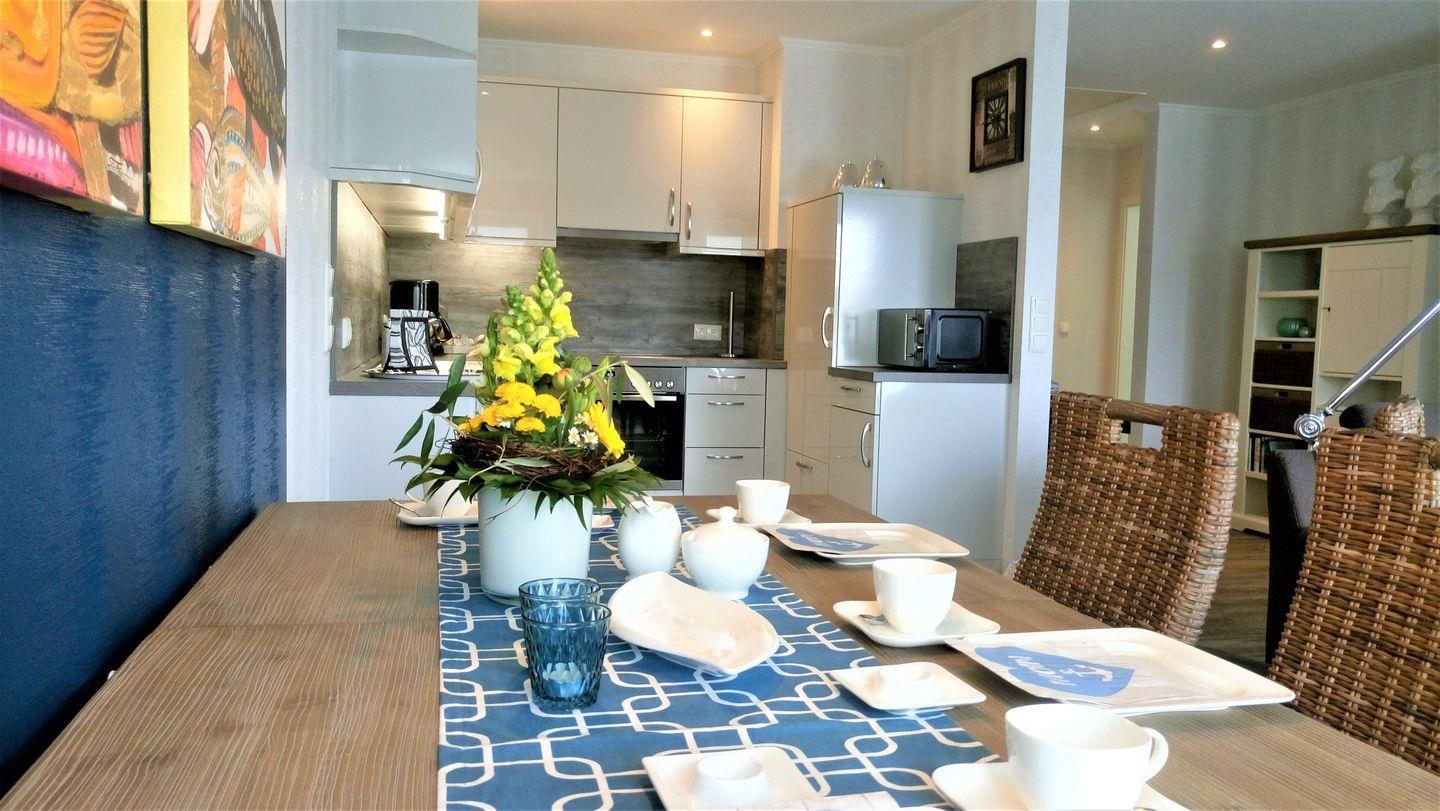 In der exklusiven Küchenzeile fehlt es an nichts, von einer Geschirrspülmaschine bis hin zum Backofen, ist alles vorhanden, um sich selber zu verpflegen. Ein Esstisch lädt zum Verzehr der Leckereien aus der Region ein.