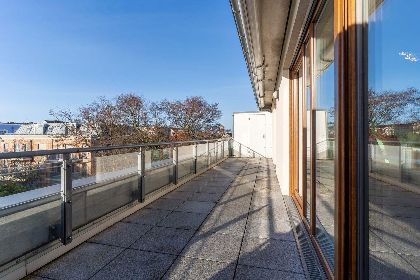 Von diesem einladenden Wohnbereich gelangen Sie auf die atemberaubende, möblierte Dachterrasse, auf der Sie einen traumhaften Blick auf den Hafen, die majestätische Hafenschleuse und das glitzernde Meer genießen können. Hier können Sie die Sonne tanken oder romantische Abende bei einem Glas Wein und dem Rauschen der Wellen verbringen. Für zusätzlichen Komfort und Sonnenschutz stehen Ihnen auf der Terrasse zwei elektrische Außenmarkisen zur Verfügung.