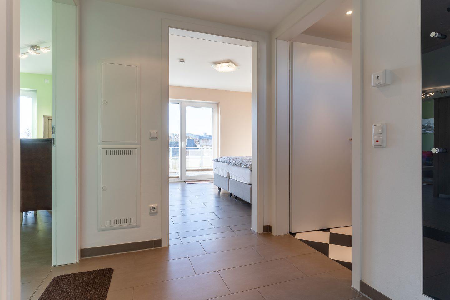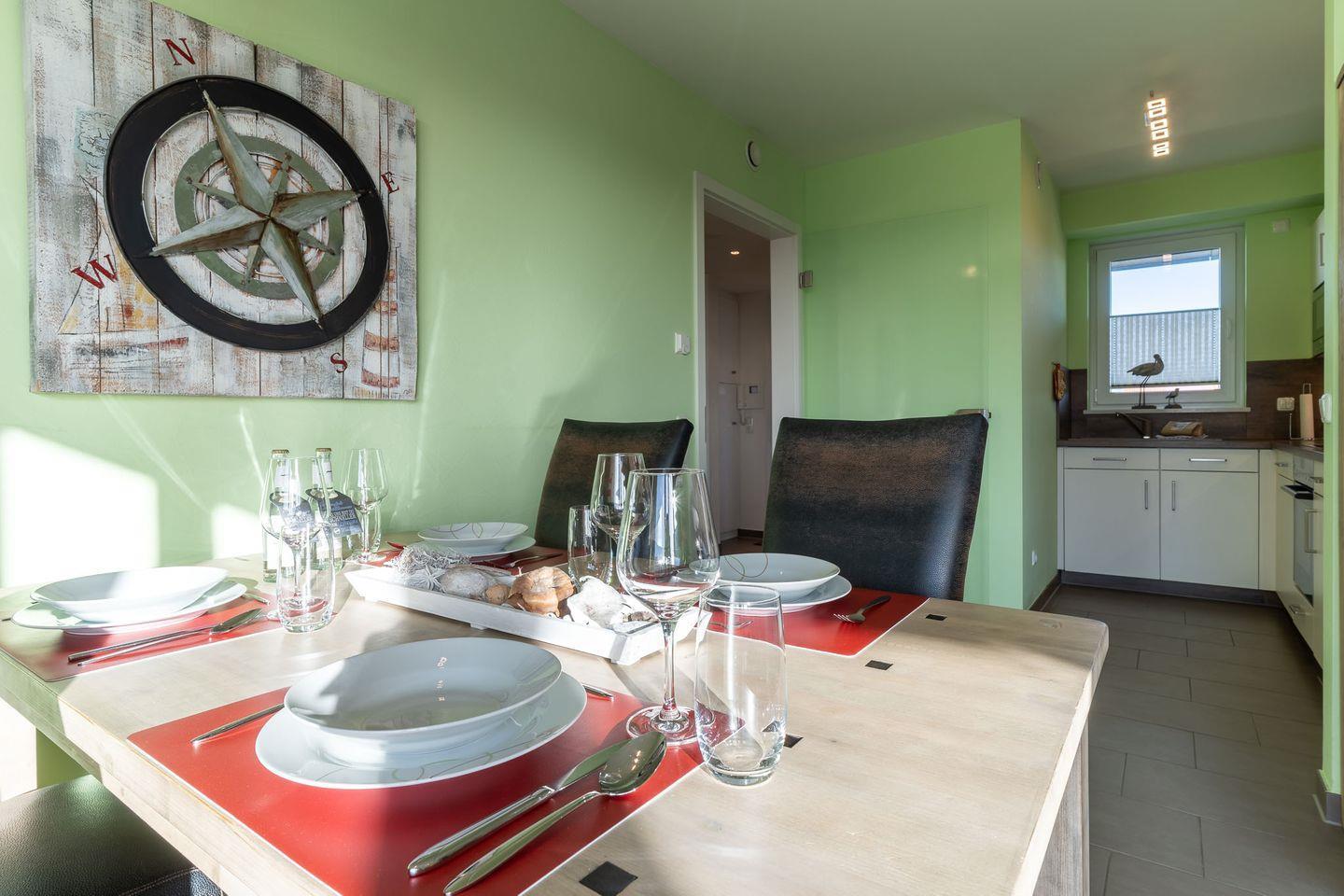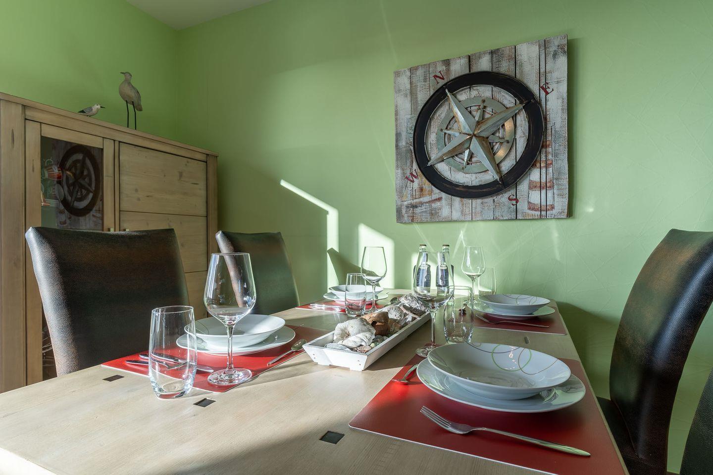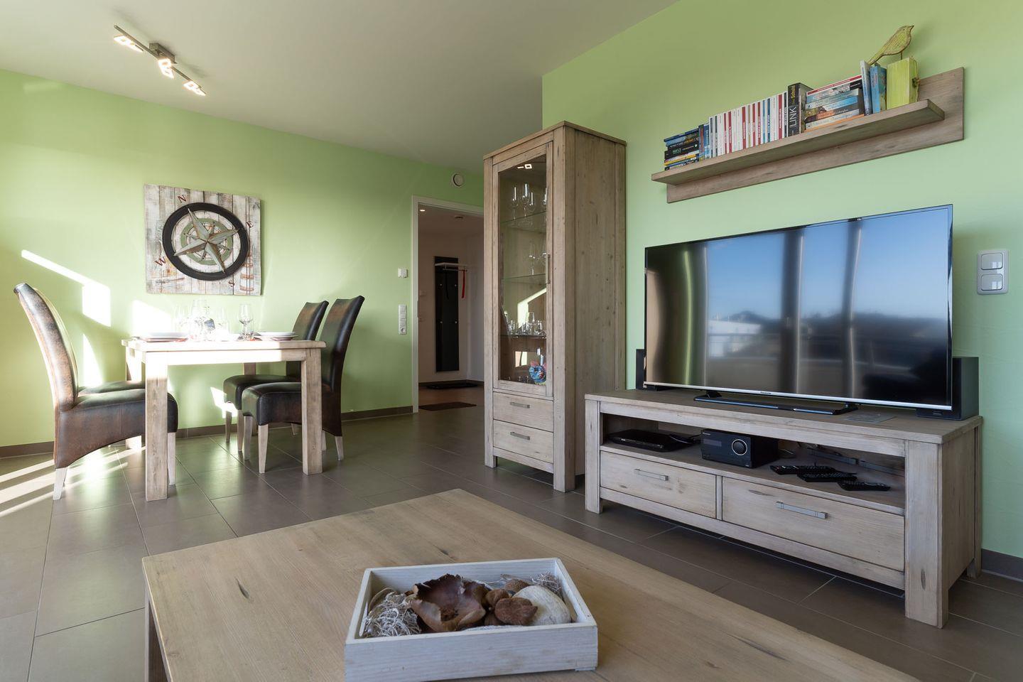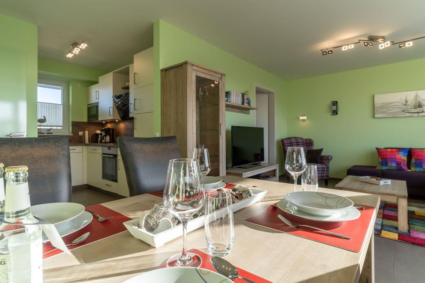 Die Ferienwohnung erwartet Sie mit zwei stilvoll eingerichteten Schlafzimmern, die jeweils mit hochwertigen Boxspringbetten (1,60 x 2 m und 1,80 x 2 m) sowie einem Flachbildfernseher ausgestattet sind. Ein modernes Duschbad und ein zusätzliches Gäste-WC sorgen für Komfort und Bequemlichkeit. Im großzügigen Wohn-Essbereich erwartet Sie eine gemütliche, großzügige Couch, ein bequemer Sessel sowie ein Esstisch mit Platz für vier Personen. Die voll ausgestattete Küche bietet Ihnen alle Annehmlichkeiten, um Ihre kulinarischen Fähigkeiten zu entfalten.