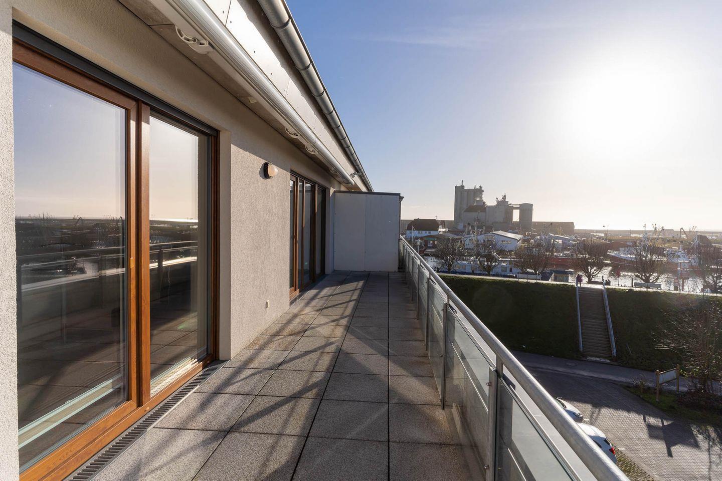 Luxuriöse Ferienwohnung mit Hafenblick und möblierter Dachterrasse in Büsum, nahe Strand und Restaurants.