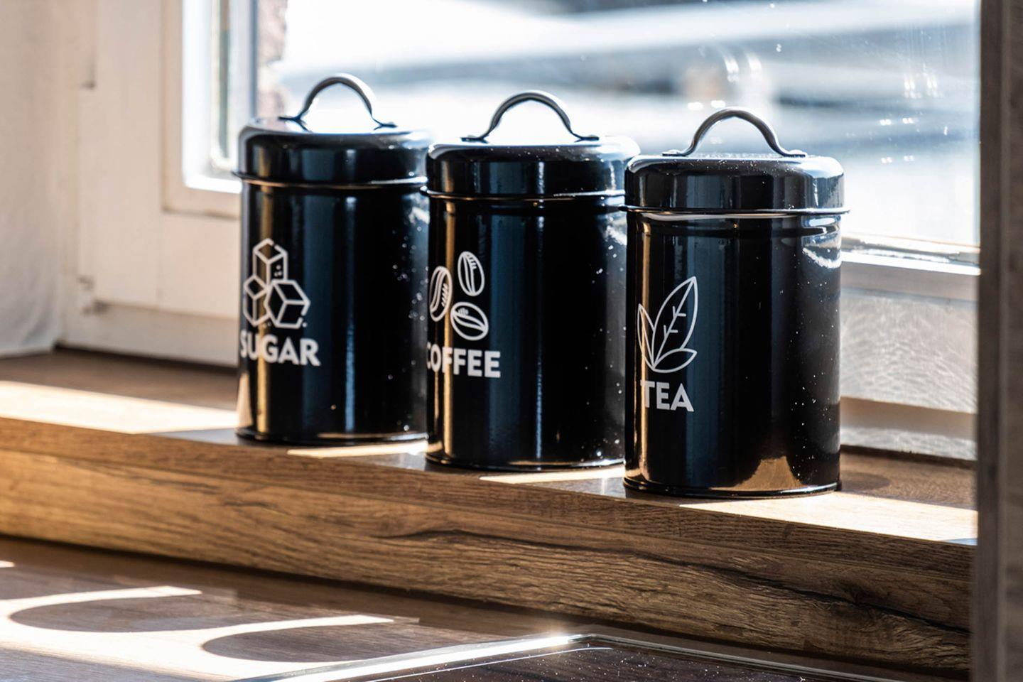 Die neue Küche verfügt über ein Cerankochfeld, einen Backofen, einen Kühlschrank mit Gefrierfach, eine Geschirrspülmaschine und eine Kaffeemaschine.