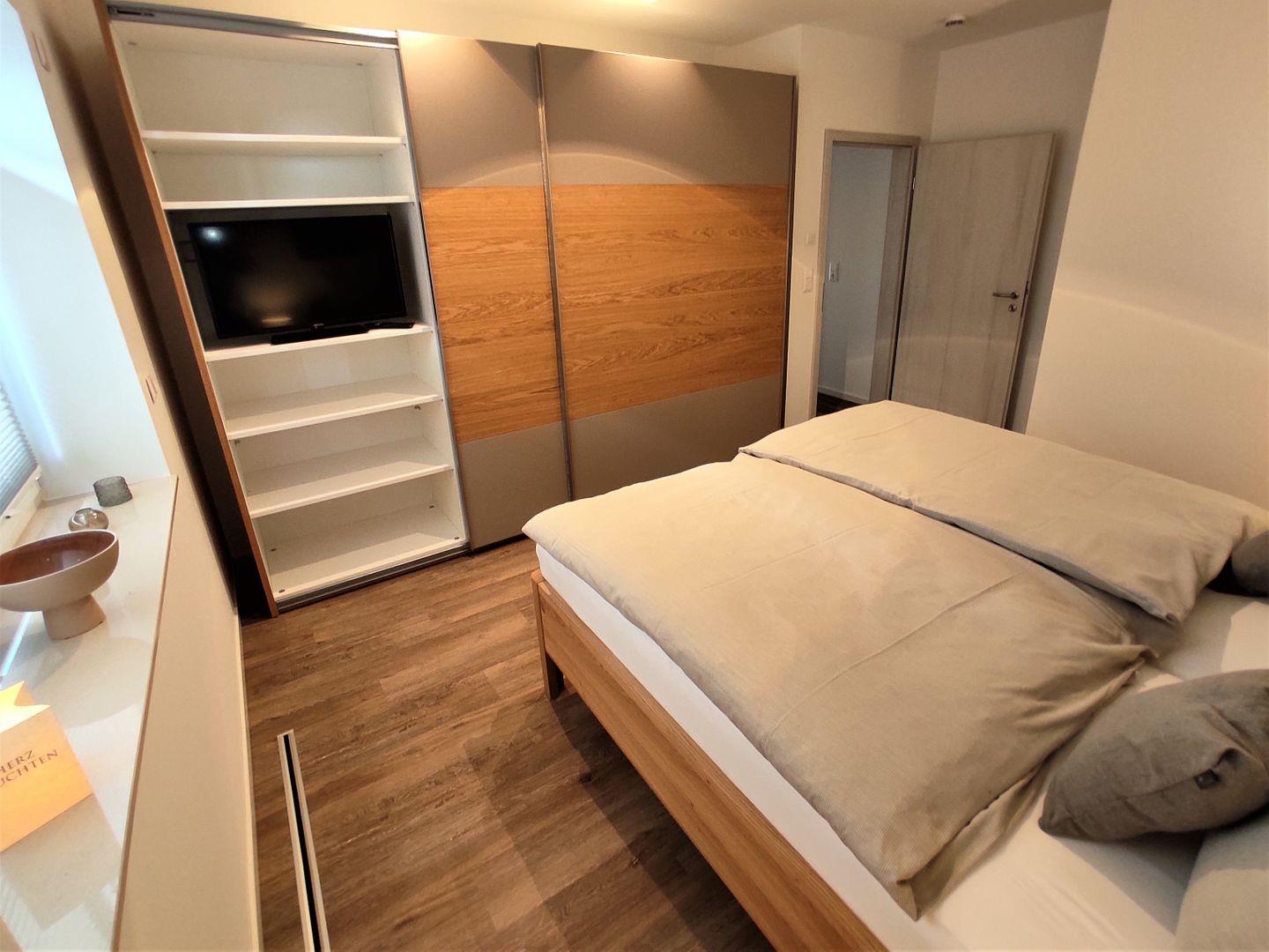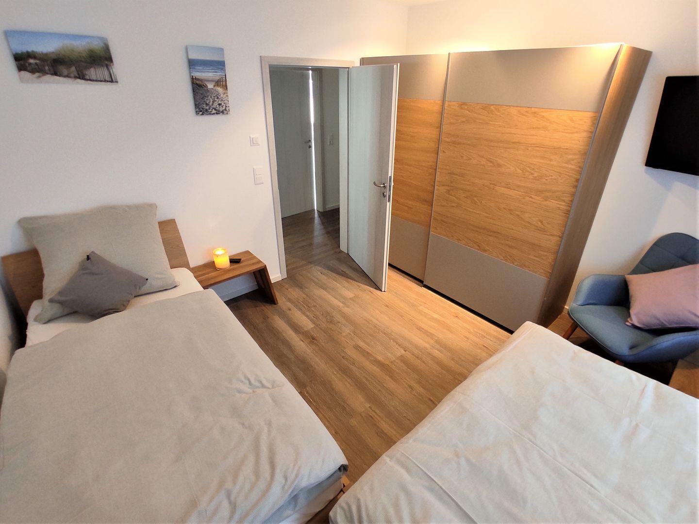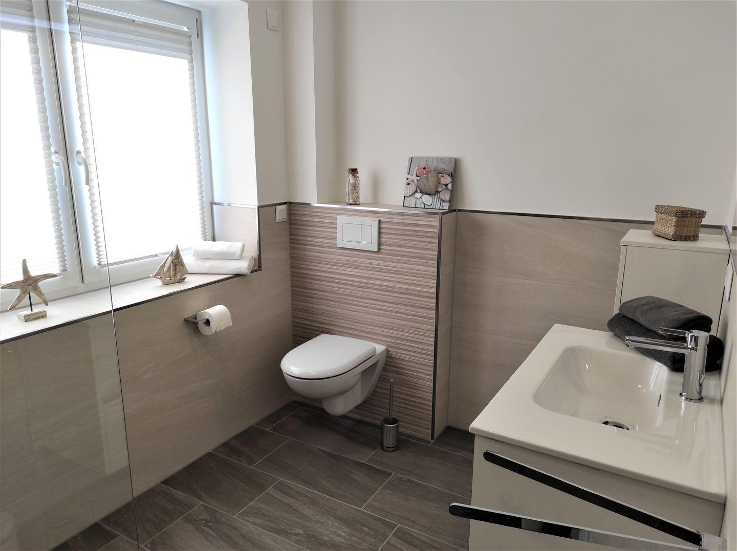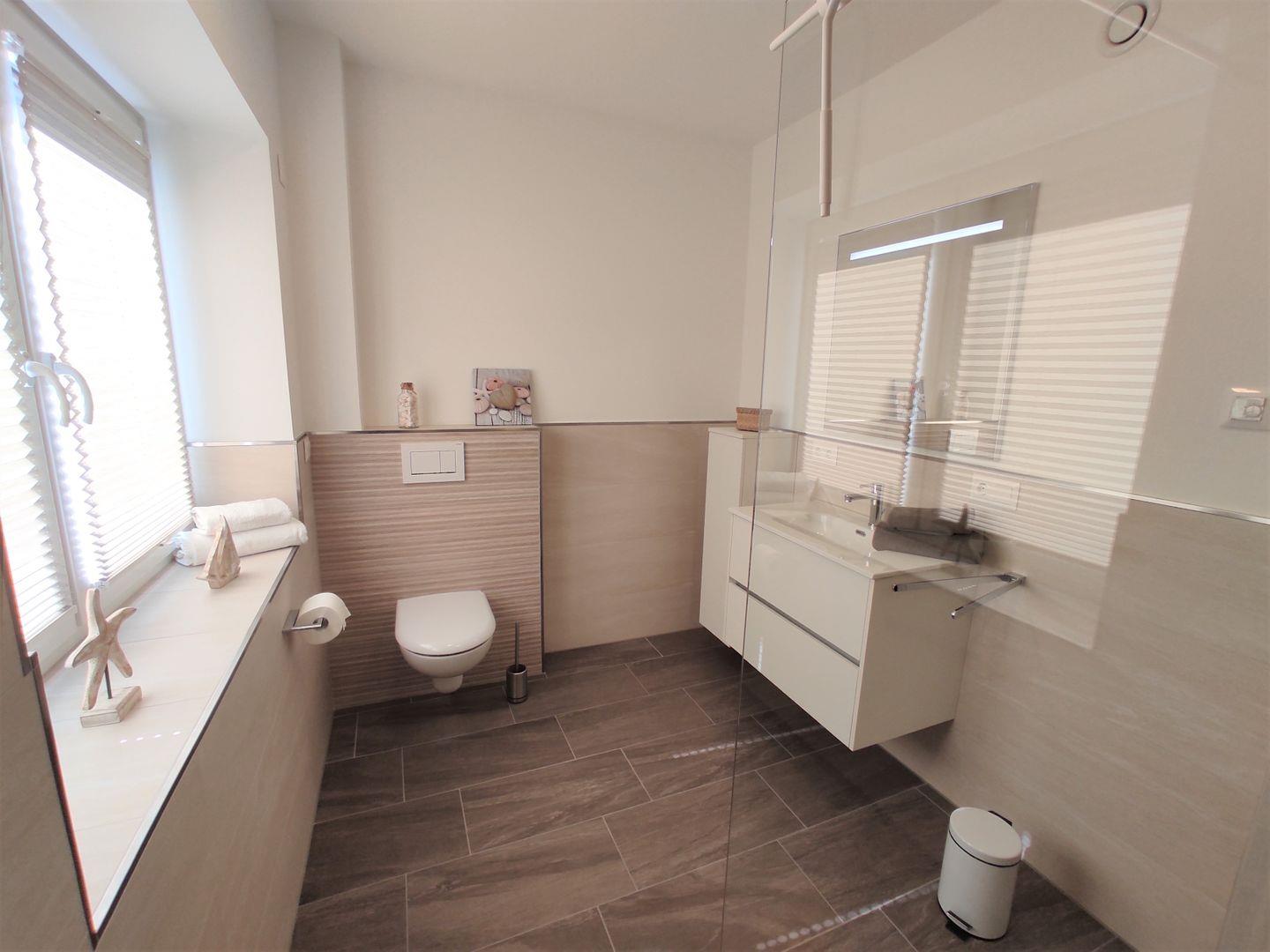 Durch die beiden Schlafzimmer (mit TV) und 2 komplette Tageslicht- Bäder, beide mit bodengleicher Dusche und WC, eignet sich die die Wohnung bestens für einen Urlaub mit Freunden oder der Familie.