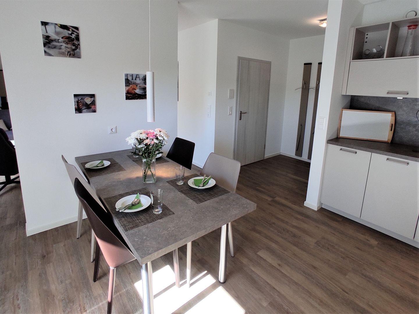 Die durch eine halbe Wand abgetrennte hochwertige Küche, lässt keine Wünsche offen. Hier befindet sich auch der Esstisch, an dem man sich bei gutem Essen und netten Gesprächen gerne nieder lässt.
