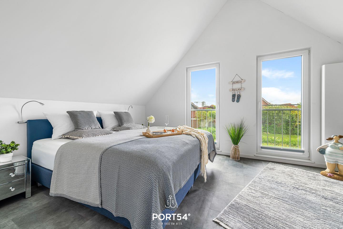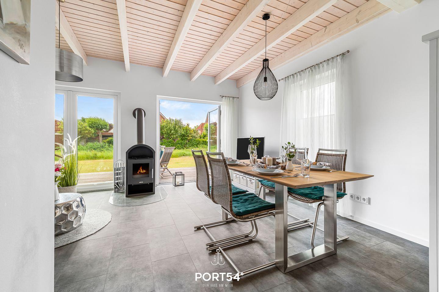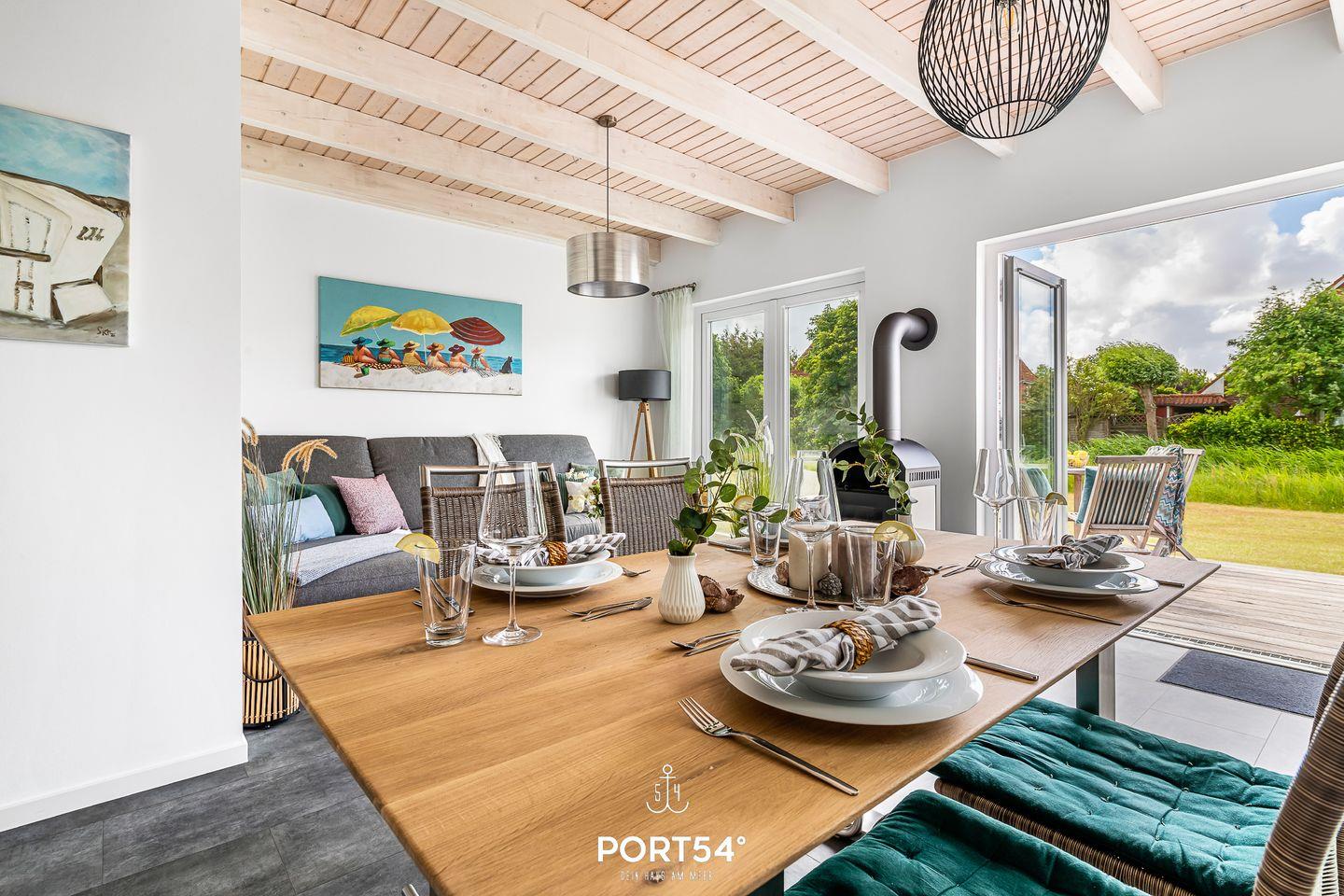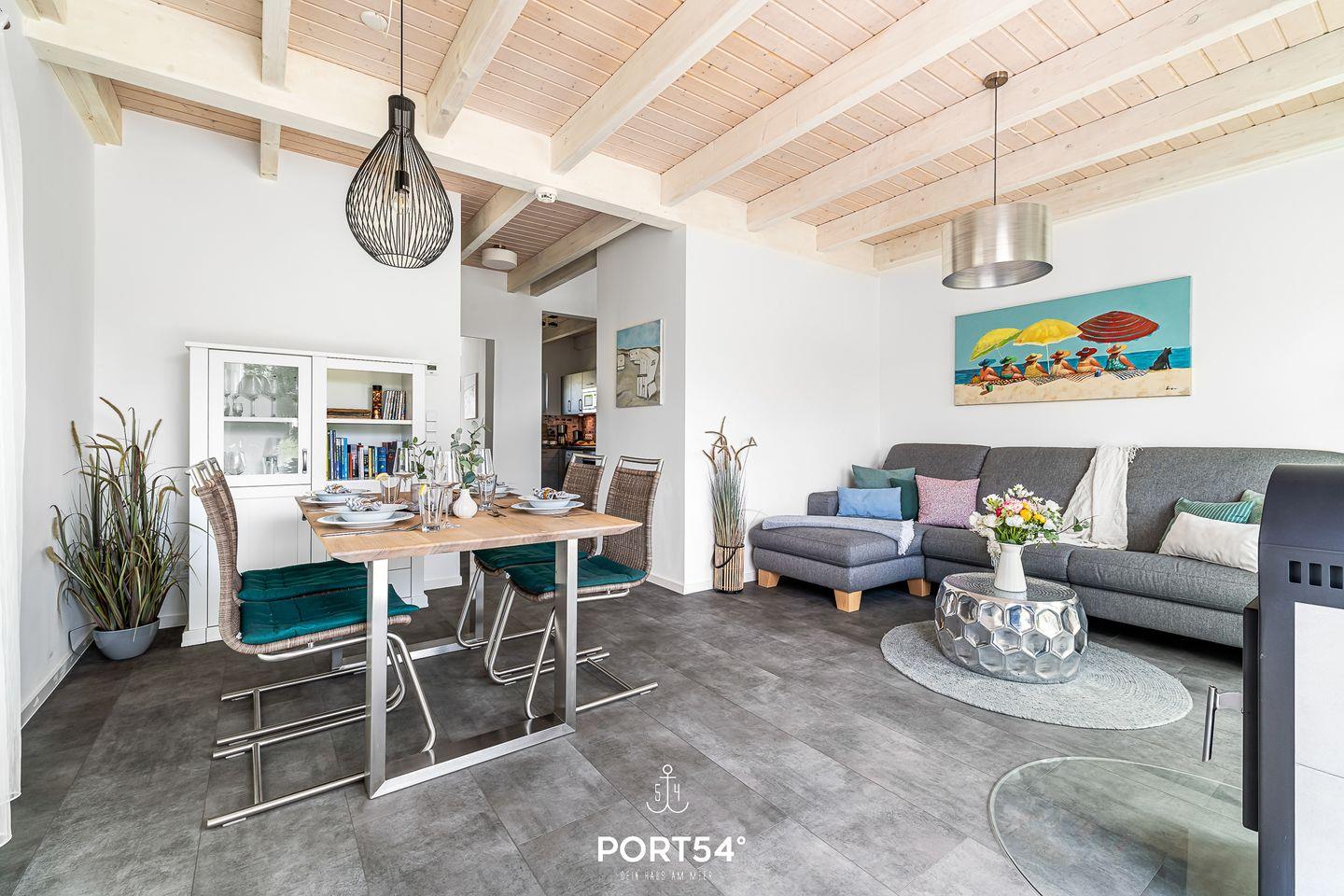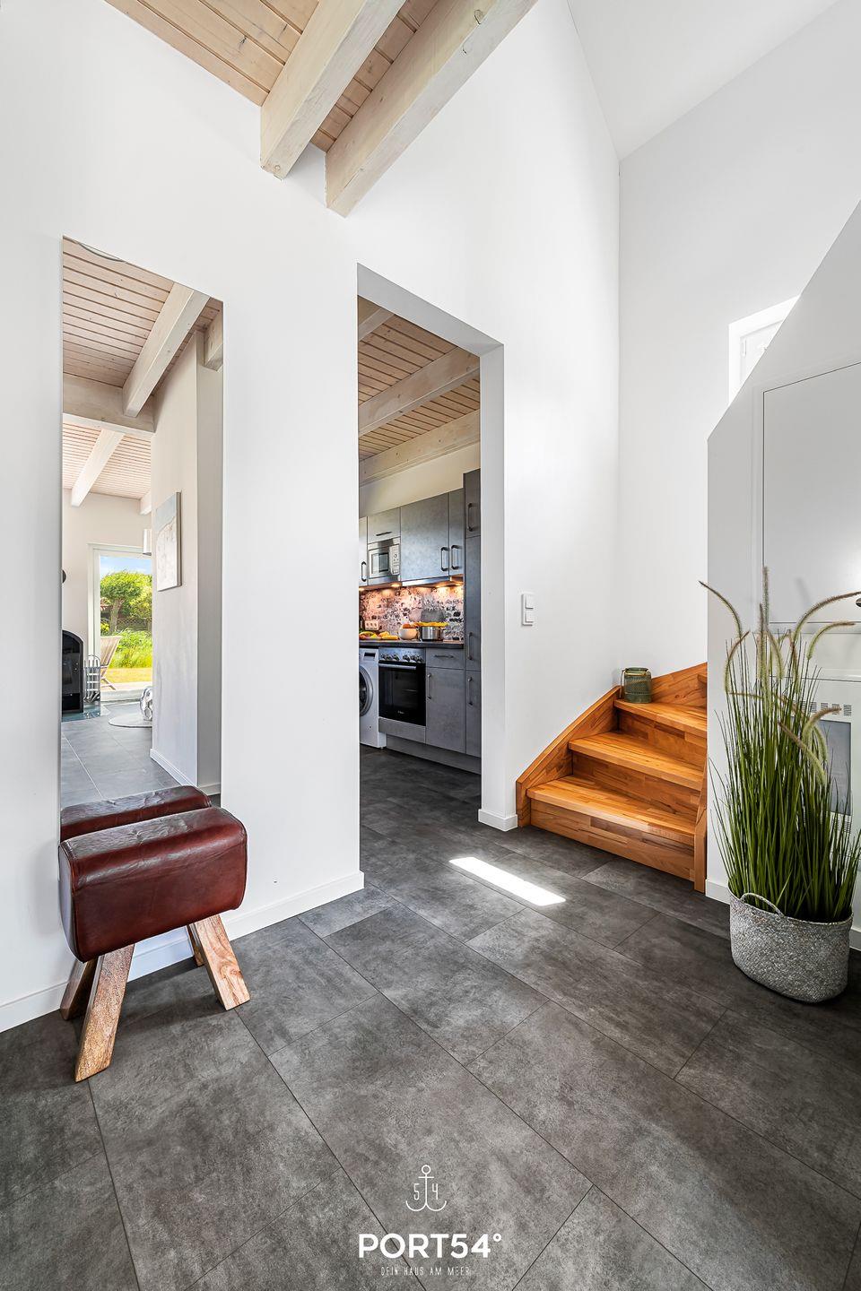 Das offen gestaltete Wohnkonzept mit einem offenen Wohn- und Essbereich und einer voll ausgestatteten Küche lädt zu gemeinsamen Aktivitäten ein. Es gibt 2 Schlafzimmer, eines mit einem Doppelbett eingerichtet und das andere Zimmer mit 2 Einzelbetten. Das Badezimmer im EG verfügt über eine Dusche & ist mit einer Infrarotsauna ausgestattet. Im oberen Badezimmer lädt eine Badewanne zum Entspannen ein. Die großzügige Terrasse lädt zu geselligen Frühstücken an der frischen Nordseeluft ein.