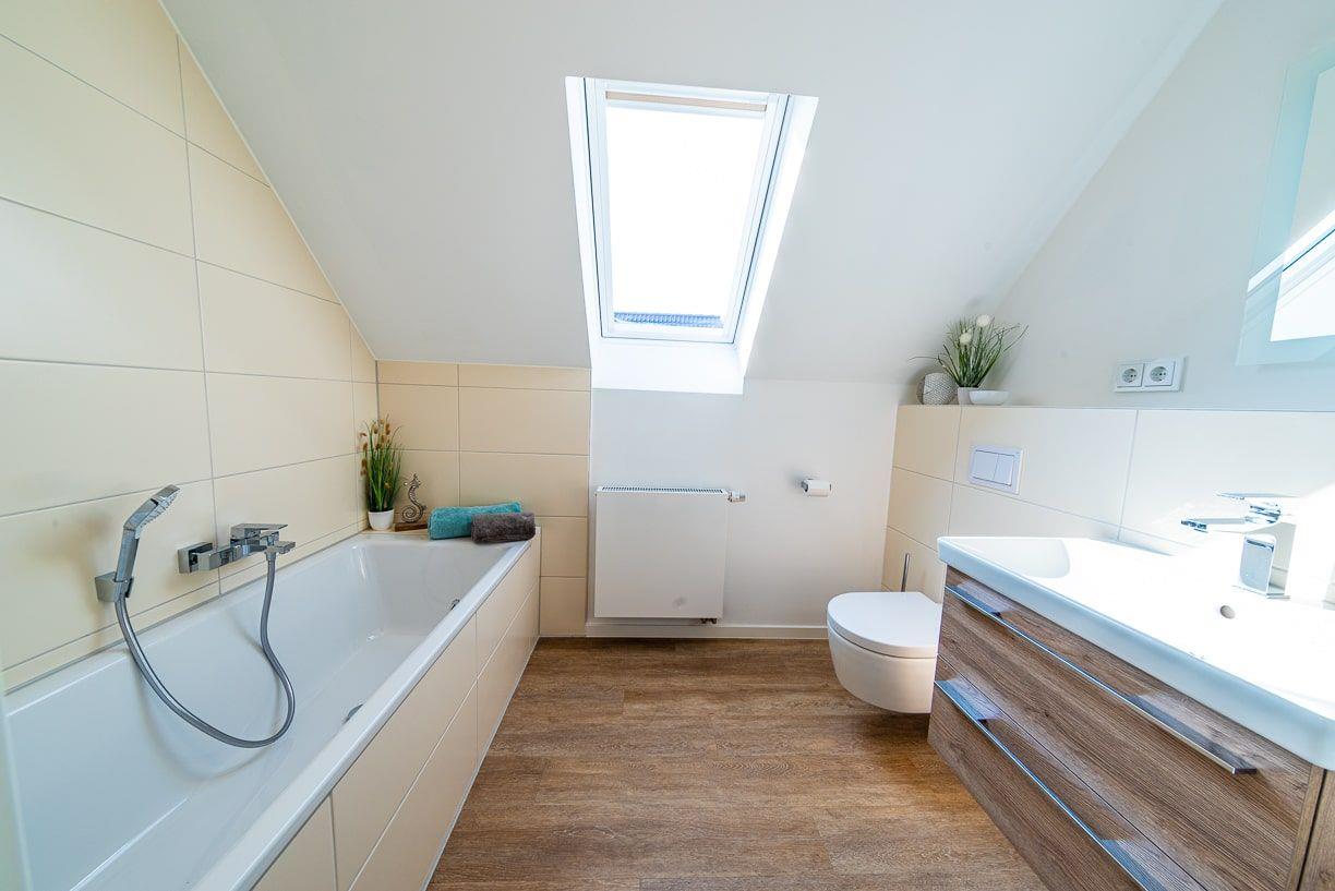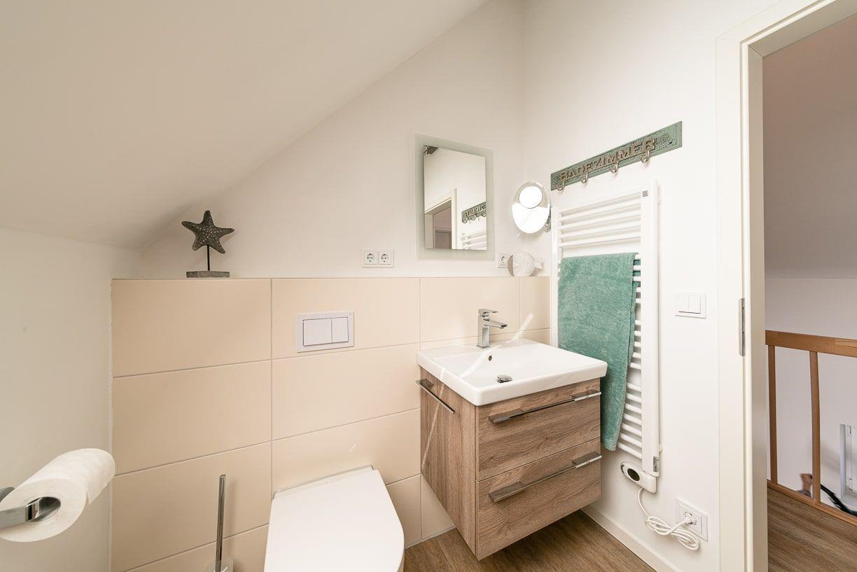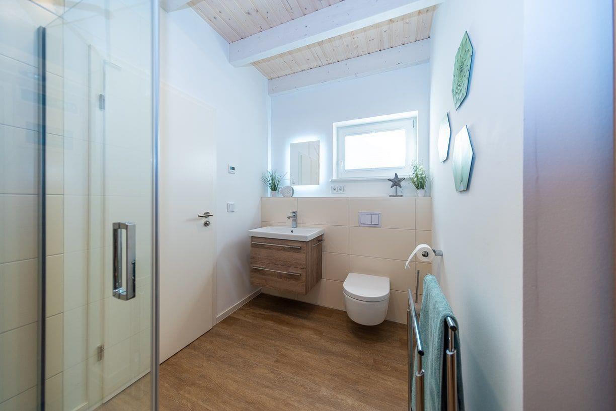 Eines der Badezimmer, das im Erdgeschoss, bietet eine Dusche sowie eine Infrarot-Sauna. In der ersten Etage befindet sich ein Vollbad mit Badewanne. Für ruhige Nächte haben wir für Euch Fliegengitter im Haus verbauen lassen.