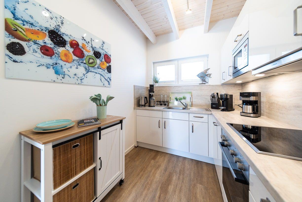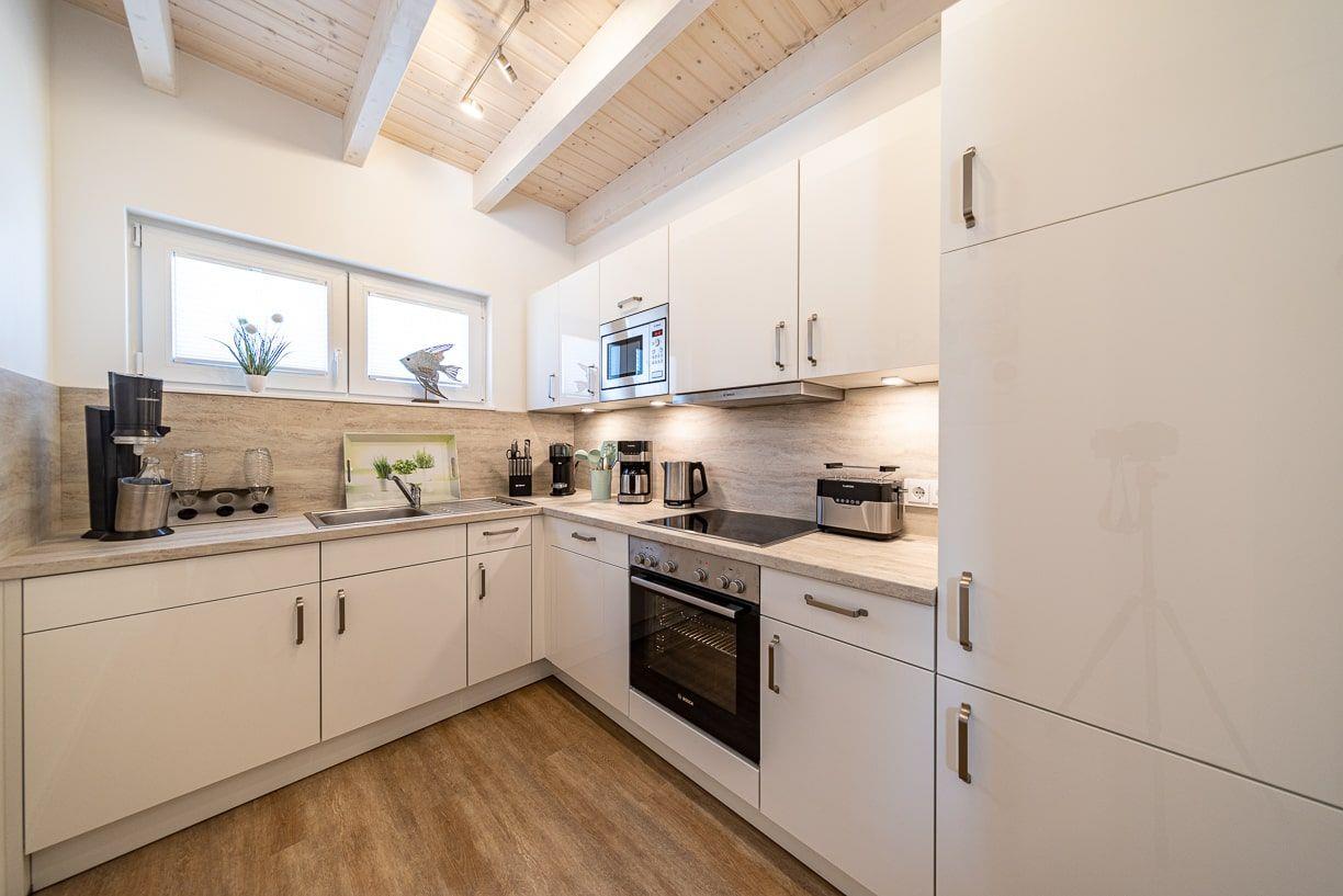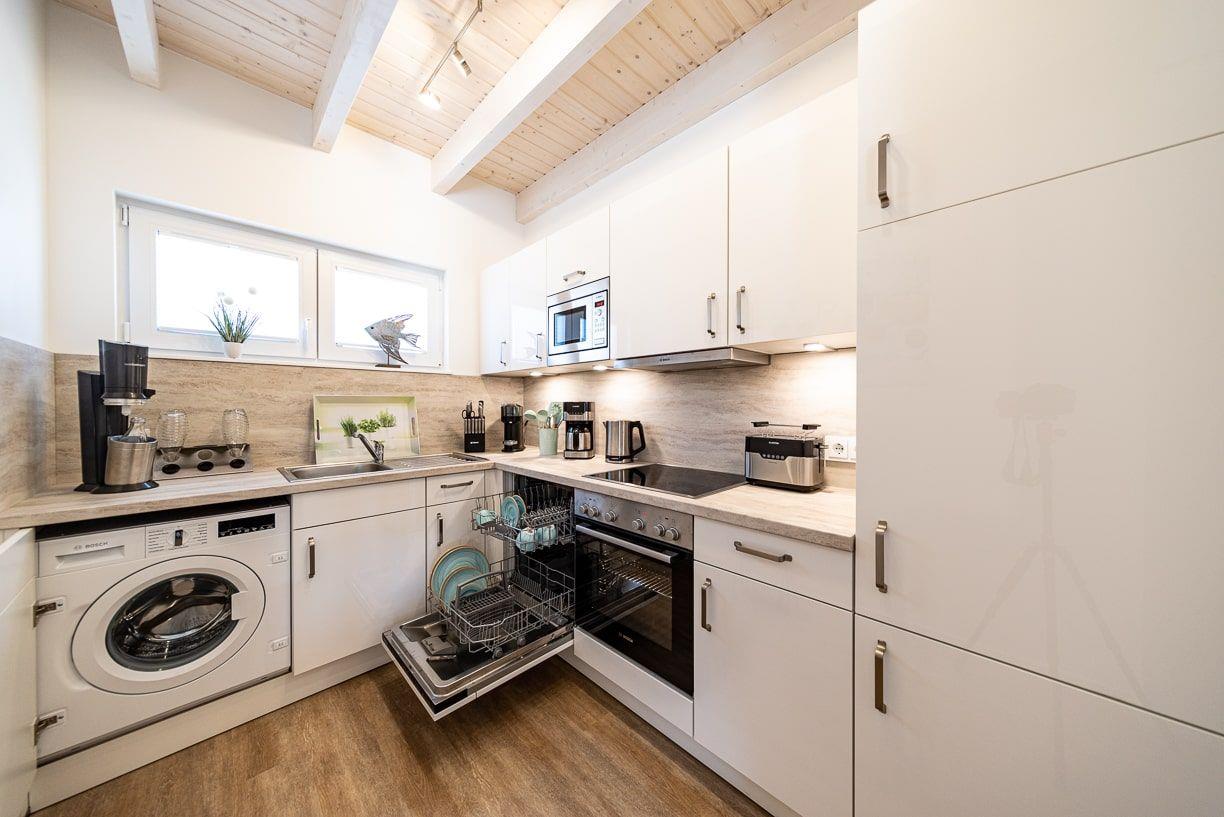 In der umfangreich ausgestatteten Küche findet Ihr neben Filterkaffee- und zwei Nespresso-Maschinen (Vertuo und Original) auch einen Wasserkocher, Toaster und eine Mikrowelle sowie einen Geschirrspüler und eine verdeckt eingebaute Waschmaschine.