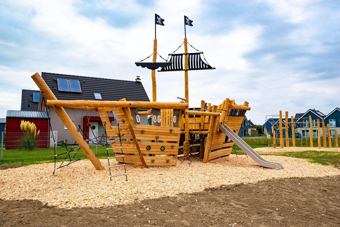 Dicht dabei, aber nicht in unmittelbarer Hörweite, liegt der neue Spielplatz mit großem Piratenschiff und vielen weiteren Spielmöglichkeiten.