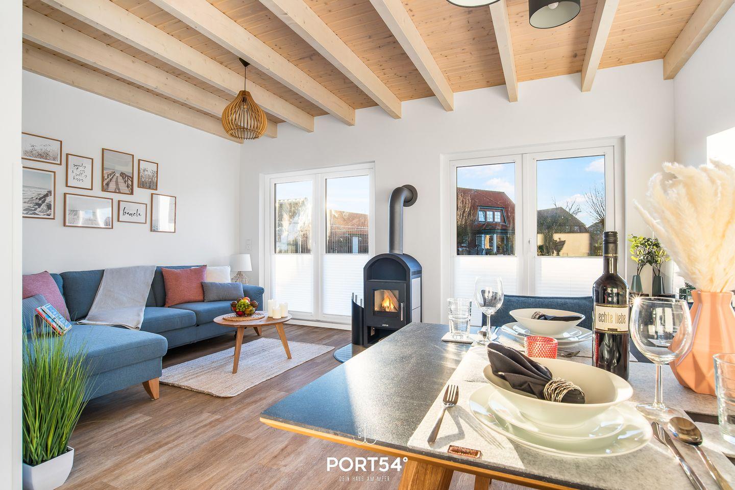 Die Nordic Lodge in Büsum bietet auf 88m² Komfort mit Kamin, Terrasse und Nordseenähe für unvergessliche Urlaubstage.