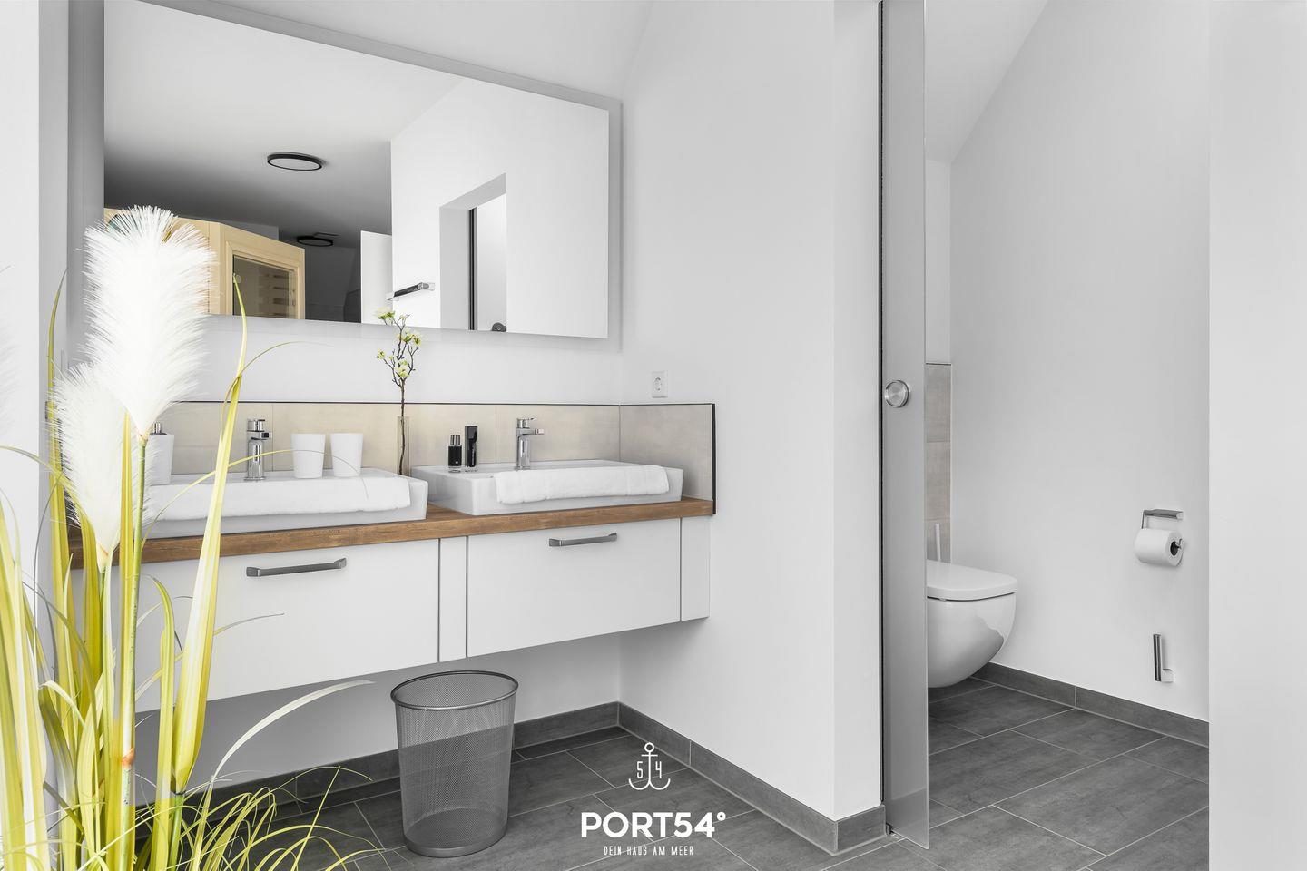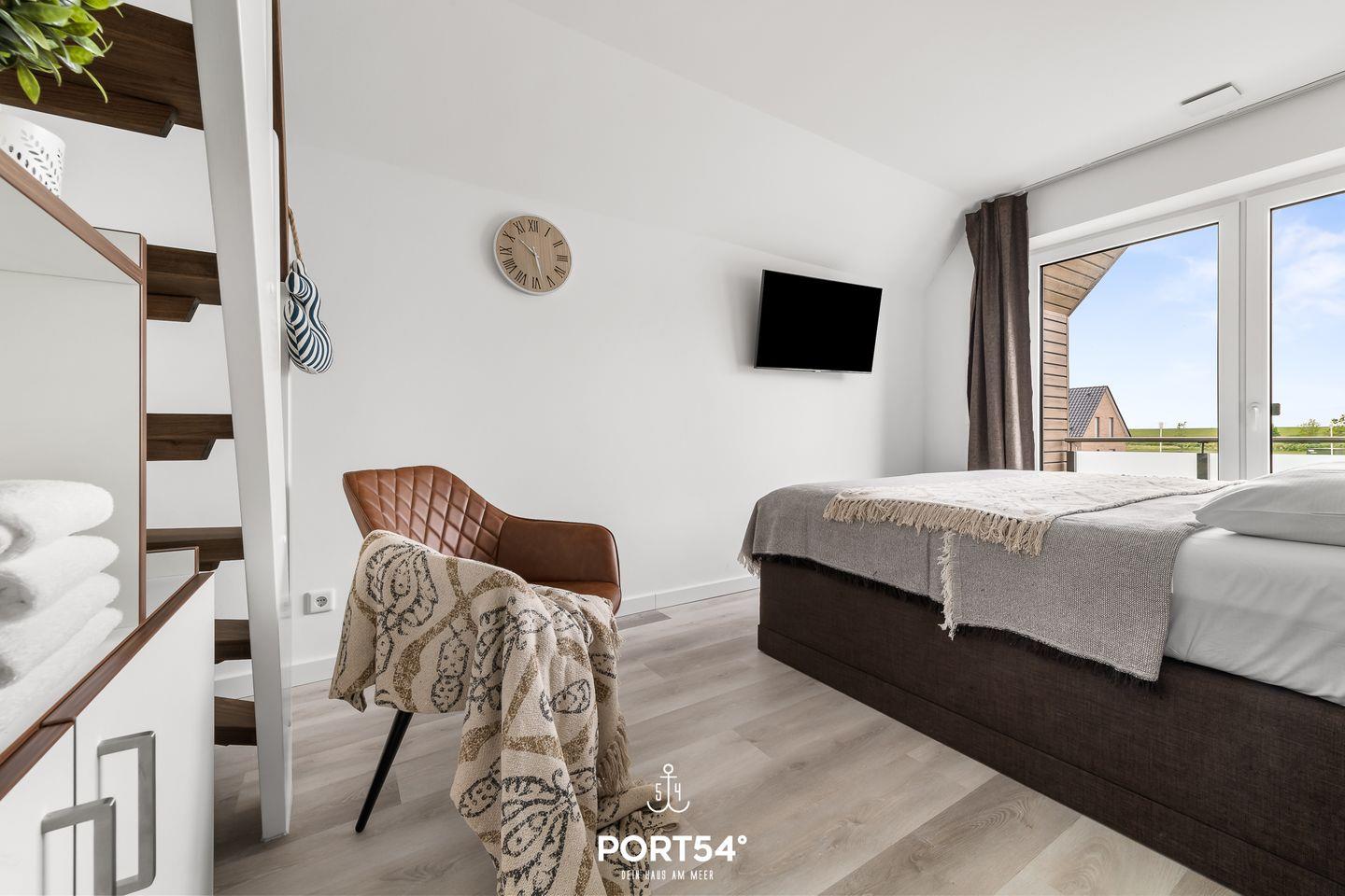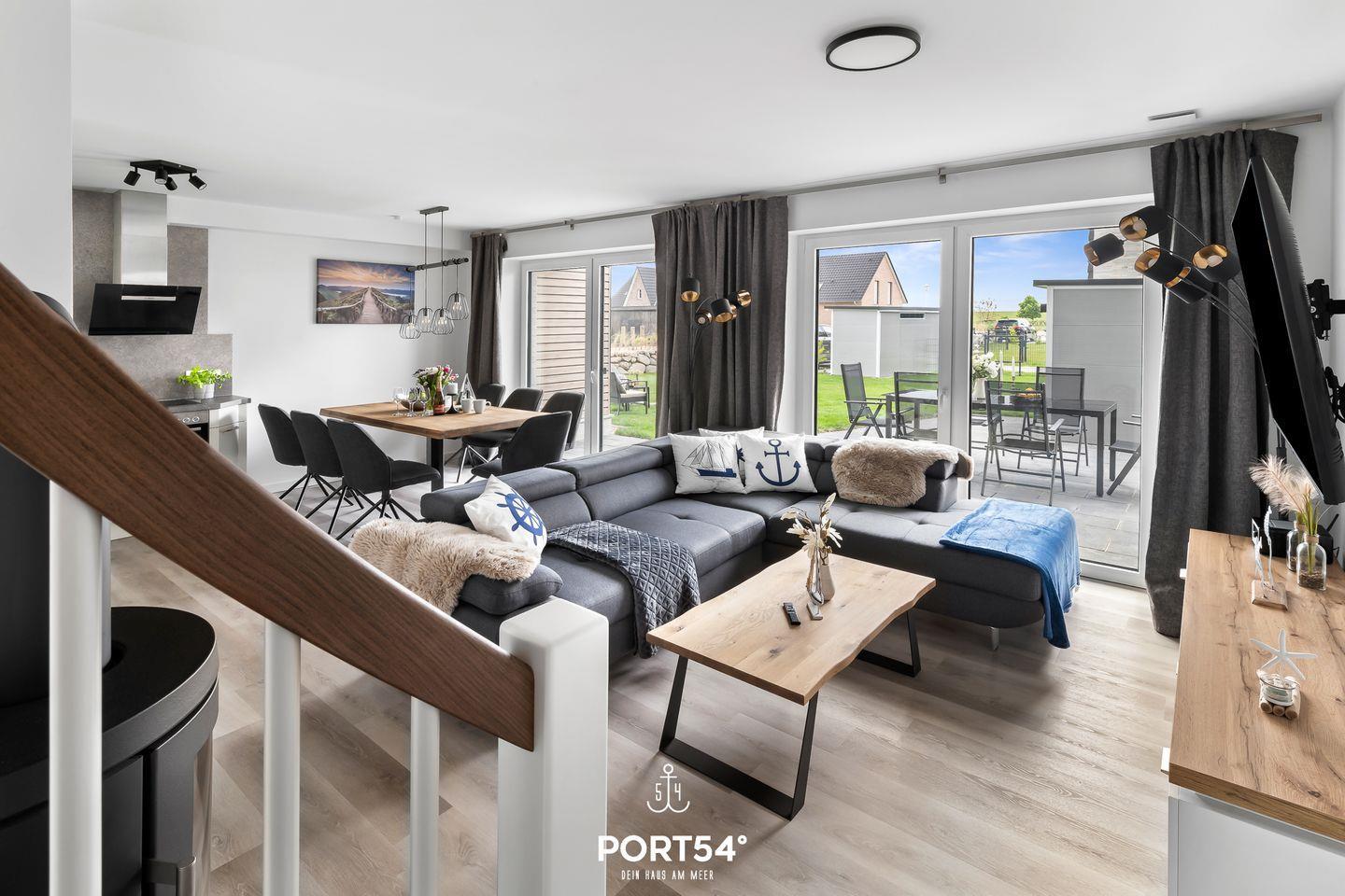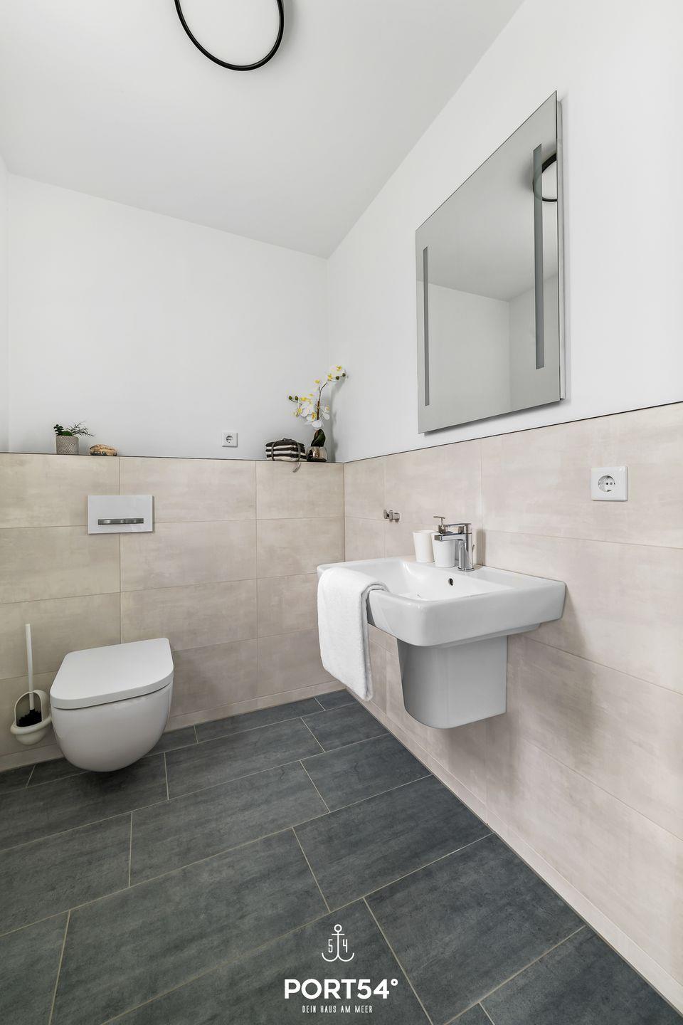 Das Ferienhaus "Die Perle der Bucht", unweit der Nordsee gelegen, bietet auf zwei Etagen und über 126m² Platz für bis zu 6 Personen. Im Erdgeschoss bietet das moderne Ferienhaus einen offenen Wohn- und Essbereich mit angrenzender Küche, ein Schlafzimmer, sowie ein Gäste-WC mit Toilette und Waschbecken. An Schmuddeltagen können Sie es sich vor dem Kamin gemütlich machen und einen Filmabend veranstalten. Der lichtdurchflutete Wohnbereich ist mit einem Sofa ausgestattet, das zu einer Schlafcouch ausgezogen werden kann und noch zwei weitere Schlafplätze bietet. Das Schlafzimmer verfügt über ein Einzelbett (90x200cm) mit ausziehbarem Bettkasten (max. 70 kg), einen Flachbild-TV und Verdunkelungsmöglichkeiten. Das Obergeschoss teilt sich in zwei Schlafzimmer und ein Badezimmer mit ebenerdiger Dusche, Handtuchtrockner sowie WC und Waschbecken auf. Nach langen Strandspaziergängen bietet die finnische Sauna den perfekten Rückzugsort für entspannte Stunden. Beide Schlafzimmer im Obergeschoss sind mit Doppelbetten (180x200cm) eingerichtet. Auch hier sind die Fenster vollverdunkelbar und beide Zimmer verfügen über Flachbild-TV´s.