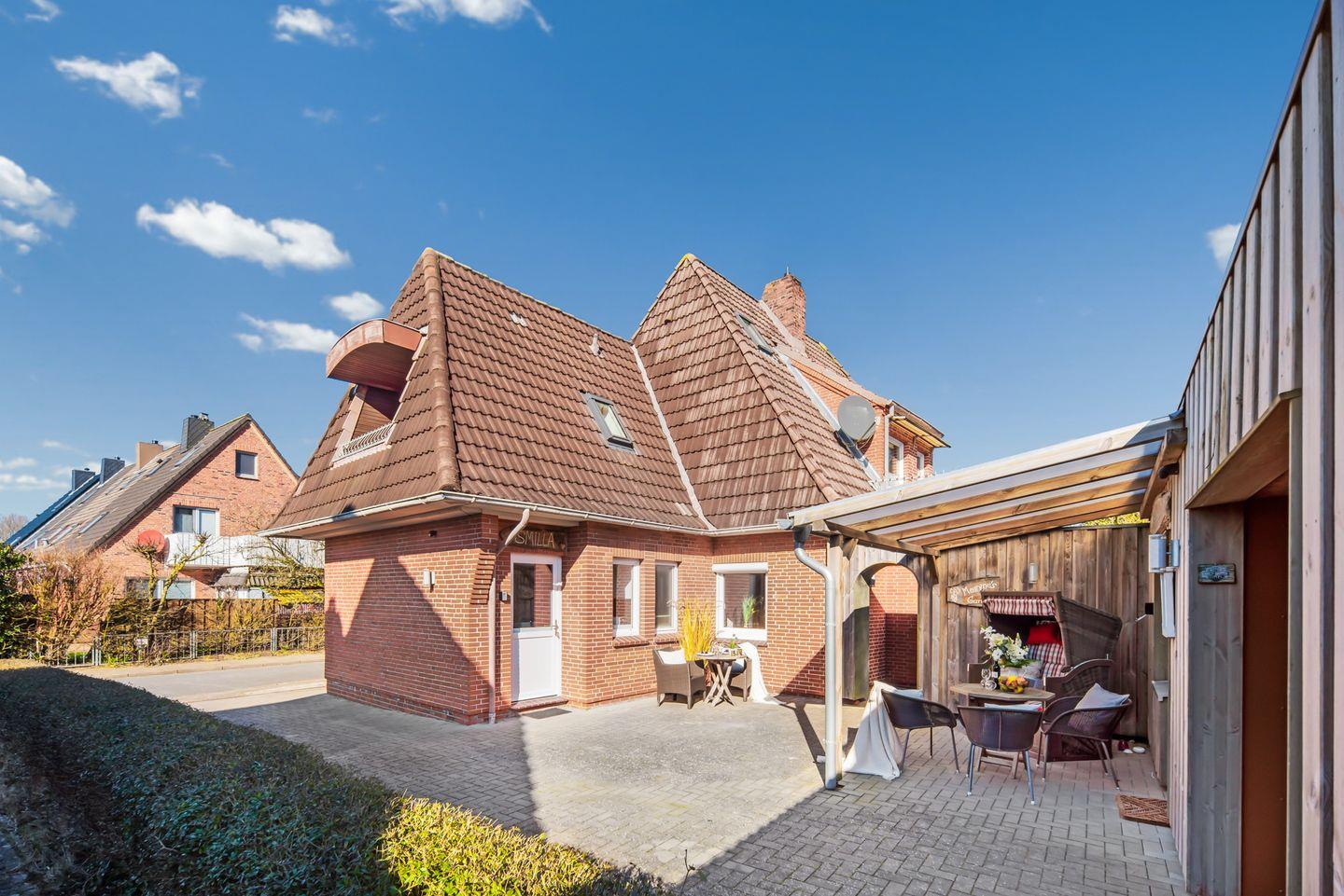 Das Ferienhaus "Dit hygge hus" liegt ruhig in zentraler Lage in Büsum auf einem eingewachsenen Grundstück. Vor der EG Wohnung liegt eine kleine Terrasse mit Tisch und Stühlen. Die Familienlagune an der Nordsee, sowie die Büsumer