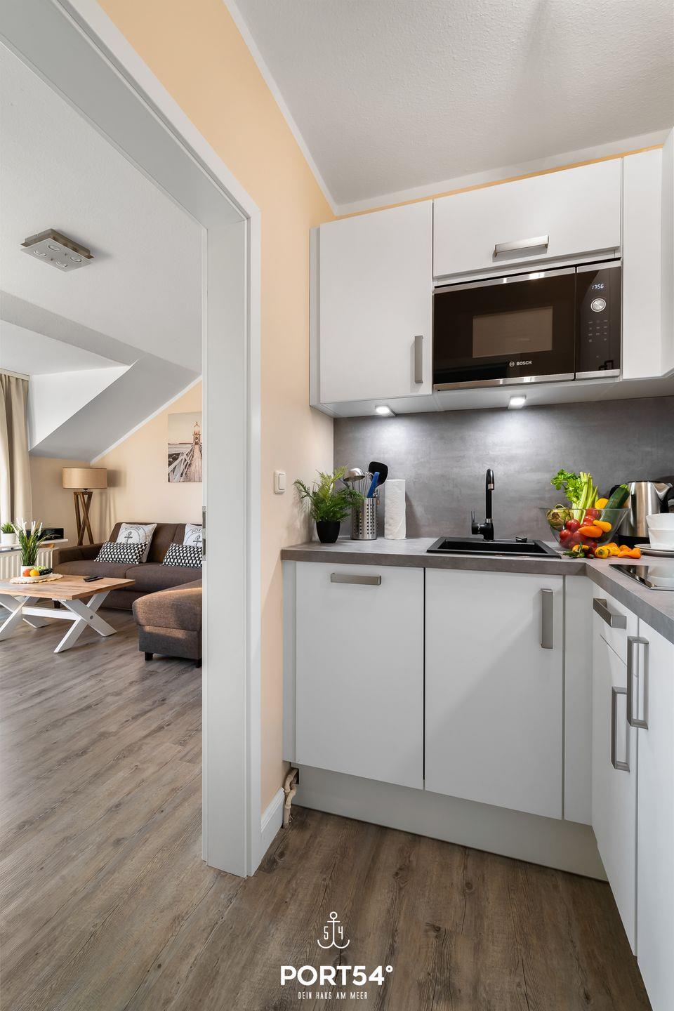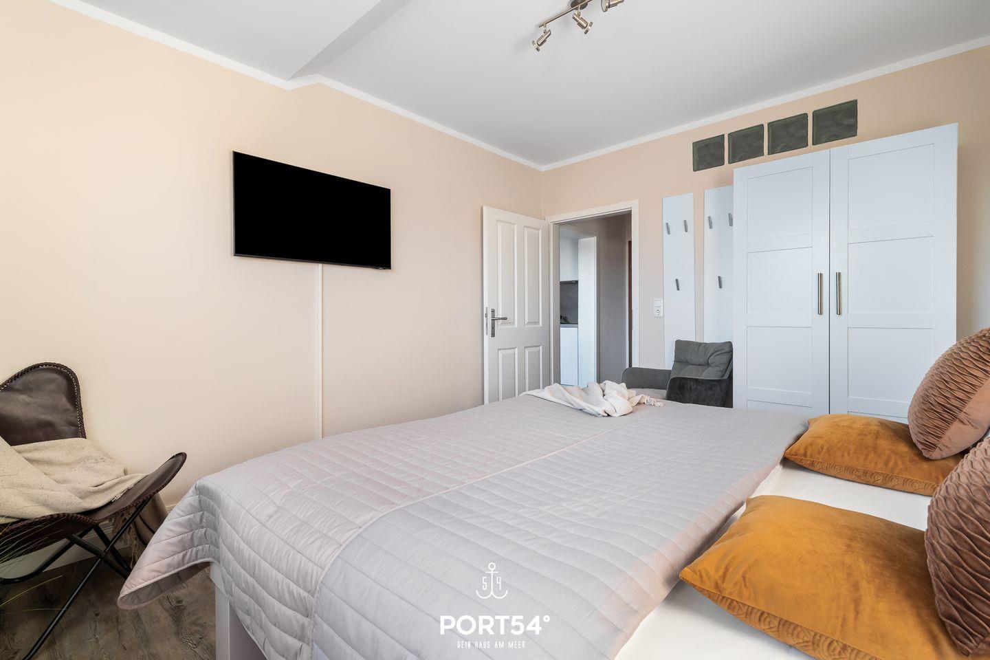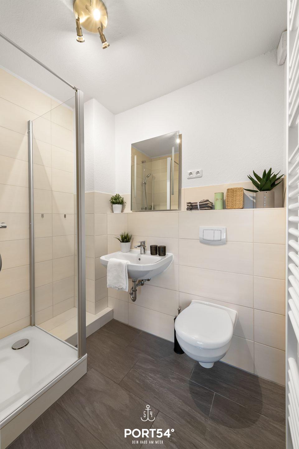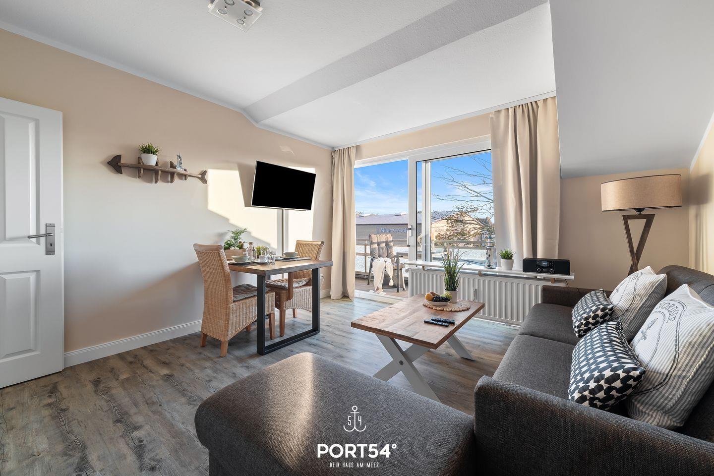 Die Ferienwohnung "Deck 8" befindet sich im 2. Obergeschoss und bietet Platz für bis zu 3 Personen. Die 44m² erstrecken sich über einen Wohn-/Essbereich mit angrenzender Küche. Hier steht Ihnen ein Schlafsofa und Flatscreen-TV mit verschiedenen Streaming-Zugängen zur Verfügung. Das Schlafzimmer bietet ein Doppelbett und ebenfalls einen Flatscreen-TV. Ein Badezimmer mit Dusche ist direkt an das Schlafzimmer angeschlossen. In dem zweiten Badezimmer finden Sie neben Waschbecken und WC eine Dusche, Föhn und einen Handtuchwärmer. Für die kleinsten Gäste steht ein Hochstuhl sowie ein Reisebett zur Verfügung.