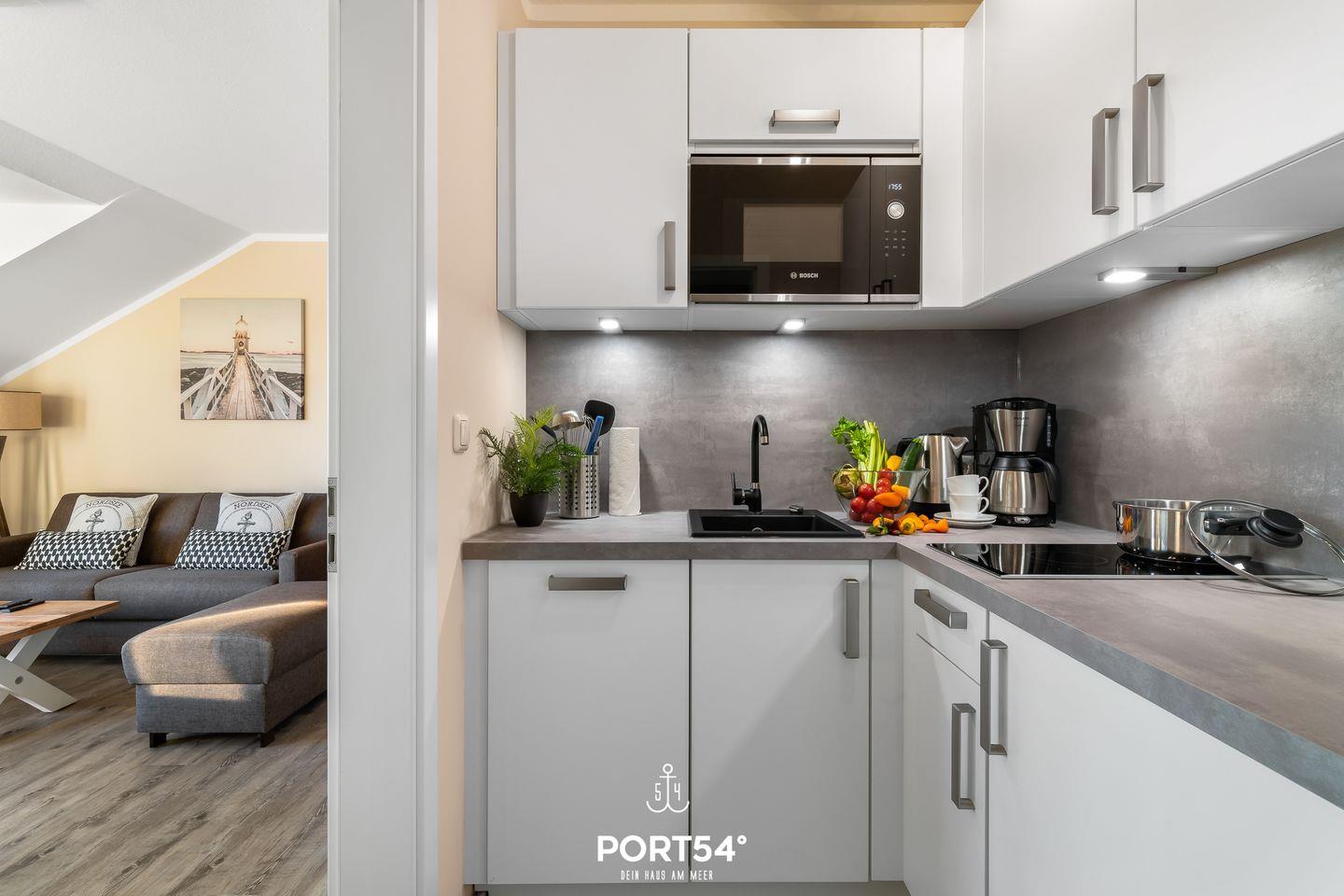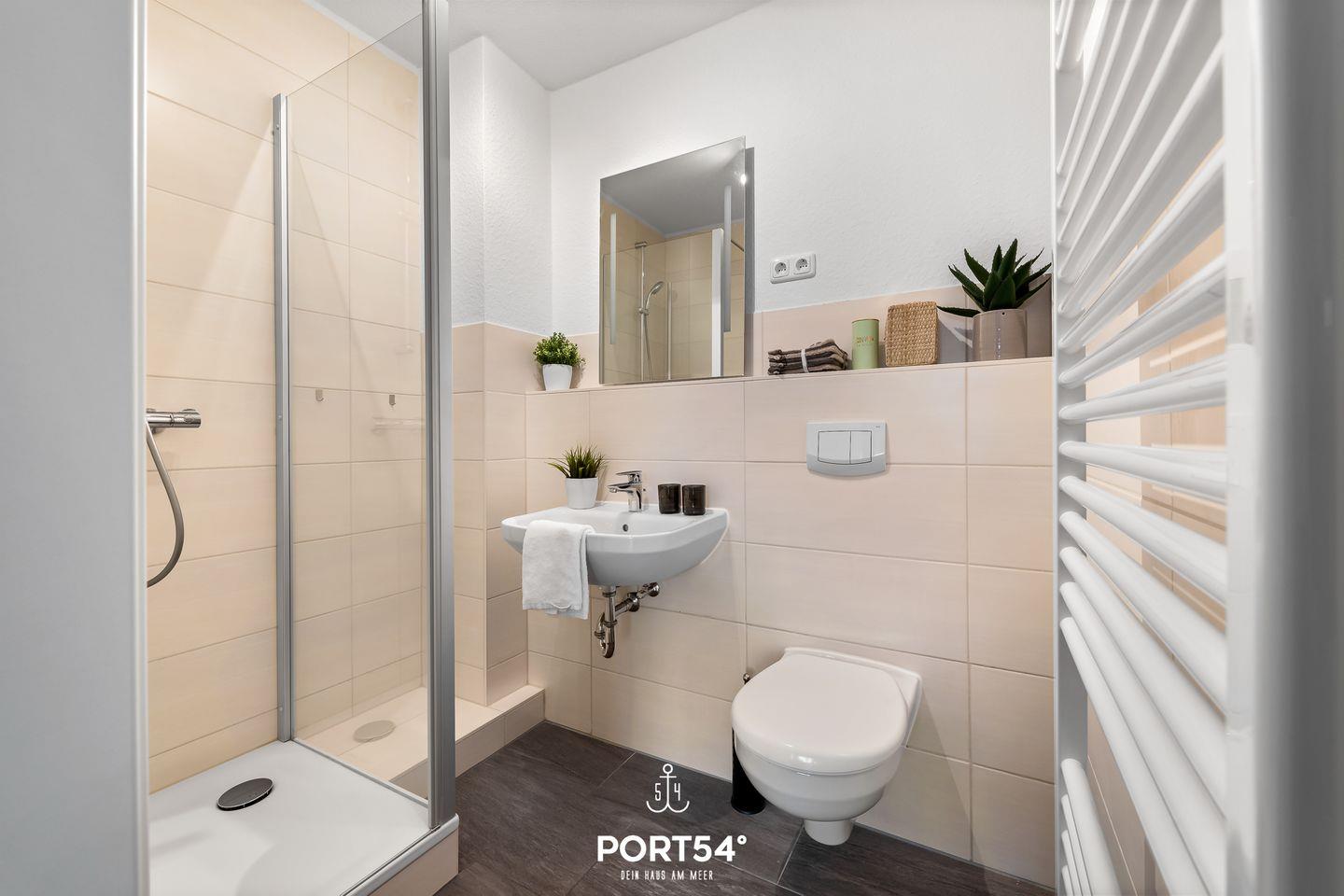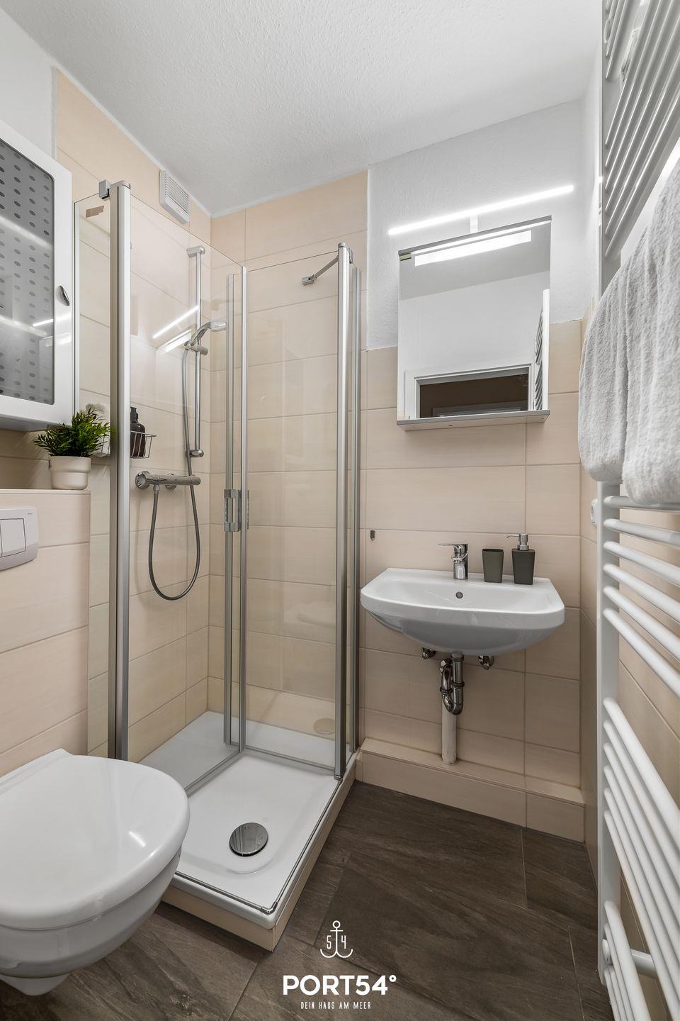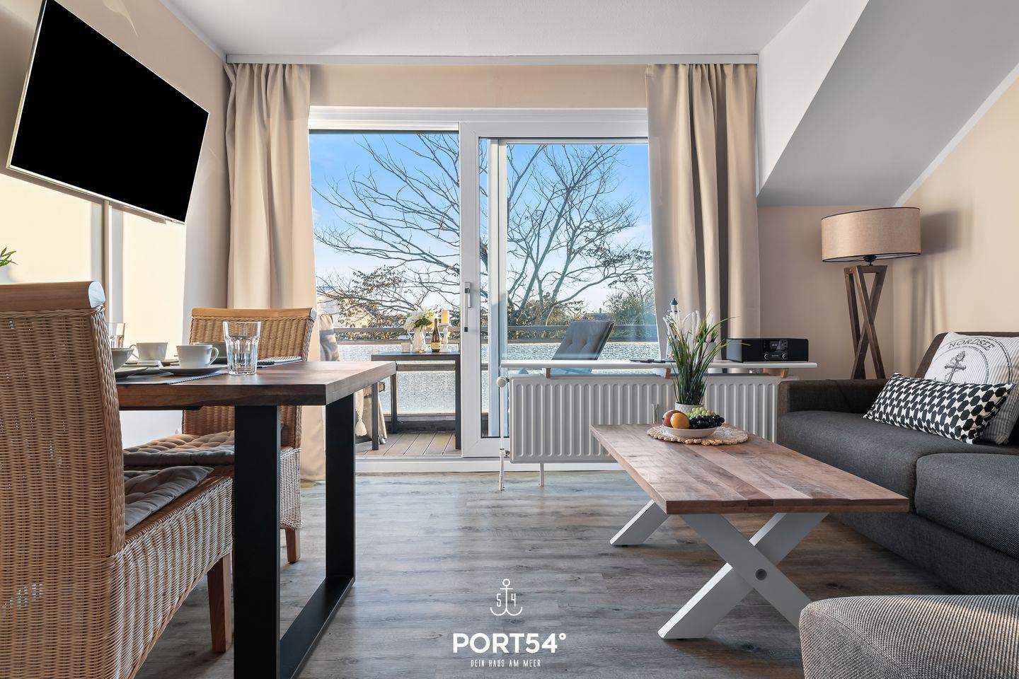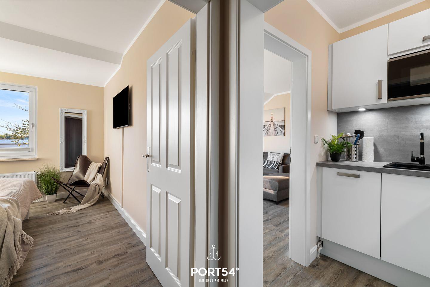 Die Ferienwohnung "Deck 8" befindet sich im 2. Obergeschoss und bietet Platz für bis zu 3 Personen. Die 44m² erstrecken sich über einen Wohn-/Essbereich mit angrenzender Küche. Hier steht Ihnen ein Schlafsofa und Flatscreen-TV mit verschiedenen Streaming-Zugängen zur Verfügung. Das Schlafzimmer bietet ein Doppelbett und ebenfalls einen Flatscreen-TV. Ein Badezimmer mit Dusche ist direkt an das Schlafzimmer angeschlossen. In dem zweiten Badezimmer finden Sie neben Waschbecken und WC eine Dusche, Föhn und einen Handtuchwärmer. Für die kleinsten Gäste steht ein Hochstuhl sowie ein Reisebett zur Verfügung.