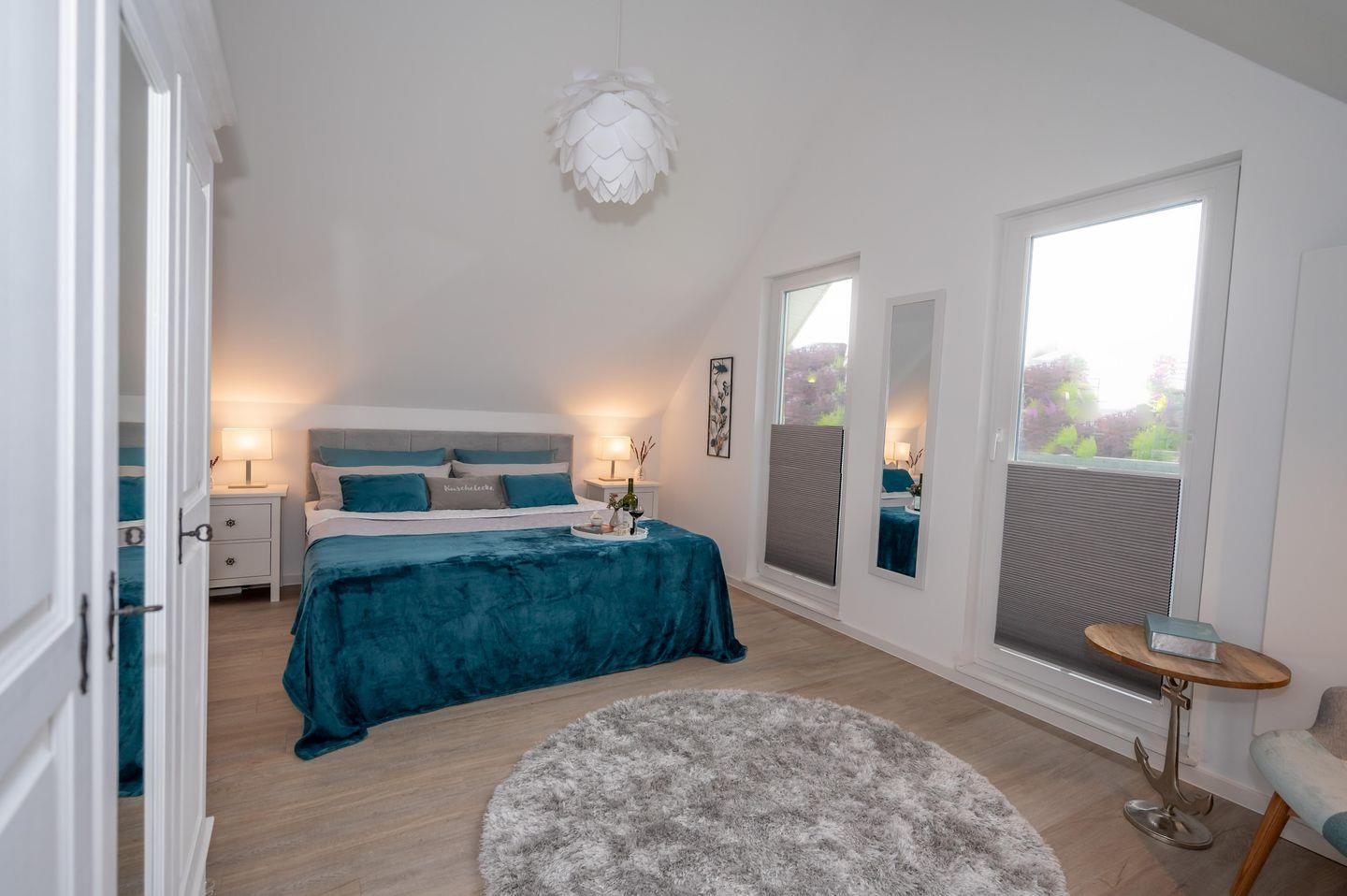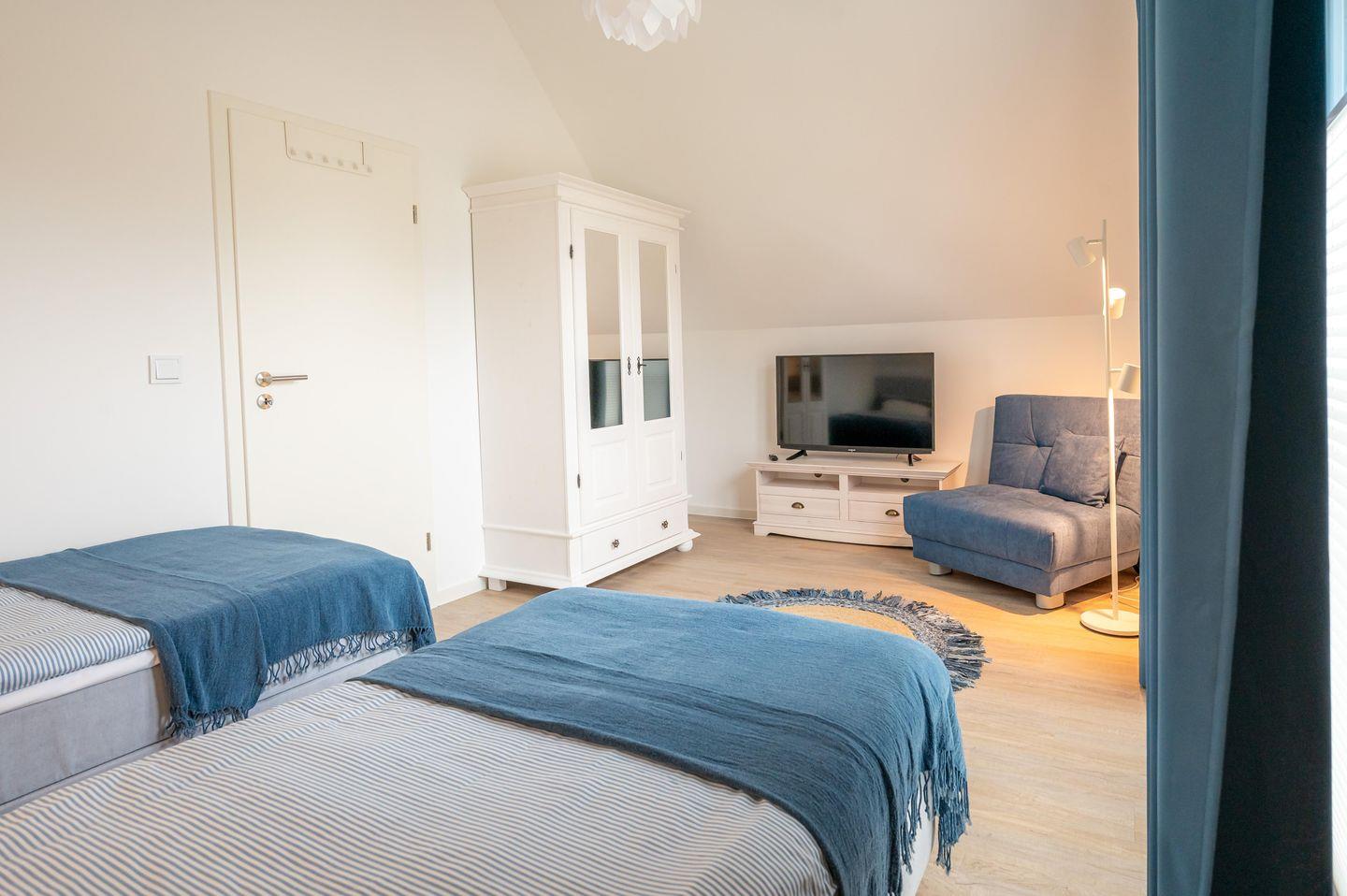 Das Ferienhaus "Marschengrün" bietet auf 88m² über zwei Etagen Platz für bis zu 5 Personen. Es erwartet Sie ein Ferienhaus mit zwei Schlafzimmer, einem offenen Wohn- und Essbereich mit angrenzender, vollausgestatteter Küche, sowie zwei Badezimmern. Eines der beiden Schlafzimmer verfügt über ein gemütliches Doppelbett (180x200cm), das andere über zwei Einzelbetten (je 90x200cm) und zusätzlich steht ein ausziehbarer Schlafsessel zur Verfügung. Beide Schlafzimmer sind komplett verdunkelbar, zusätzlich mit Mückengitter ausgestattet und verfügen zudem über einen Flachbild-TV. Auf der gemütlichen Schlafcouch im Wohnzimmer findet zusätzlich 1 Person einen Ausweichschlafplatz. Im Badezimmer im Erdgeschoss können Sie es sich in der Infrarot-Sauna gemütlich machen. Das Badezimmer im Obergeschoss lädt mit einer Badewanne zum Verweilen ein. Genießen Sie Ihren Nordseeurlaub auf der möblierten Terrasse - ein Holzkohlegrill lädt zu entspannten Grillabenden ein. Ein Parkplatz und ein abschließbarer Fahrradschuppen bieten Platz für Ihr Auto und mitgebrachte bzw. ausgeliehene Fahrräder. Sollten Sie Ihren Nordseeurlaub mit der ganzen Familie und Freunden verbringen wollen, können wir Ihnen durch die Verwaltung mehrerer Objekte auch eine Symbiose aus 2 nebeneinander liegenden Ferienunterkünften ermöglichen.