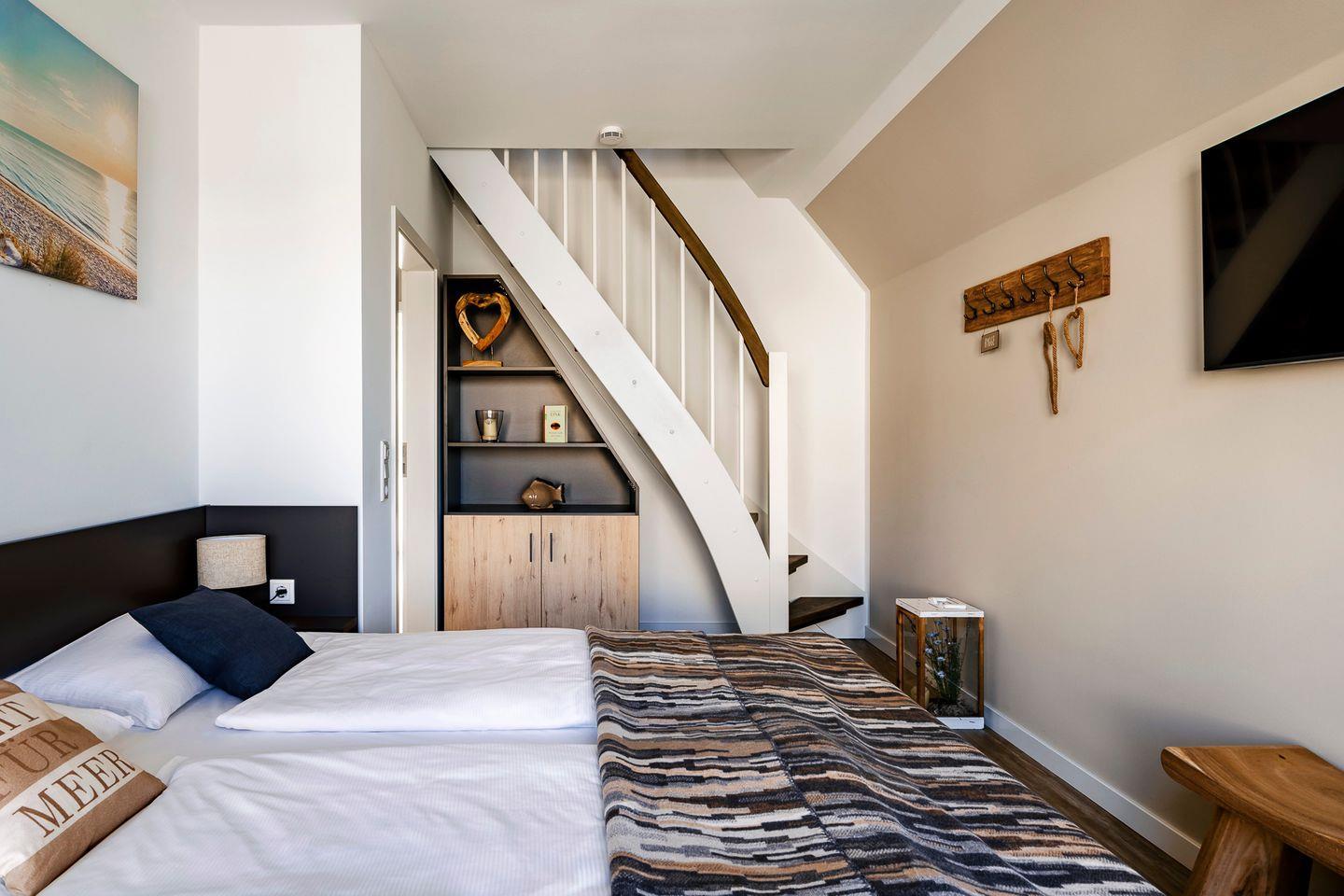Über zwei Etagen bietet das Ferienhaus auf etwa 120m² neben drei Schlafzimmern auch zwei Badezimmer, einen großen, lichtdurchfluteten Wohn- und Essbereich mit offener Küche, eine Terrasse und eine Loggia im Obergeschoss. Ein Stellplatz ist vorhanden.