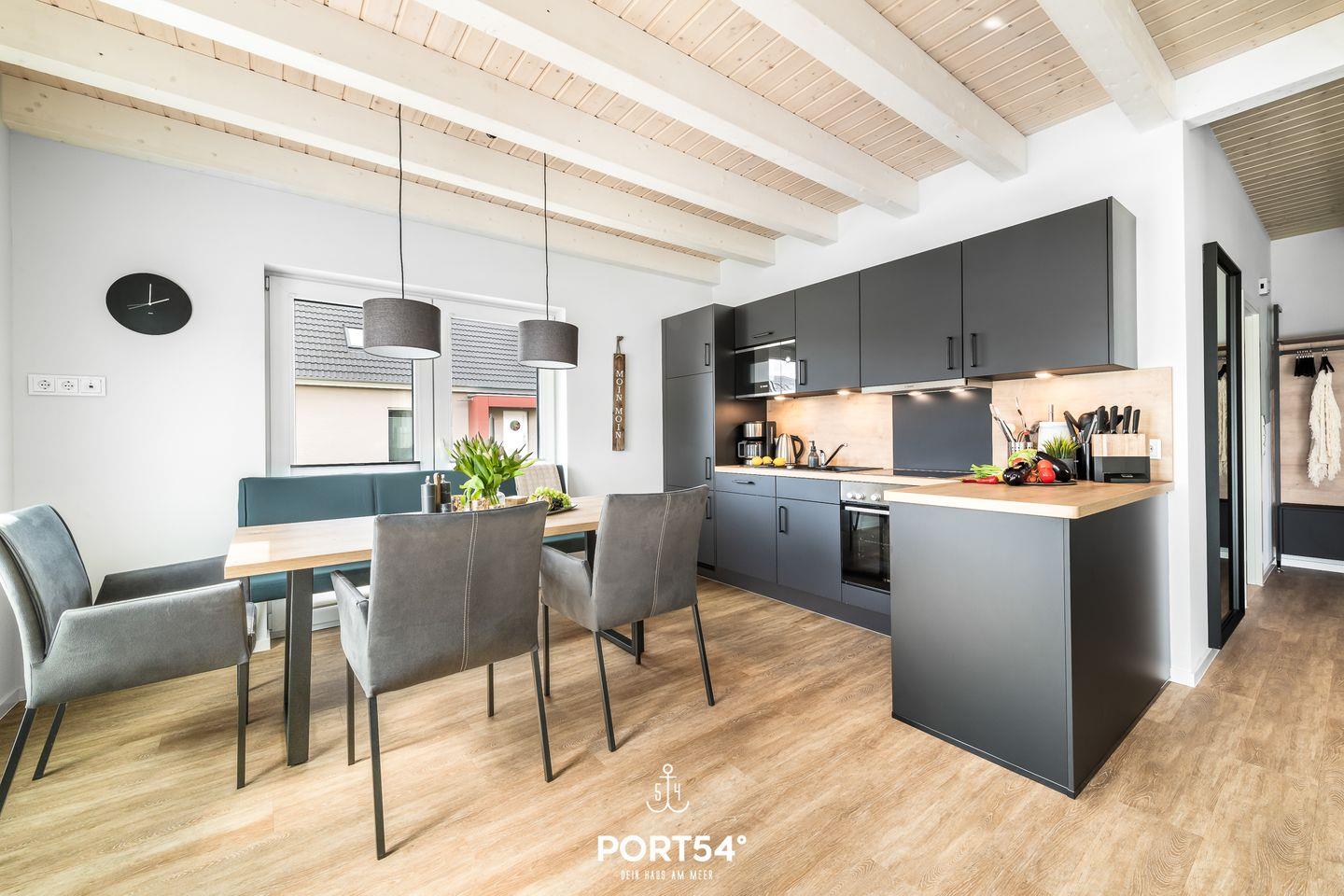 Auf 2 Etagen befinden sich insgesamt 3 Schlafzimmer, 2 Bäder, sowie eine offene Küche mit angrenzendem Wohn- und Essbereich und Kaminofen. Die Schlafzimmer sind mit 2 Doppelbetten und 2 Einzelbetten ausgestattet. Das Duschbad im EG bietet eine finnische Sauna, im OG finden Sie ein Wannenbad. Die Terrasse ist vollmöbliert und mit einem Grill ausgestattet. Vor dem Haus befindet sich 2 PKW-Stellplätze und ein abschließbarer Fahrradschuppen.