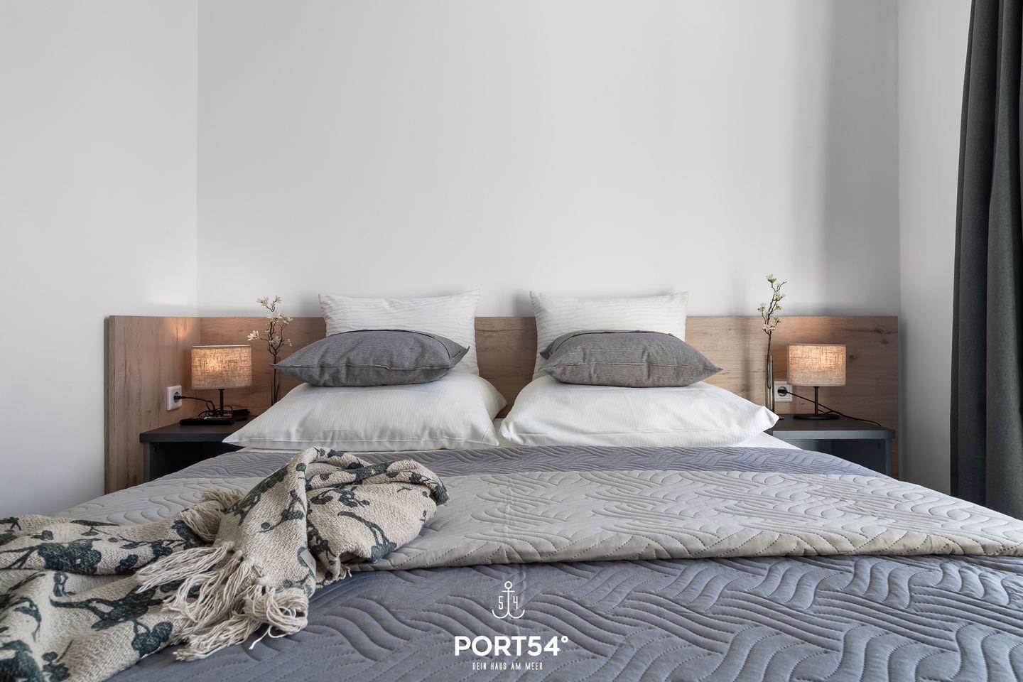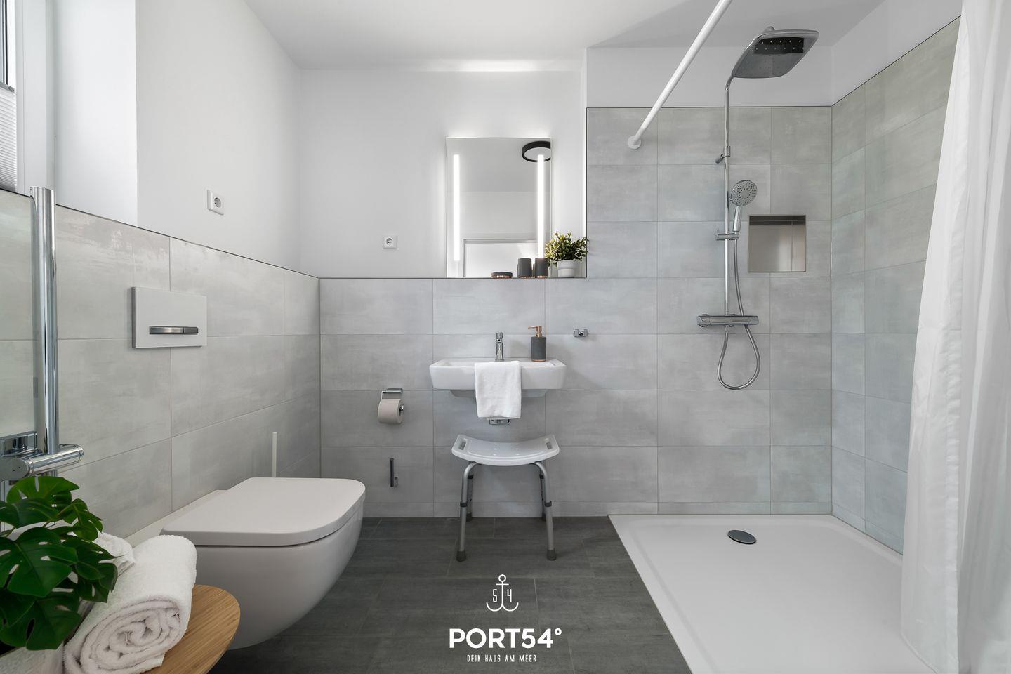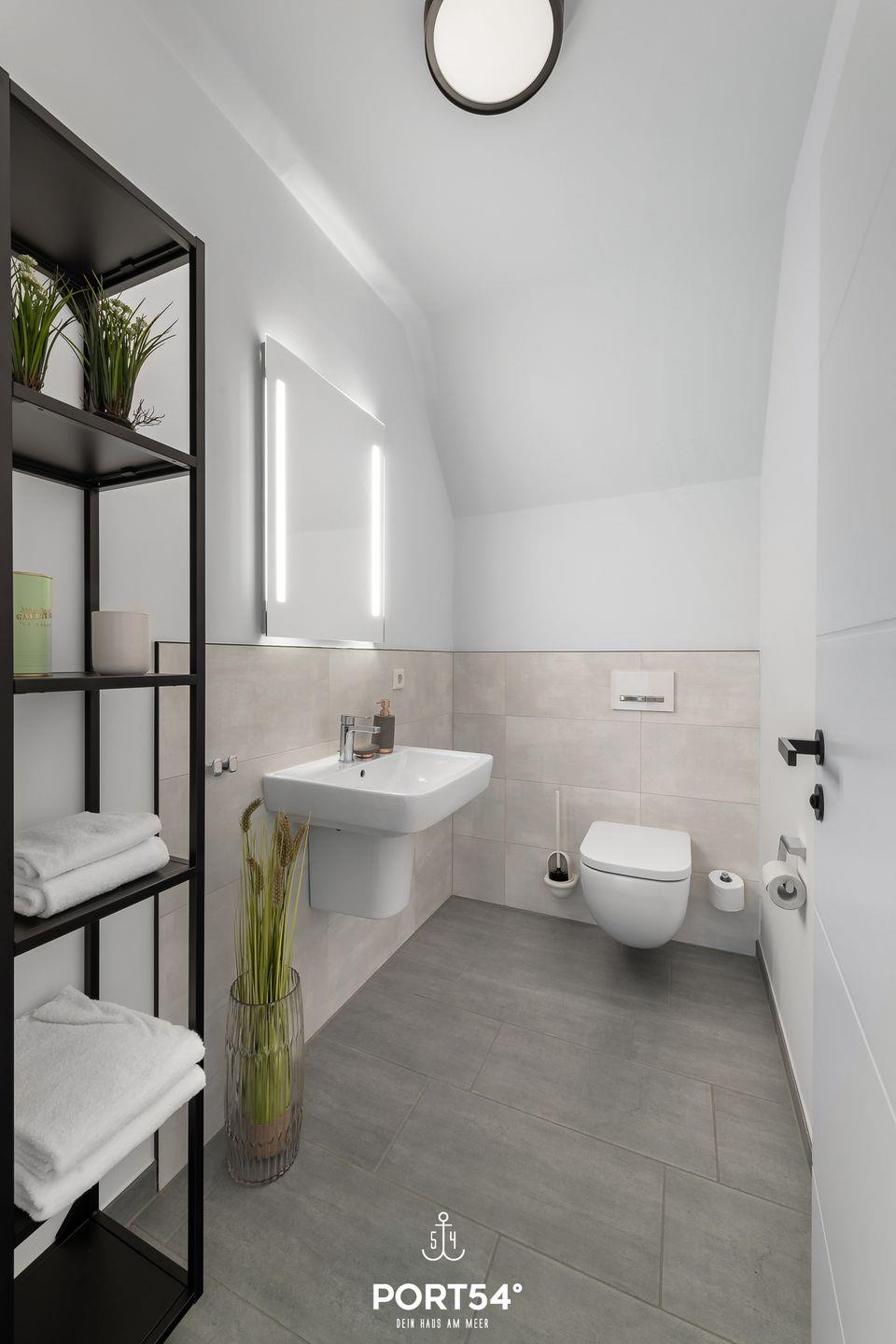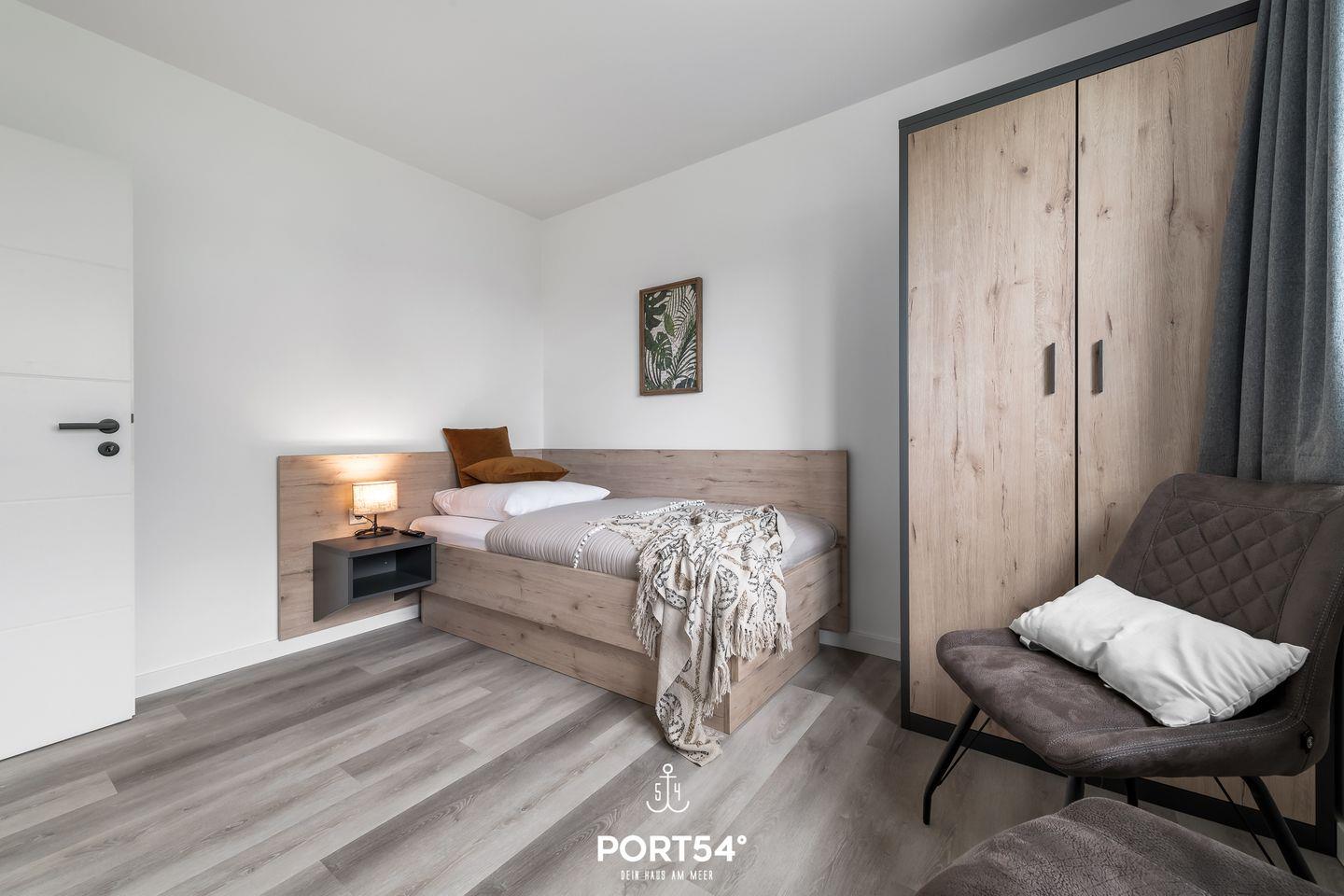 Das im Erdgeschoss gelegene Schlafzimmer verfügt über ein Einzelbett, welches sich in der Höhe verstellen lässt. Ebenfalls kann eine Absturzsicherung mit genutzt werden. Zusätzlich steht bei Bedarf ein Zustellbett für eine weitere Schlafmöglichkeit zu Verfügung. Außerdem ist das Zimmer mit einem Flachbild-TV ausgestattet. Die im Obergeschoss gelegenen Schlafzimmer bieten zwei Doppelbetten (160x200cm) & (180x200cm), beide verfügen ebenfalls über einen Flachbild-TV. Das Duschbad im Obergeschoss überzeugt durch eine Finnische Sauna, eine Badewanne sowie eine große Dusche und ein separates WC. In der finnischen Sauna können Sie nach langen Spaziergängen herrlich entspannen und die Seele baumeln lassen. Im Badezimmer im Erdgeschoss bietet eine zweite Dusche eine durchdachte räumliche Trennung zum unteren Schlafzimmer.
