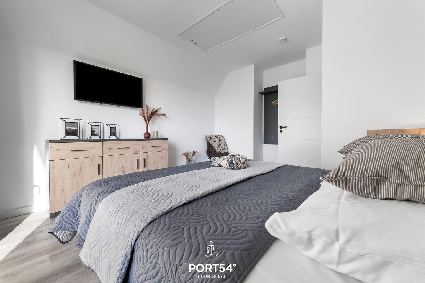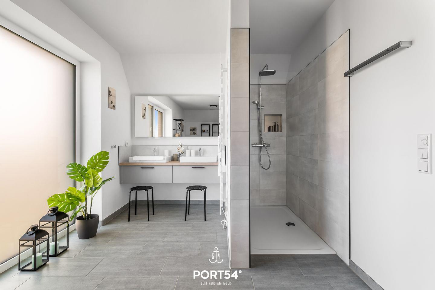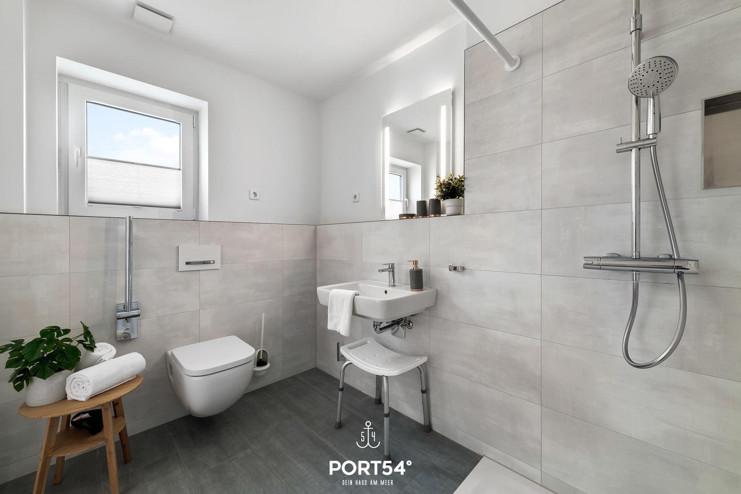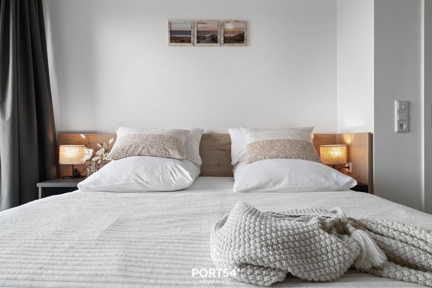 Das im Erdgeschoss gelegene Schlafzimmer verfügt über ein Einzelbett, welches sich in der Höhe verstellen lässt. Ebenfalls kann eine Absturzsicherung mit genutzt werden. Zusätzlich steht bei Bedarf ein Zustellbett für eine weitere Schlafmöglichkeit zu Verfügung. Außerdem ist das Zimmer mit einem Flachbild-TV ausgestattet. Die im Obergeschoss gelegenen Schlafzimmer bieten zwei Doppelbetten (160x200cm) & (180x200cm), beide verfügen ebenfalls über einen Flachbild-TV. Das Duschbad im Obergeschoss überzeugt durch eine Finnische Sauna, eine Badewanne sowie eine große Dusche und ein separates WC. In der finnischen Sauna können Sie nach langen Spaziergängen herrlich entspannen und die Seele baumeln lassen. Im Badezimmer im Erdgeschoss bietet eine zweite Dusche eine durchdachte räumliche Trennung zum unteren Schlafzimmer.