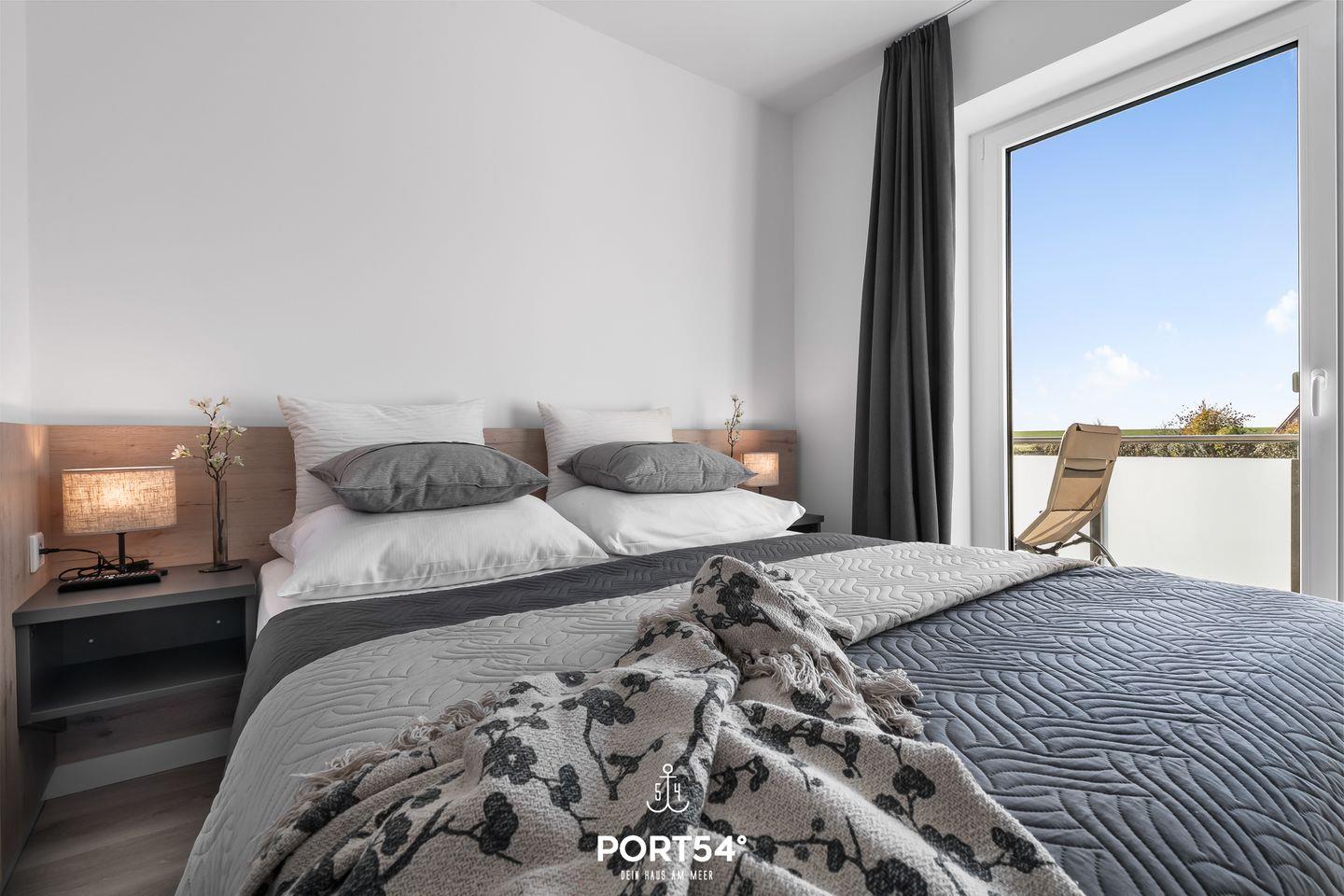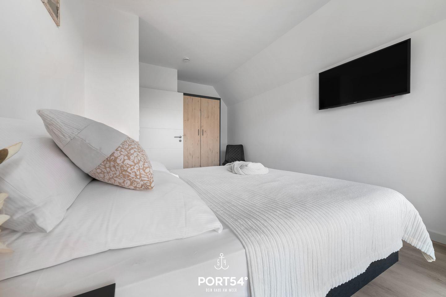 Die Schlafzimmer im Obergeschoss sind mit zwei Doppelbetten (160 × 200 cm und 180 × 200 cm) ausgestattet und verfügen ebenfalls jeweils über einen Flachbild-TV.