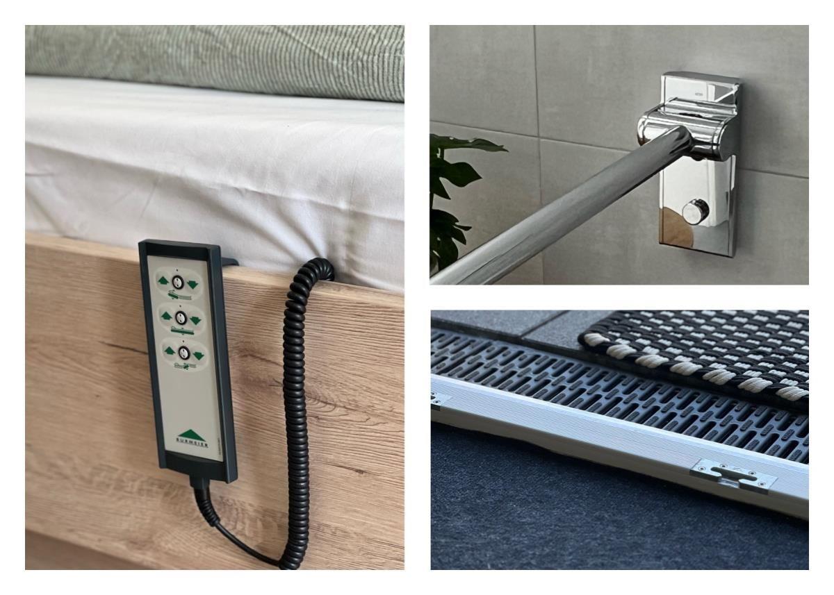 Das Schlafzimmer im Erdgeschoss ist mit einem höhenverstellbaren Einzelbett ausgestattet. Optional kann eine Absturzsicherung genutzt werden. Zusätzlich steht bei Bedarf ein Zustellbett für eine weitere Schlafmöglichkeit zur Verfügung. Das Zimmer verfügt außerdem über einen Flachbild-TV.