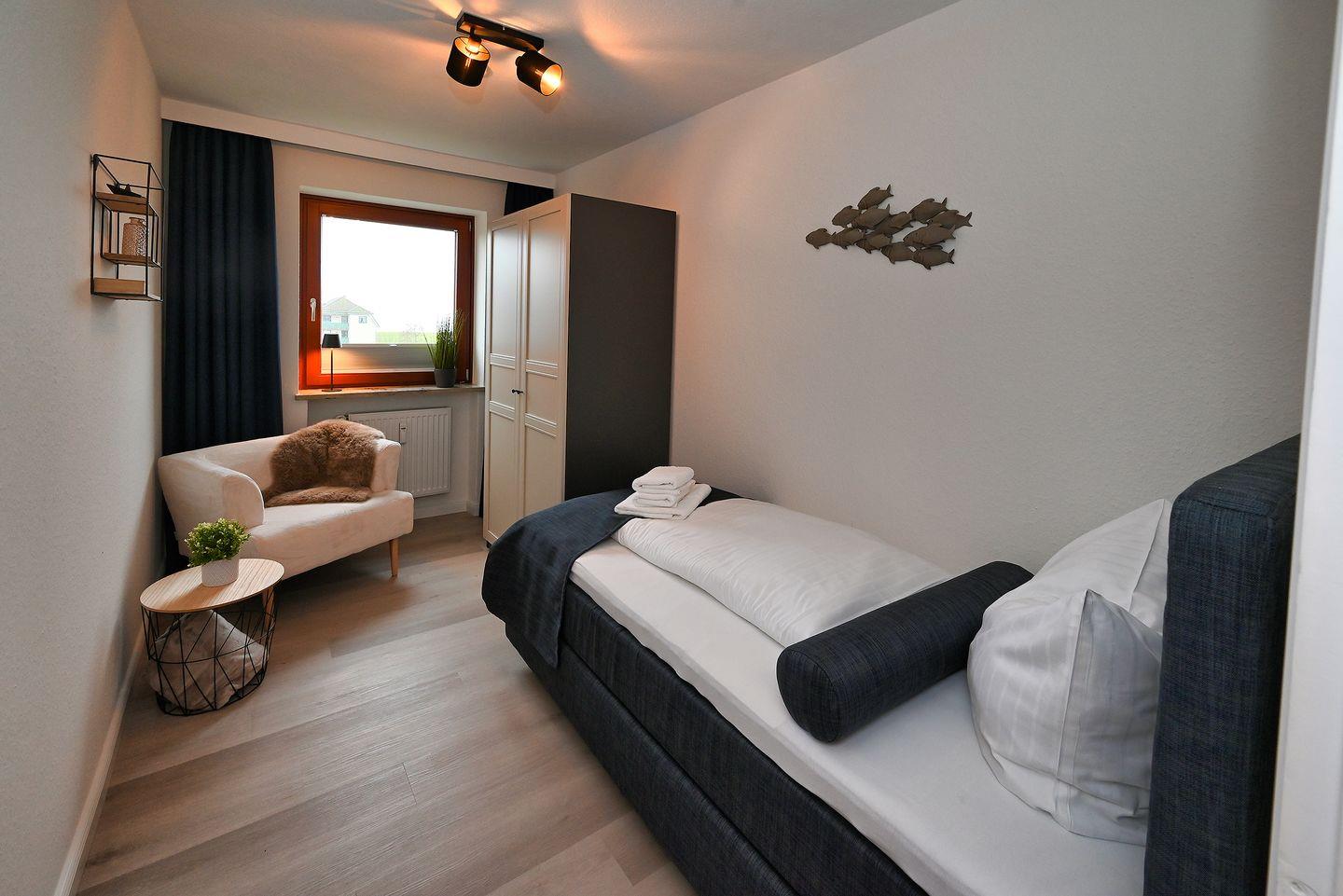 Die Wohnung verfügt über 2 separate Schlafzimmer, die mit Boxspringbetten ausgestattet sind. Die Betten haben eine Größe von 1,80 x 2,00 Meter & 0,90 x 2,00 Meter.