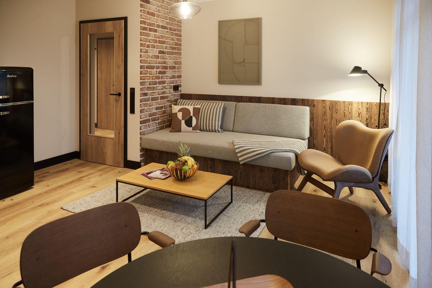 Gemütliches Apartment im Binnendiek Resort Büsum mit modernem Industrial Style, Fußbodenheizung und Balkon, ideal für entspannte Nordseeferien.