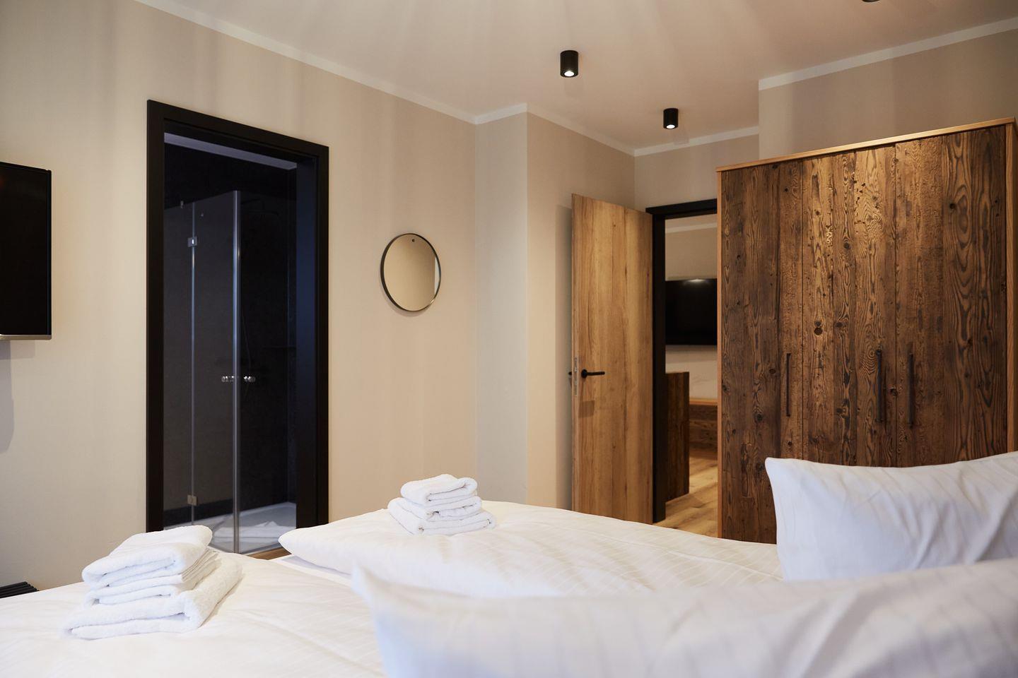 Modernes Apartment im Binnendiek Resort Büsum mit 2 Schlafzimmern, 2 Bädern, Balkon und Fußbodenheizung für entspannte Urlaubstage.