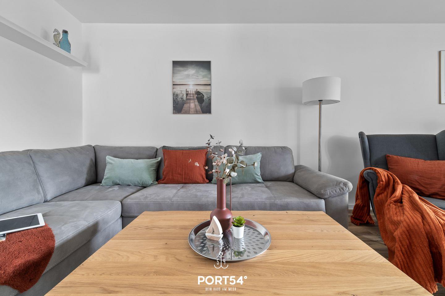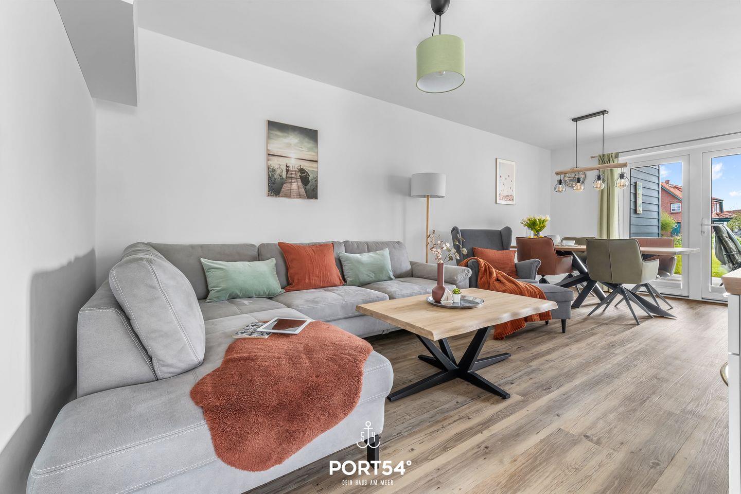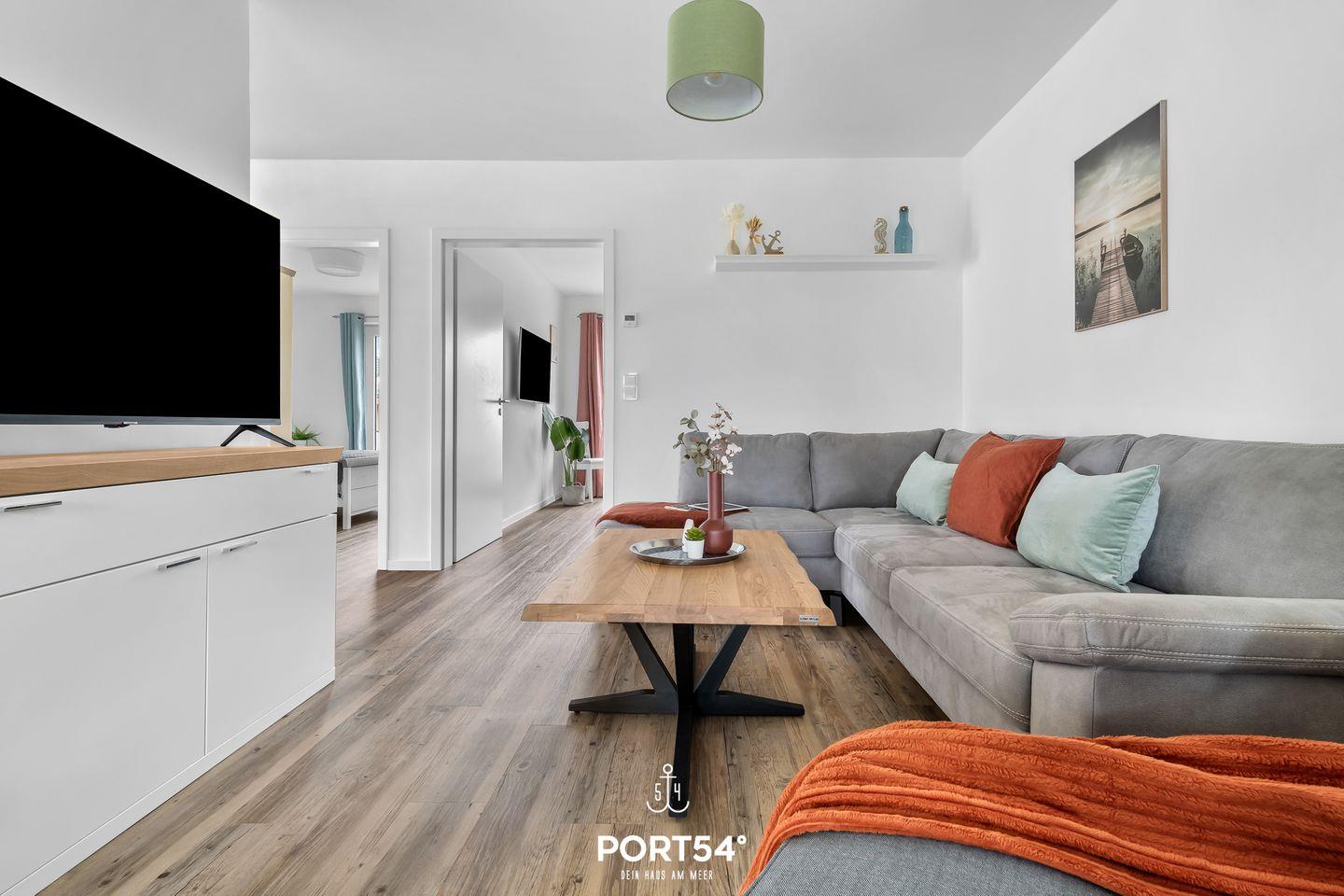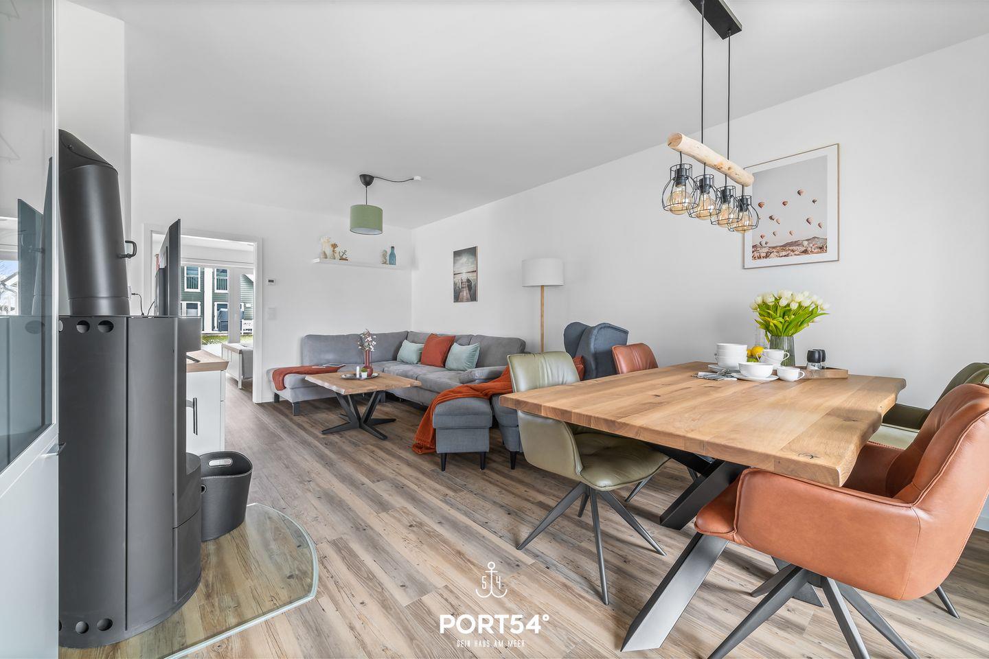 Moderne Ferienwohnung Sundowner in Büsum mit Terrasse, Kamin, Infrarotsauna und Fußbodenheizung für erholsamen Urlaub.