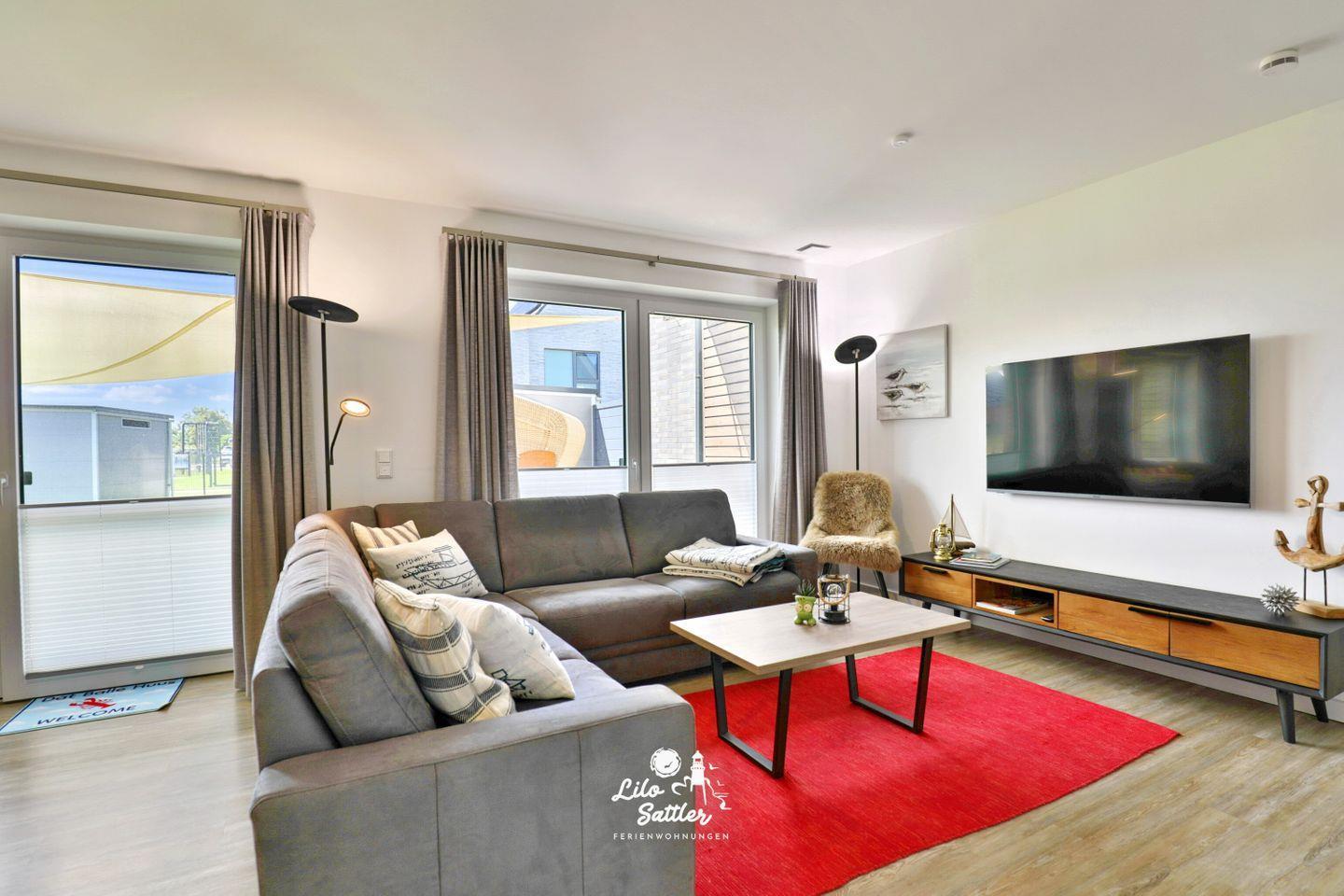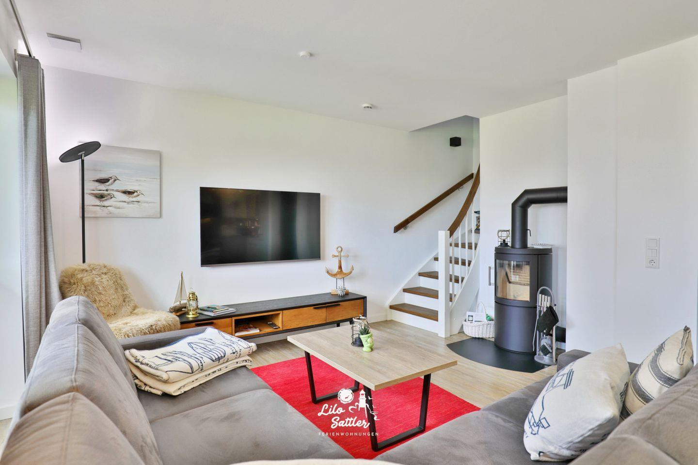 Große Couchecke, Couchtisch, Flachbild-TV, Sideboard, Kaminofen, Leselampe, Plissees