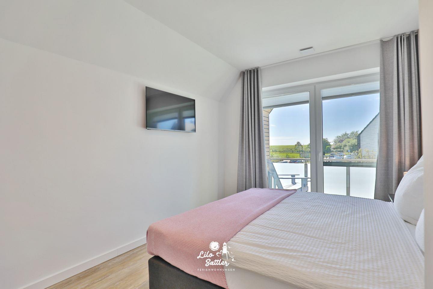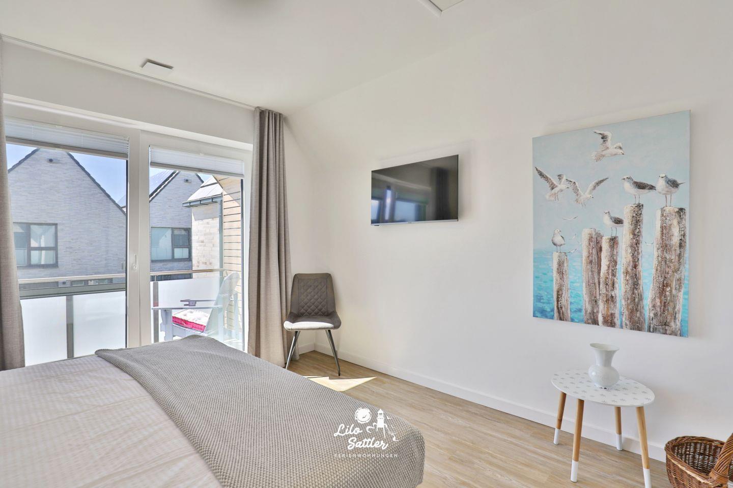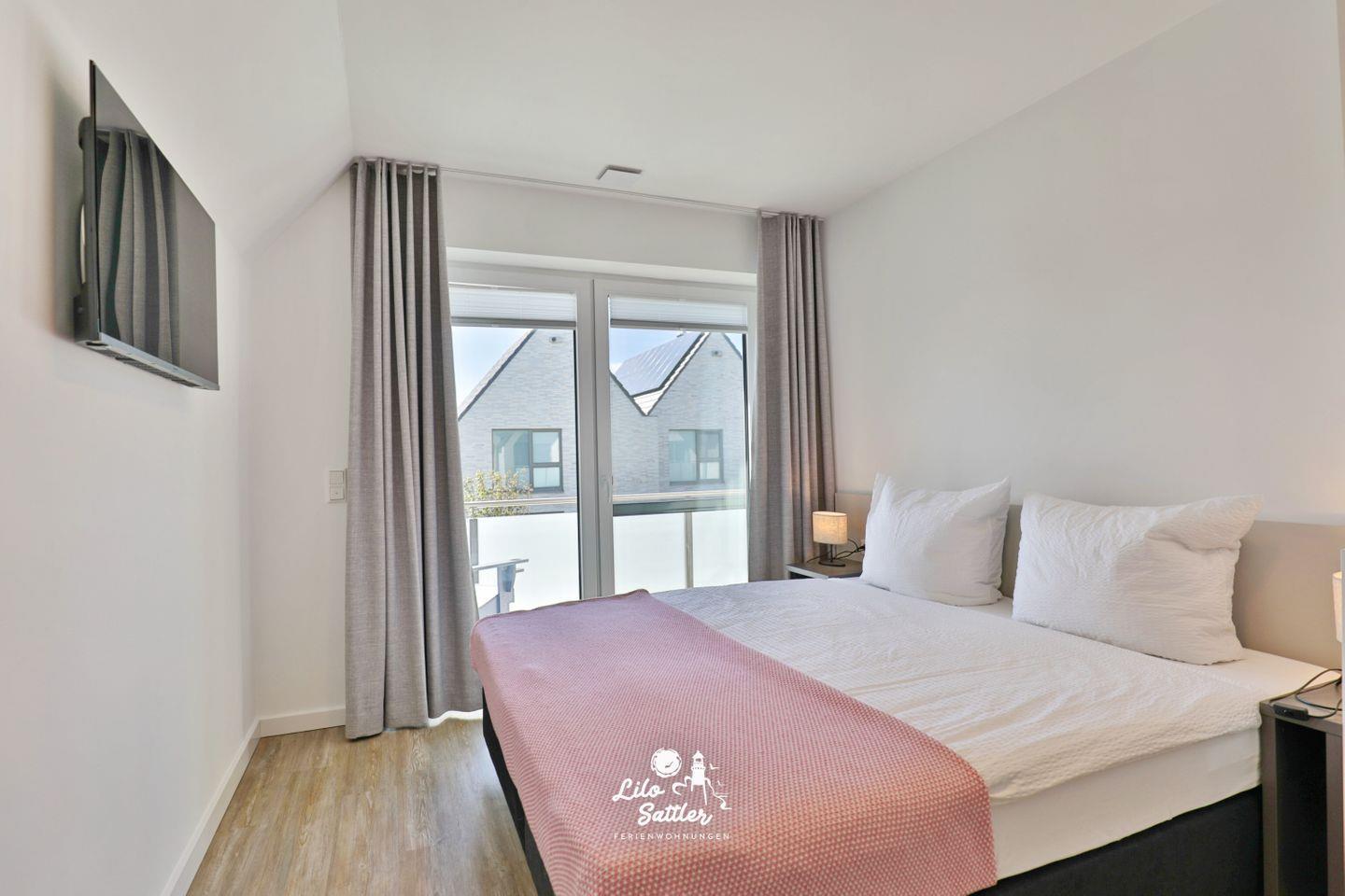 Boxspringdoppelbett (180 x 200 durchgehende Matratze), Nachttische + Lampen, Kleiderschrank, Flachbild-TV, Fliegengittertür, Verdunkelungsvorhang, Zugang zum gemeinsamen West-Balkon mit 2 Stühlen
