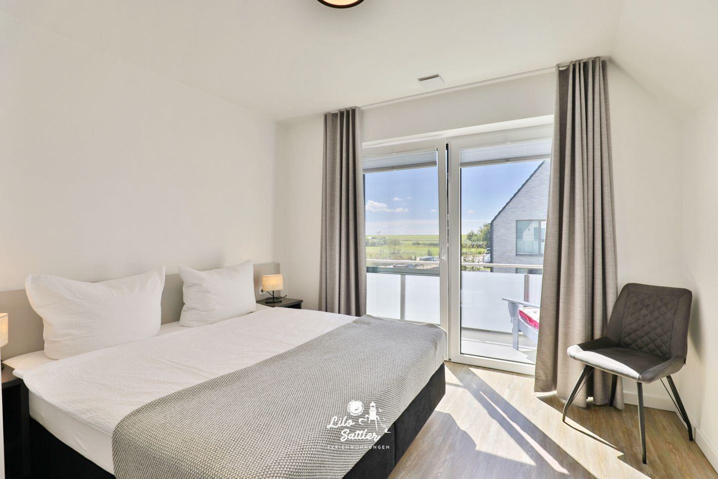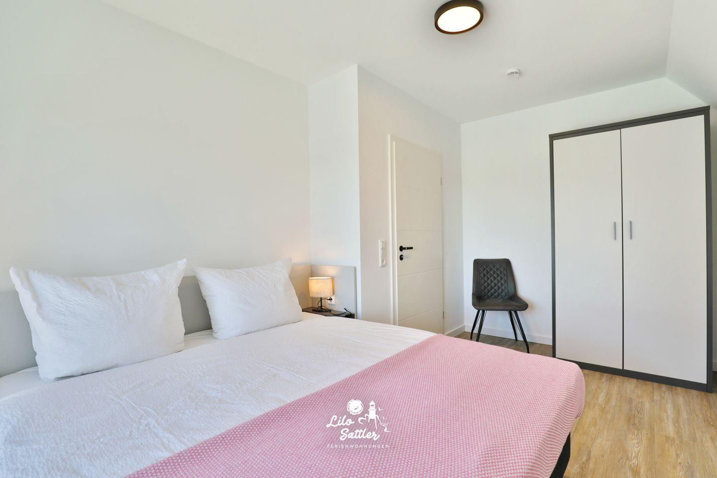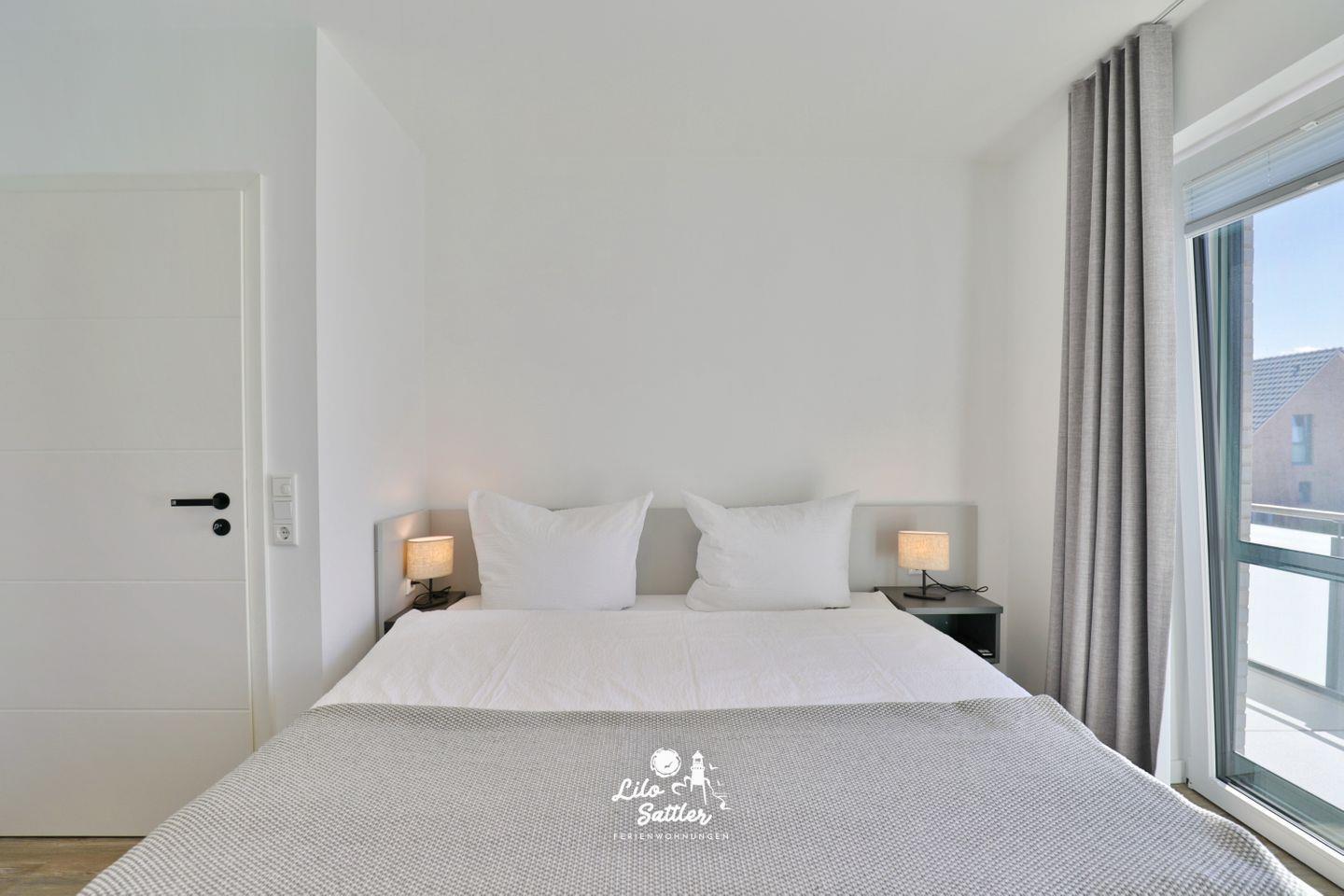 Boxspringdoppelbett (180 x 200 durchgehende Matratze), Nachttische + Lampen, Kleiderschrank, Flachbild-TV, Fliegengittertür, Verdunkelungsvorhang, Zugang zum gemeinsamen West-Balkon mit 2 Stühlen
