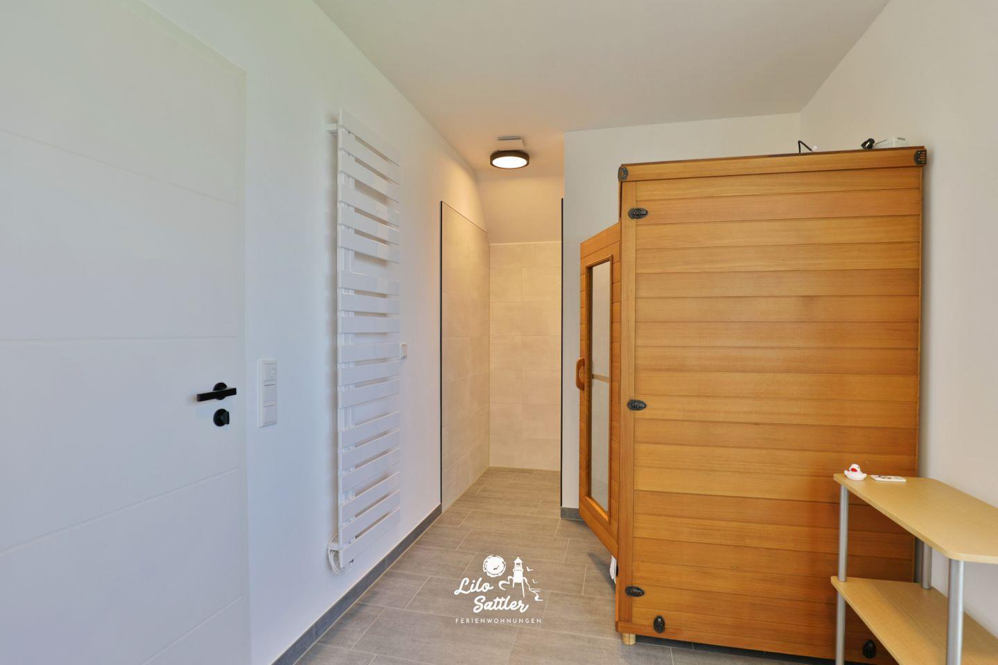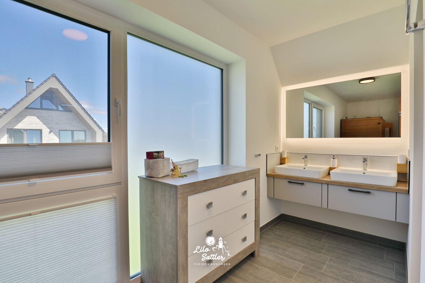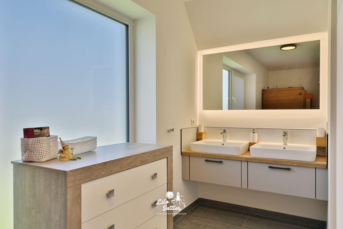Bodentiefe Dusche, Infratorkabinen-Sauna für 2 Personen, großer Spiegel, zwei Waschbecken, separates WC, Fenster, Handtuchtrockner, blickdichte Fenster, Plissees, Waschmaschine, Trockner, Kommode