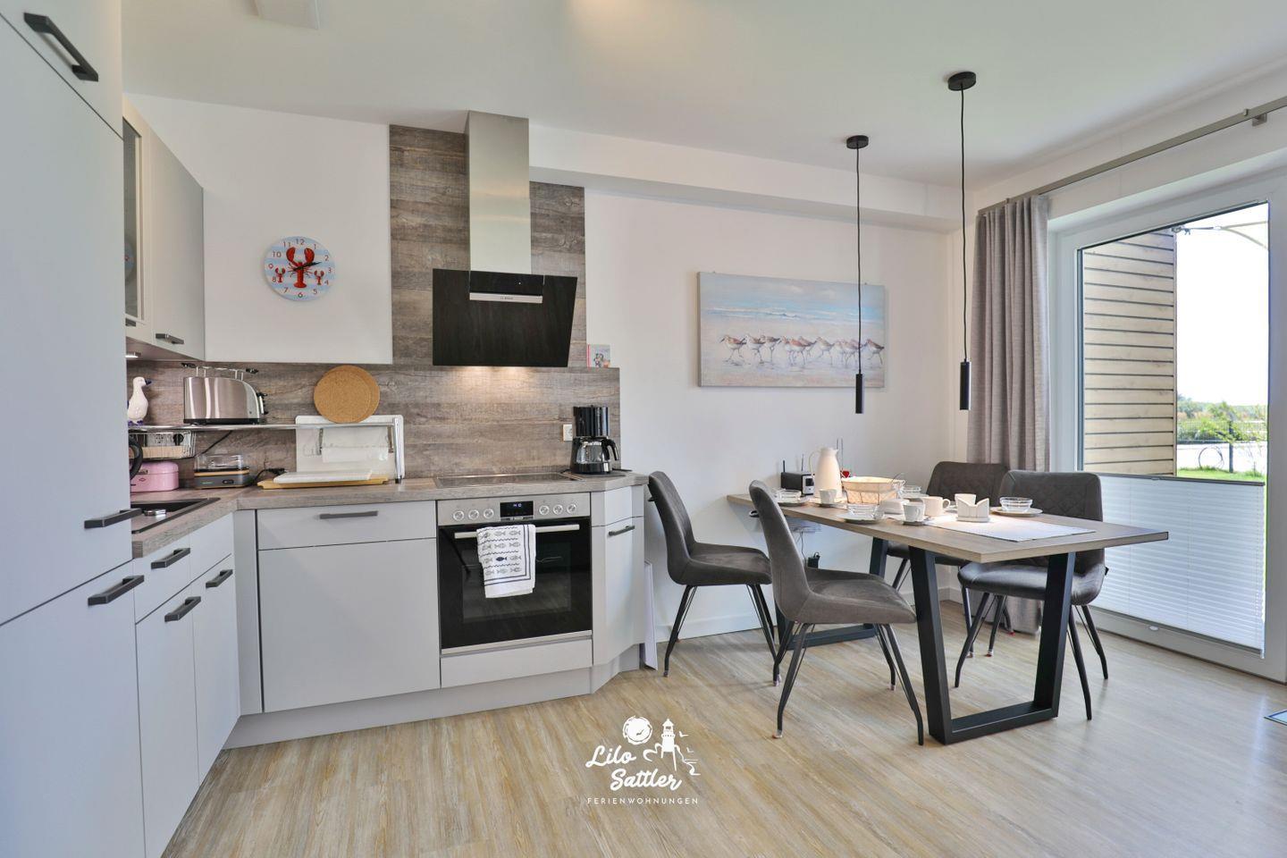 Küchenzeile, Kühlschrank, Gefrierschrank mit 2 Schubladen, Geschirrspüler, Induktionskochfeld, Backofen, Abluft, Filter-Kaffeemaschine und Nespresso Kapsel-Maschine, Toaster, Wasserkocher, Eierkocher, Esstisch mit Stühlen, Zugang zur Terrasse