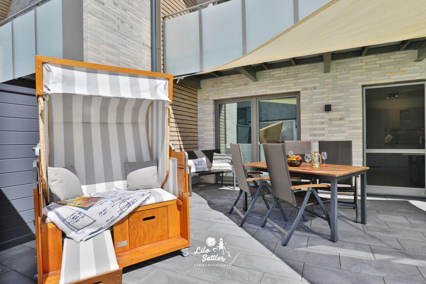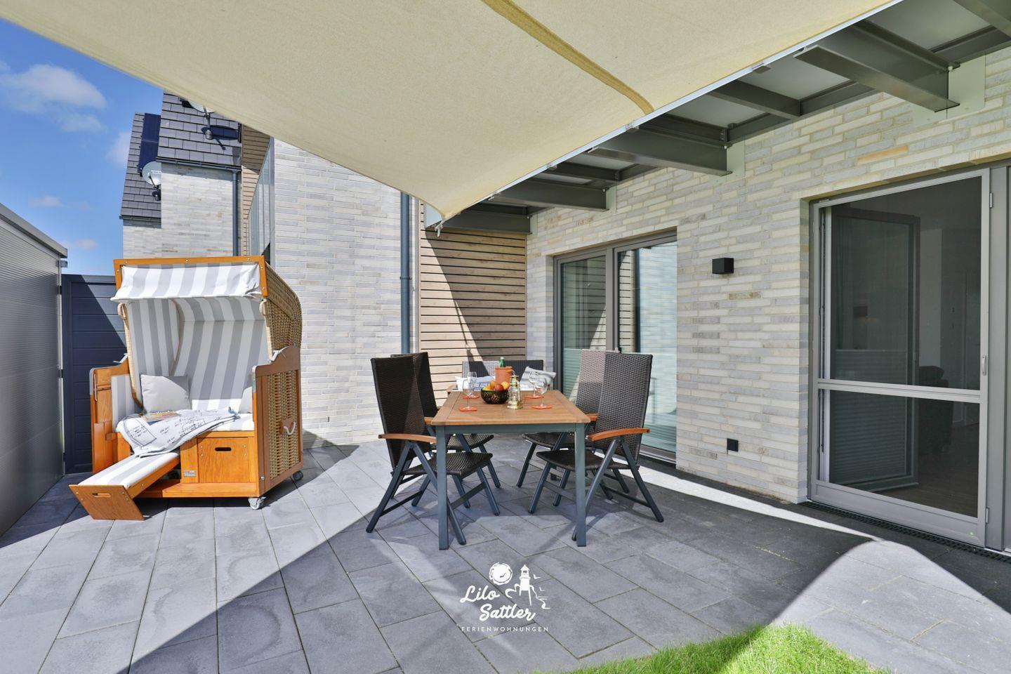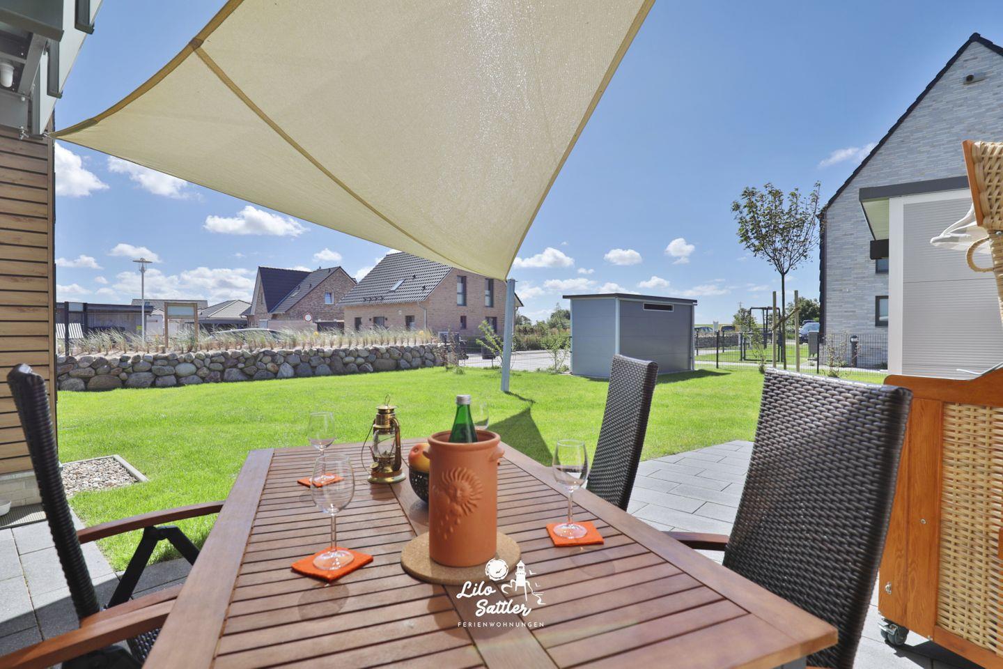Im Garten können Sie auf der Terrasse unter einem Sonnensegel geschützt vor Sonne die herrliche Nordseeluft genießen und am Abend im gemütlichen Strandkorb den Tag nordseetypisch mit einem Urlaubsdrink ausklingen lassen.