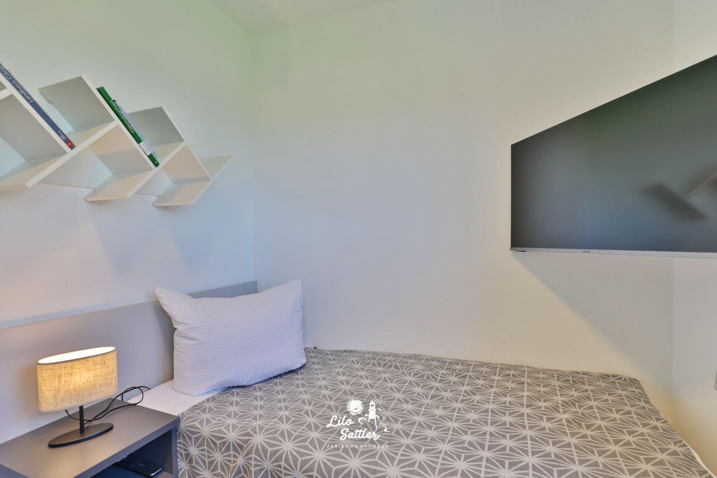 Einzelboxspringbett (90 x 200), Kommode, Flachbild-TV, Nachttisch + Lampe, Fenster mit Plissees und Fliegengitter, Verdunkelungsvorhang, Stuhl, Garderobe