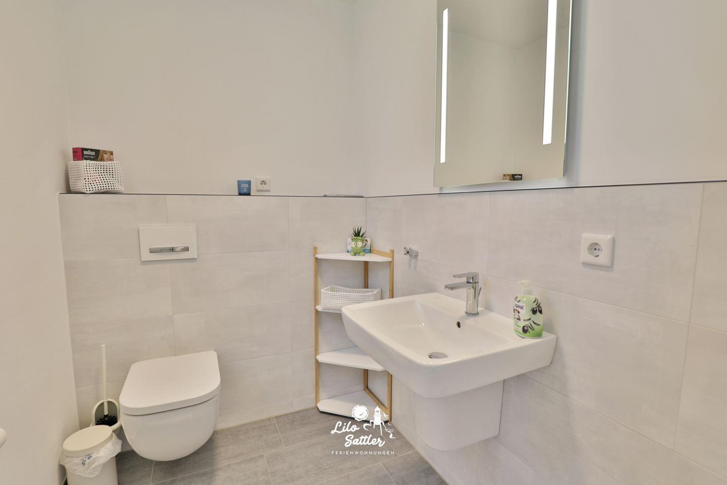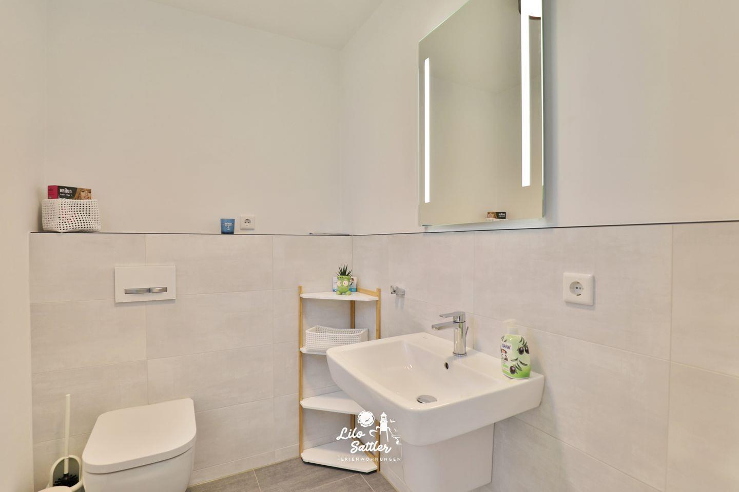 WC, beleuchteter Spiegel, Waschbecken, blickdichte Fenster, Ablage