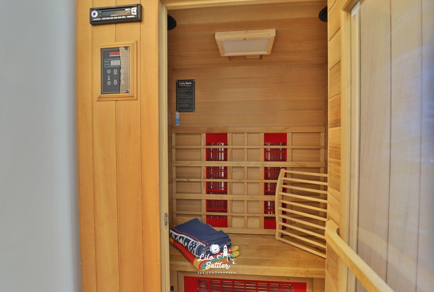 Im Obergeschoss gibt es neben den komfortablen Schlafzimmern, die jeweils einen Zugang zum West-Balkon mit herrlichem Sonnenuntergang haben, auch eine Infrarotkabine für 2 Personen, die zur ultimativen Entspannung einlädt.