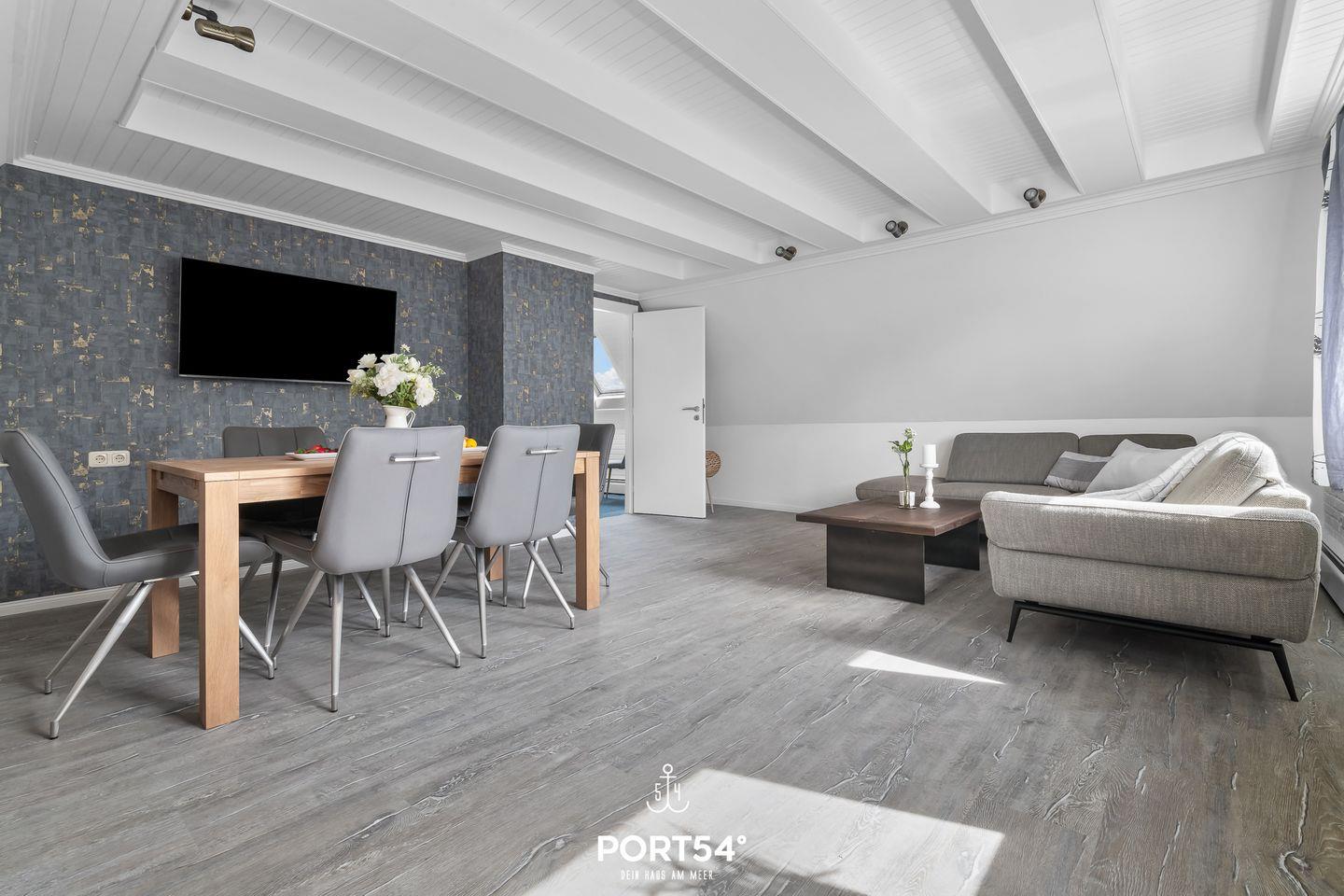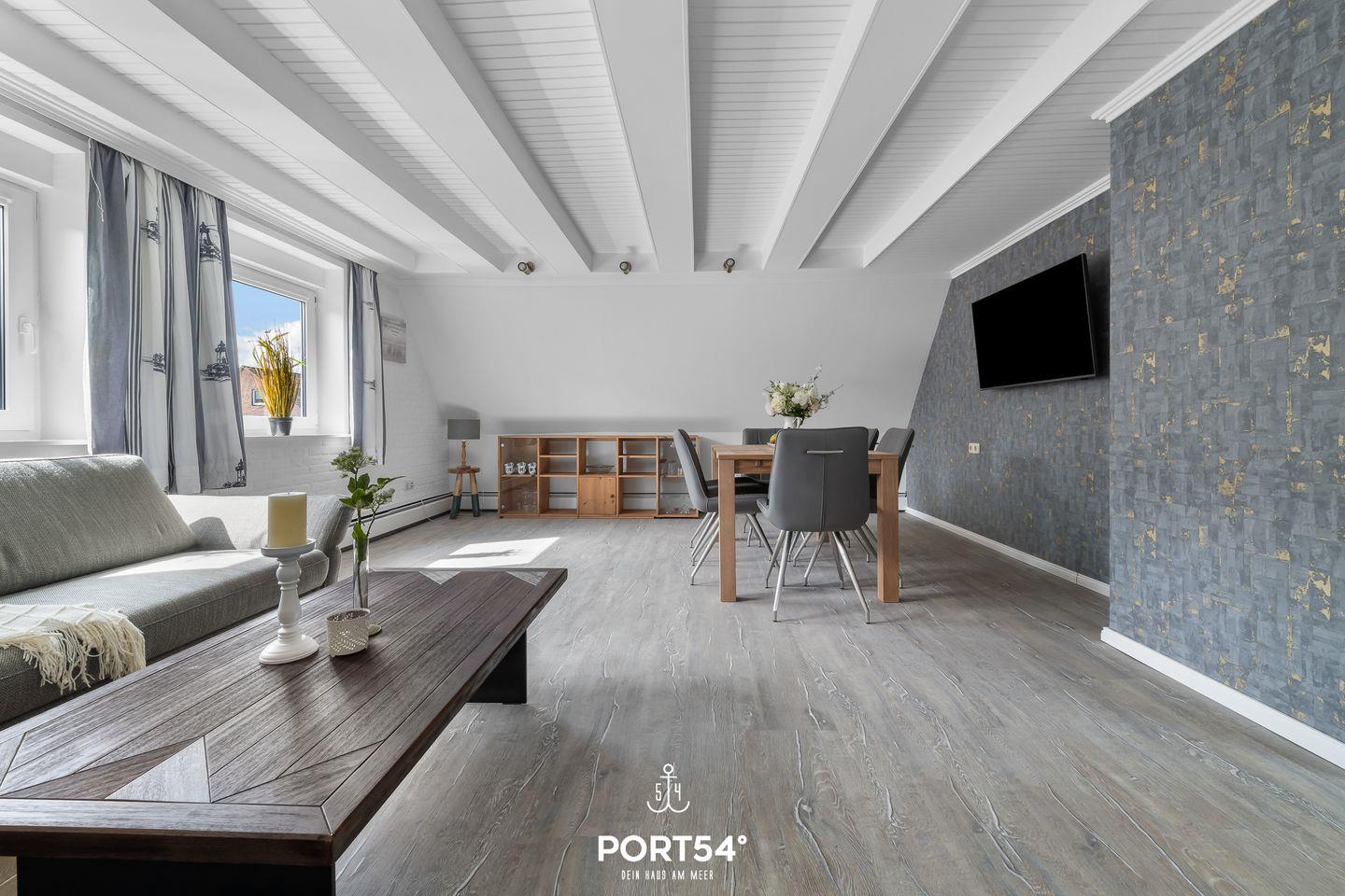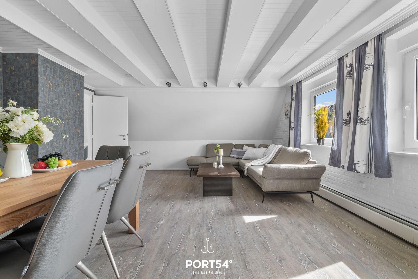 Strandnahes Hausboot Oberdeck in Büsum mit zwei Schlafzimmern, offener Küche und privatem Parkplatz für entspannte Nordseeferien.