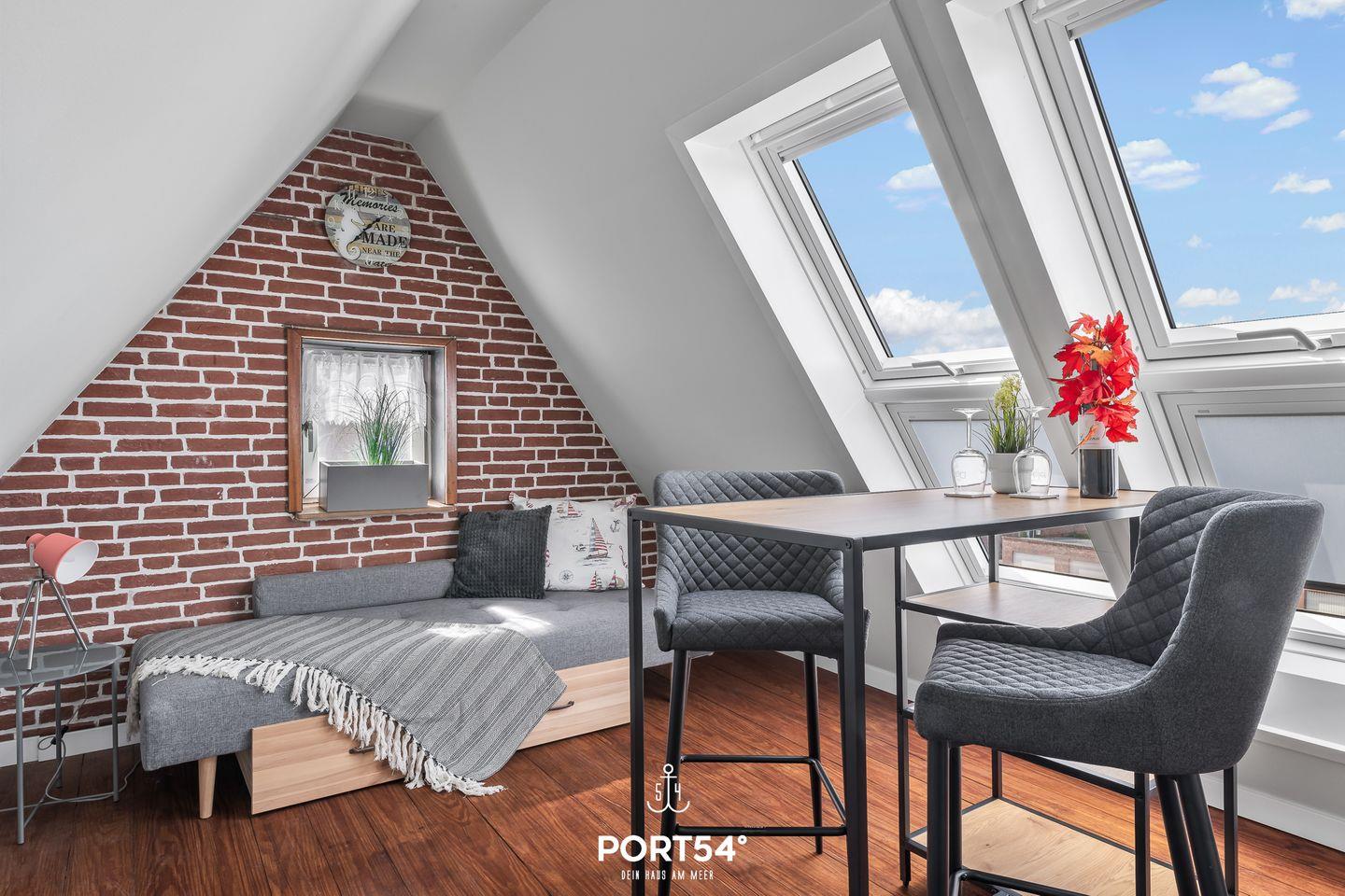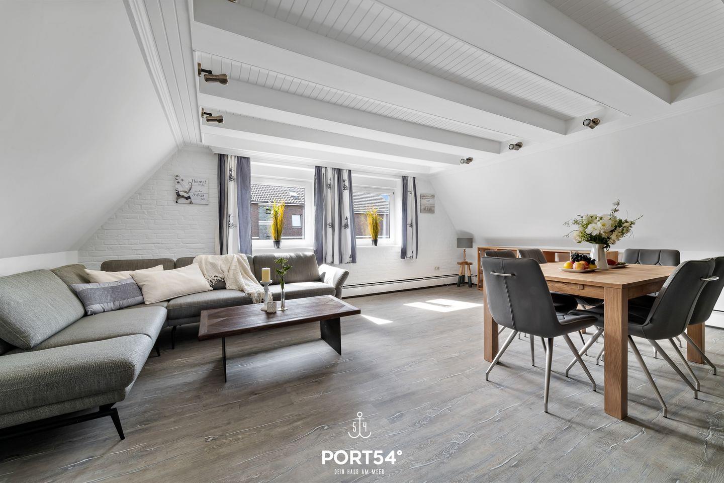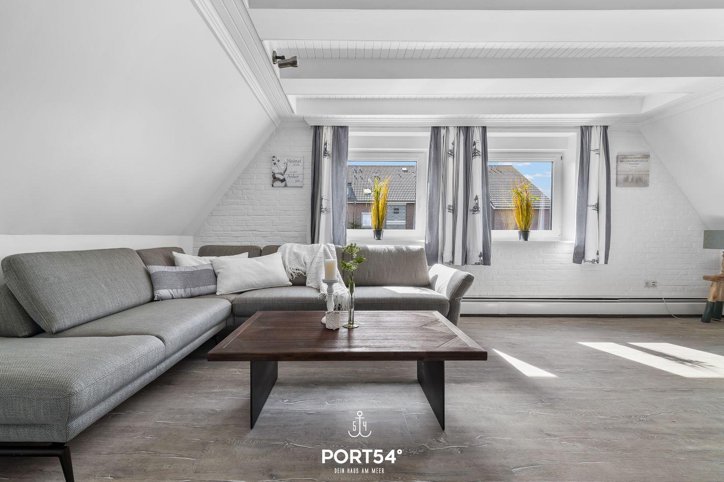 Strandnahes Hausboot Oberdeck in Büsum mit zwei Schlafzimmern, offener Küche und privatem Parkplatz für entspannte Nordseeferien.
