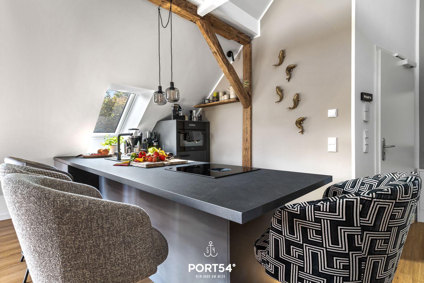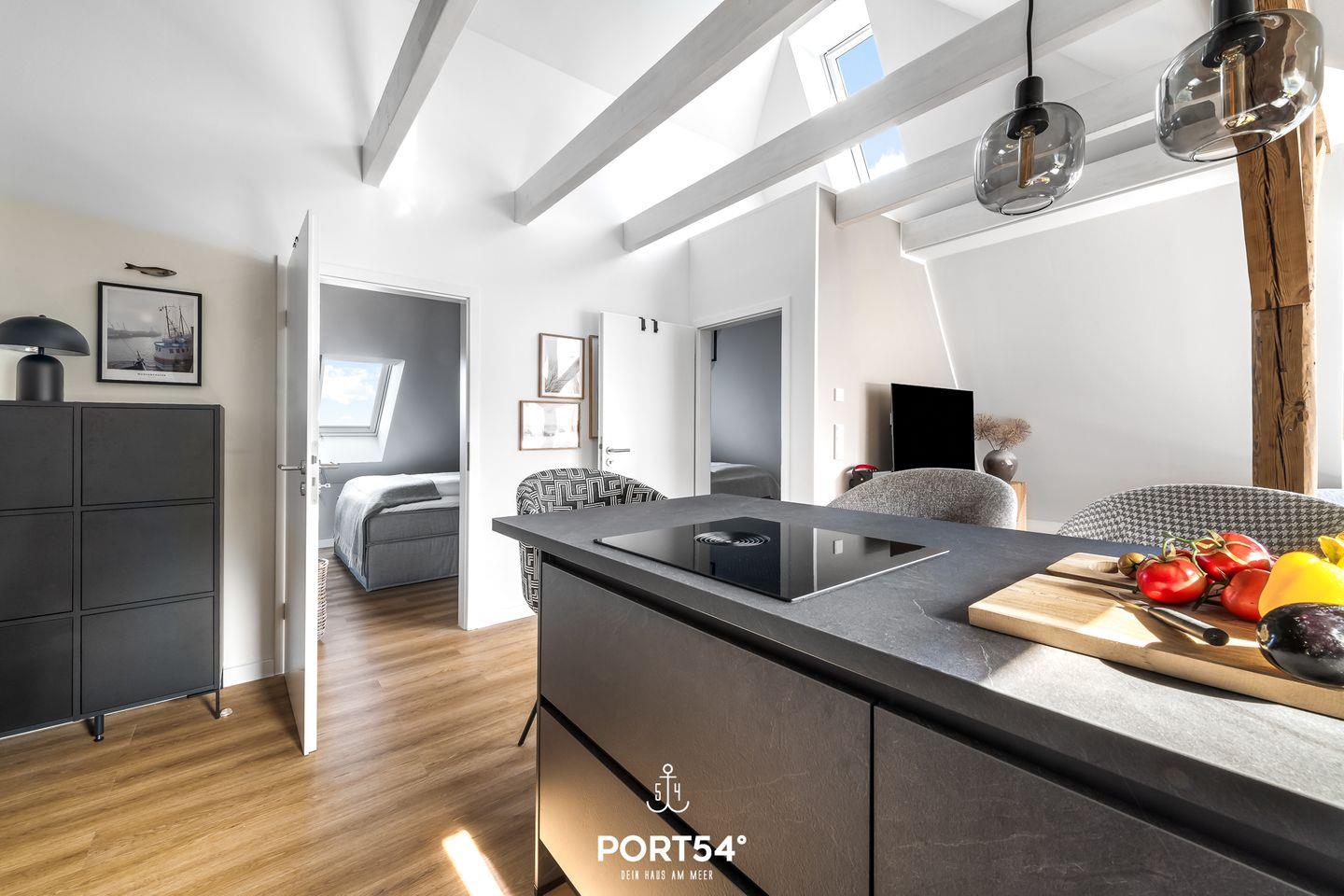 Die Ferienwohnung verfügt über zwei komfortable Schlafzimmer, die Ruhe und Erholung versprechen. Das offene Wohnkonzept verbindet den Wohn- und Essbereich mit einer voll ausgestatteten modernen Küche, welche keine Wünsche offen lässt. Hier finden Sie alles, was Sie für die Zubereitung Ihrer Lieblingsgerichte benötigen, darunter einen Herd, Backofen, Spülmaschine und eine Mikrowelle. Der großzügige Essbereich, der mit einem Esstisch und gemütlichen Stühlen ausgestattet ist, lädt dazu ein, gemeinsame Mahlzeiten zu genießen und gesellige Abende zu verbringen.