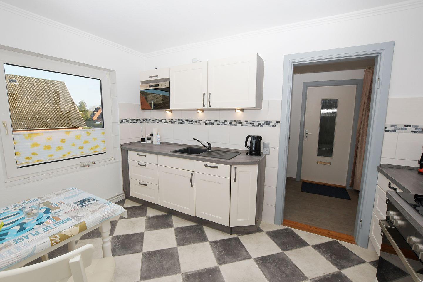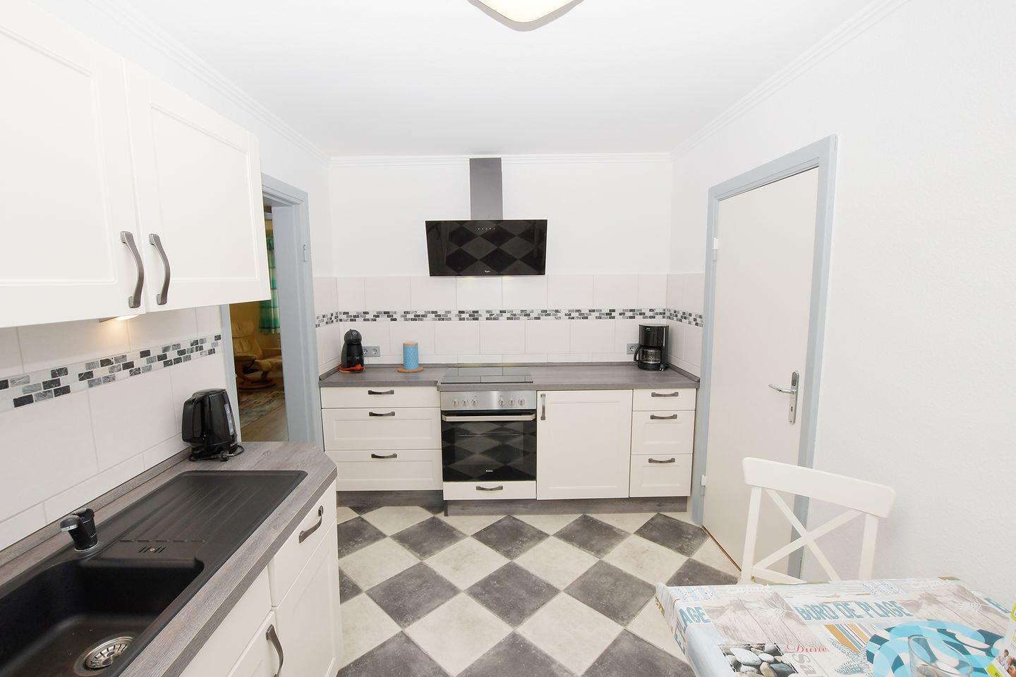 Die geschlossene Küche mit Esstisch ist umfassend ausgestattet und lädt zu genussvollen Stunden ein. Sie verfügt über einen Ceranherd, Backofen, Mikrowelle, Kühlschrank, Spülmaschine. Für einen angenehmen Start sorgen nicht nur die voll ausgestattete Küche, sondern auch die vorhandene Erstausstattung an Bettwäsche, Handtüchern und Geschirrhandtüchern.
