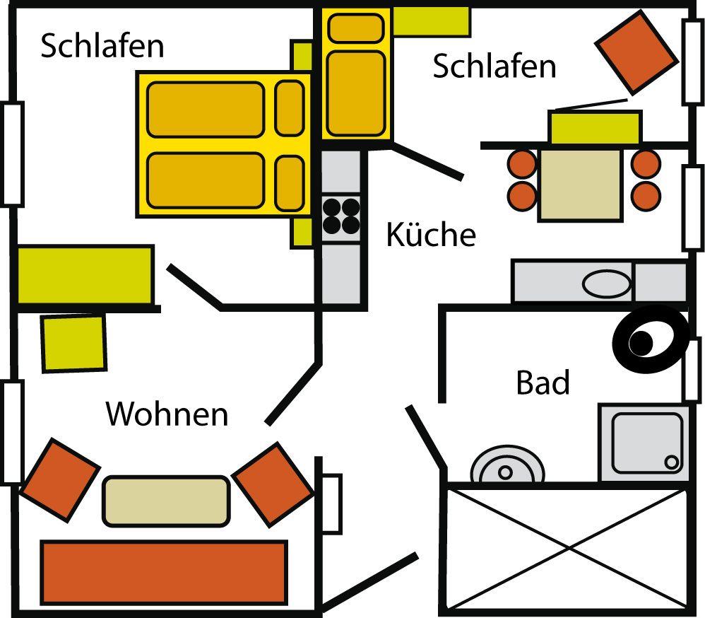 Auf 56 m² Wohnfläche bietet die Ferienwohnung Krabbe Platz für bis zu drei Gäste. Zwei separate Schlafzimmer ermöglichen individuelle Rückzugsmöglichkeiten und sind insbesondere für Familien mit Kindern ideal geeignet, die hier herzlich willkommen sind.