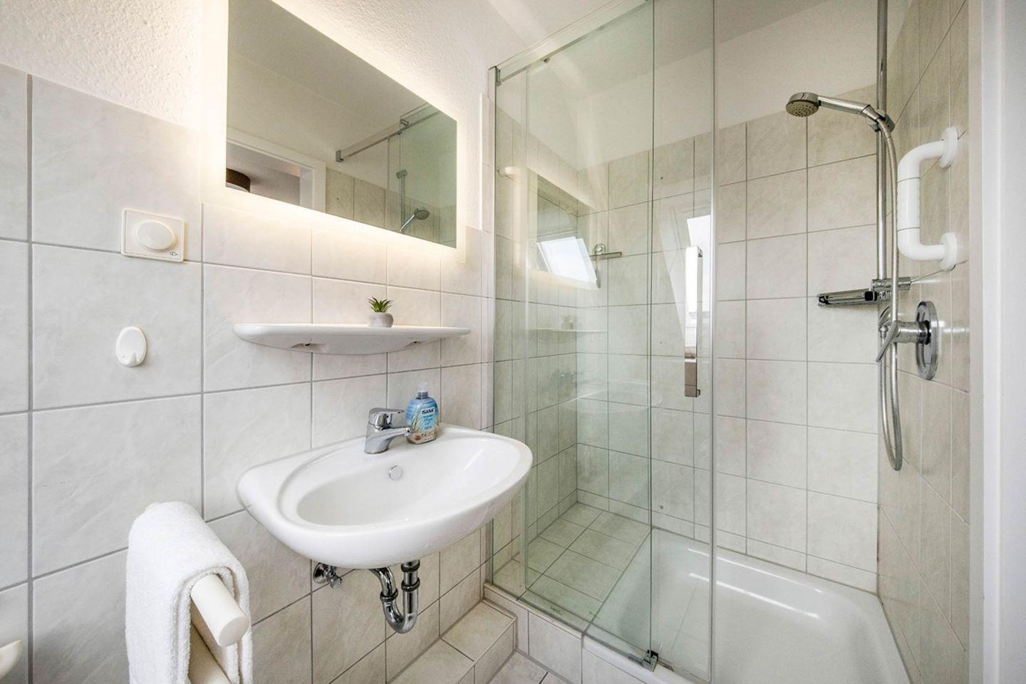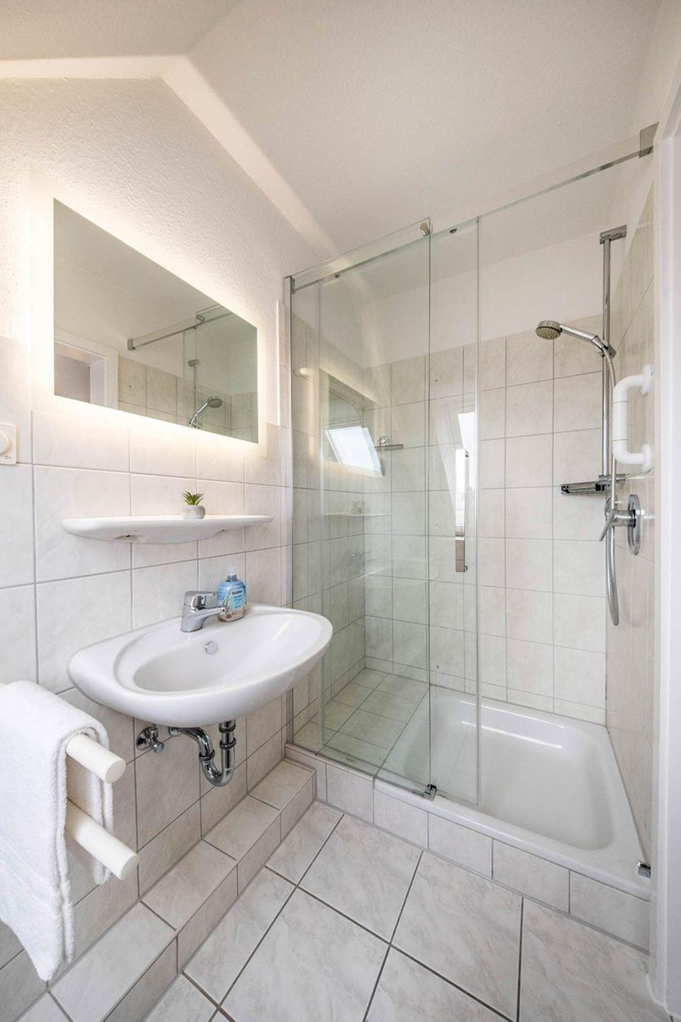 Im oberen Teil der Wohnung (über eine Treppe zu erreichen) befinden sich noch 1 Schlafzimmer und ein zusätzliches Duschbad mit WC