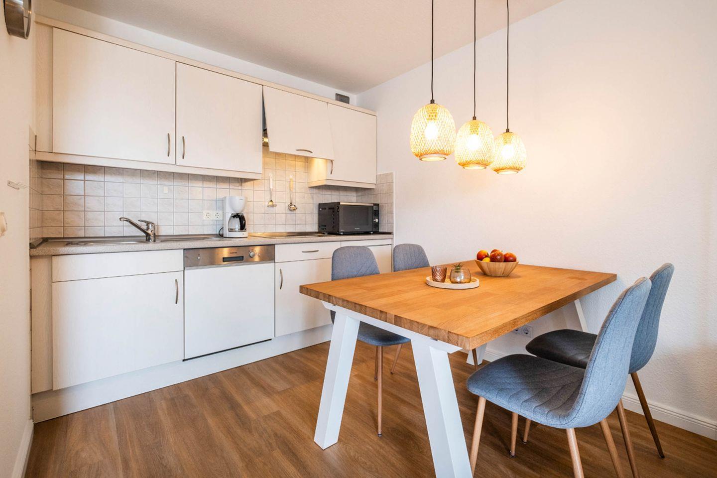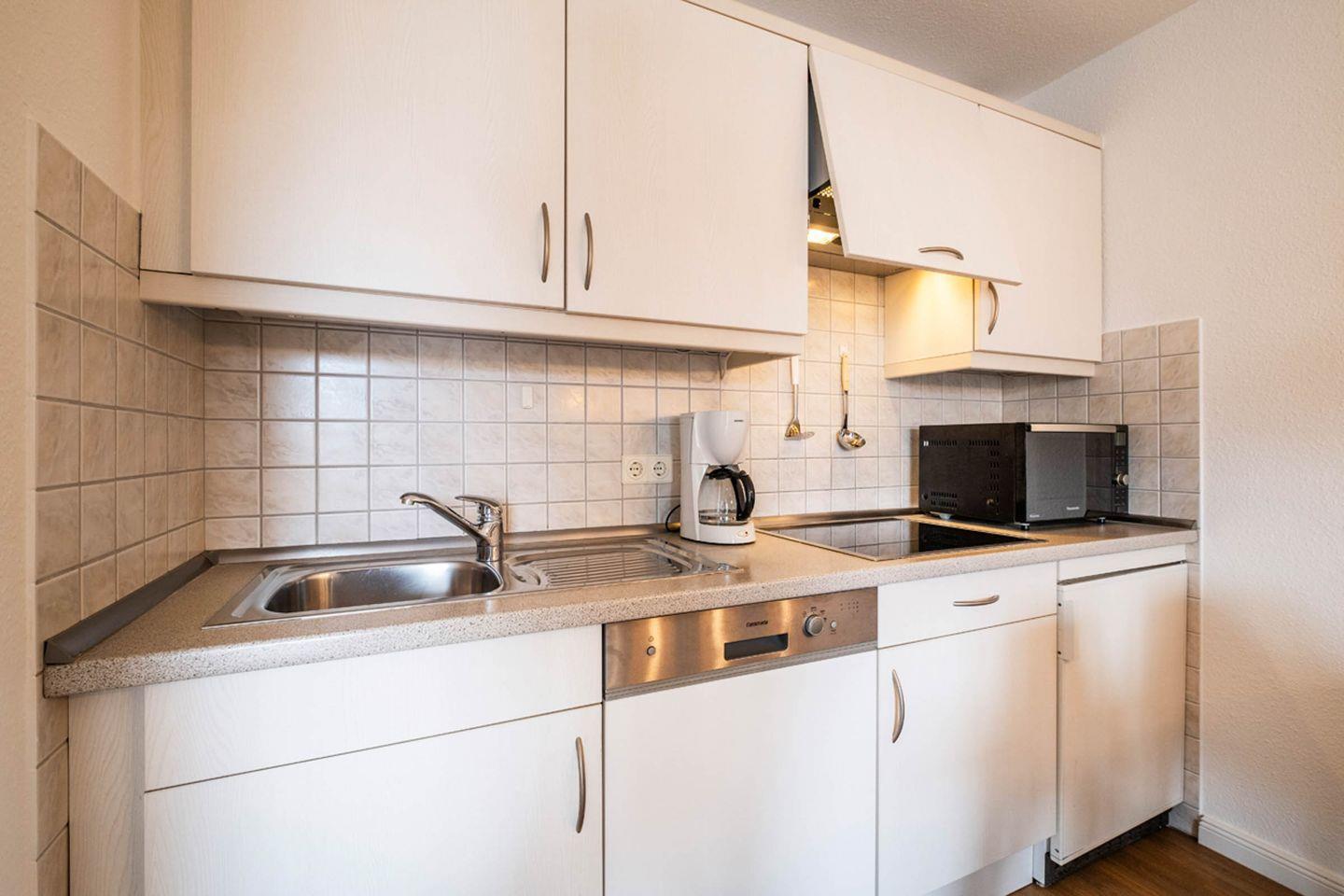 Küchenzeile: Geschirrspüler, Kochfeld, Mikrowelle, Kühlschrank mit Gefrierfunktion, Heißwasserkocher, Kaffeemaschine, Toaster.