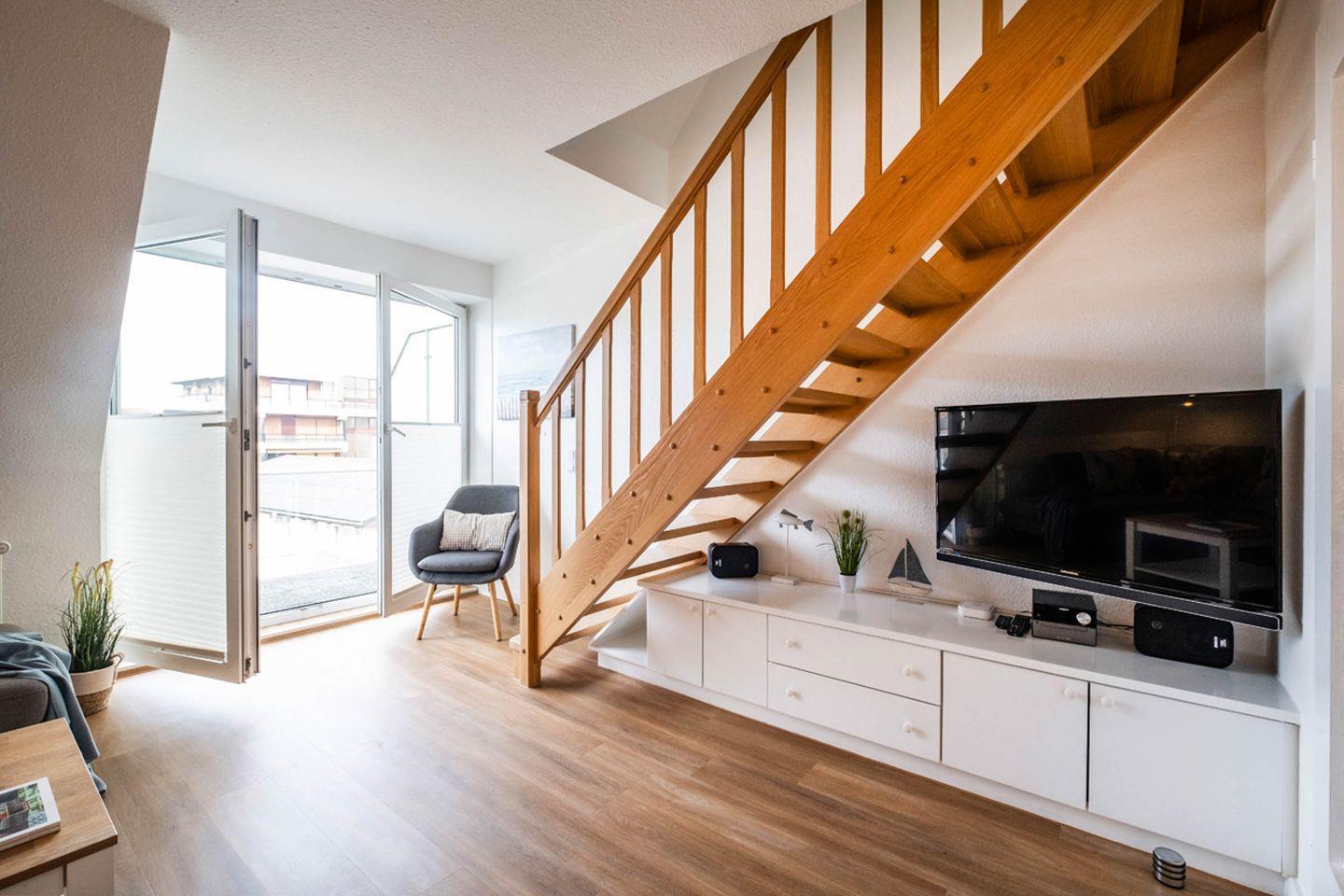 Im unteren Teil der Wohnung erwartet Sie : 1 Wohnzimmer mit Essbereich, eine kleine Küchenzeile, 1 Schlafzimmer mit einem Doppelbett und 1 Duschbad.