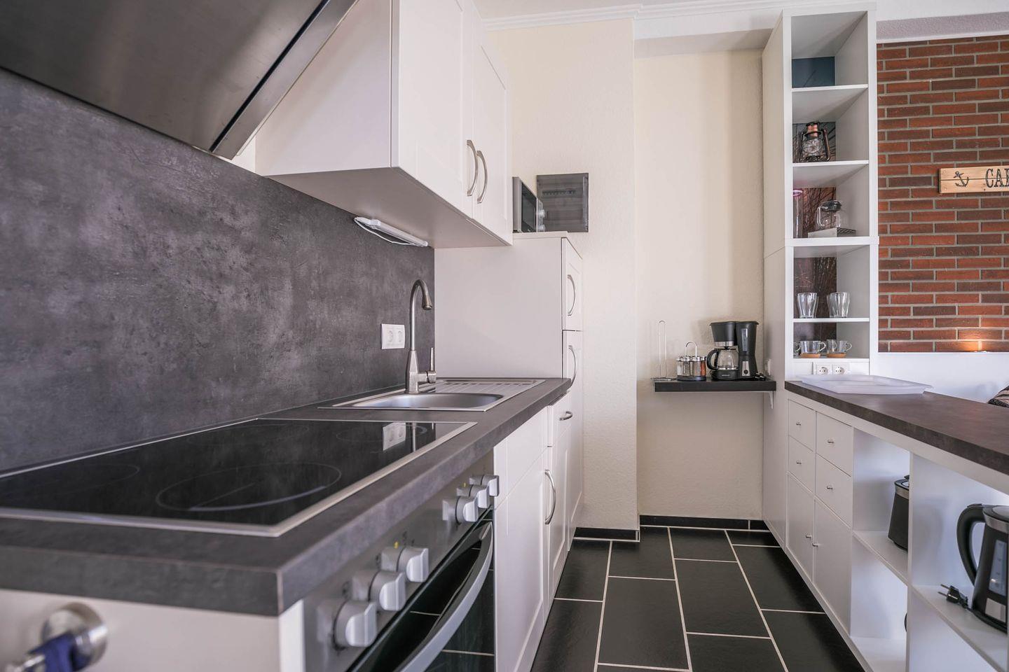 Küchenzeile: Cerankochfeld, Kühlschrank, Filterkaffee, Wasserkocher, Toaster, Eierkocher