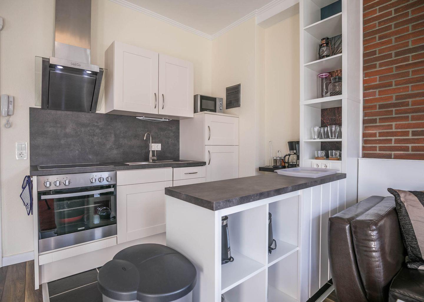 Aufgeteilt ist das Apartment in einen Wohn- und Essbereich mit offener Küche. Die Küche ist mit einem Herd, Backofen, einer Mikrowelle und einer Geschirrspülmaschine ausgestattet. Das Highlight des Wohnbereiches ist der sonnige Erker. Von dem Wohnbereich gelangen Sie in das durch eine Schiebetür abgetrennte Schlafzimmer. Im gemütlichen Schlafzimmer befindet sich ein Doppelbett und ein Kleiderschrank. Das Tageslichtbad verfügt über eine flache Duschwanne (Regendusche) und einen Handtuchheizkörper.