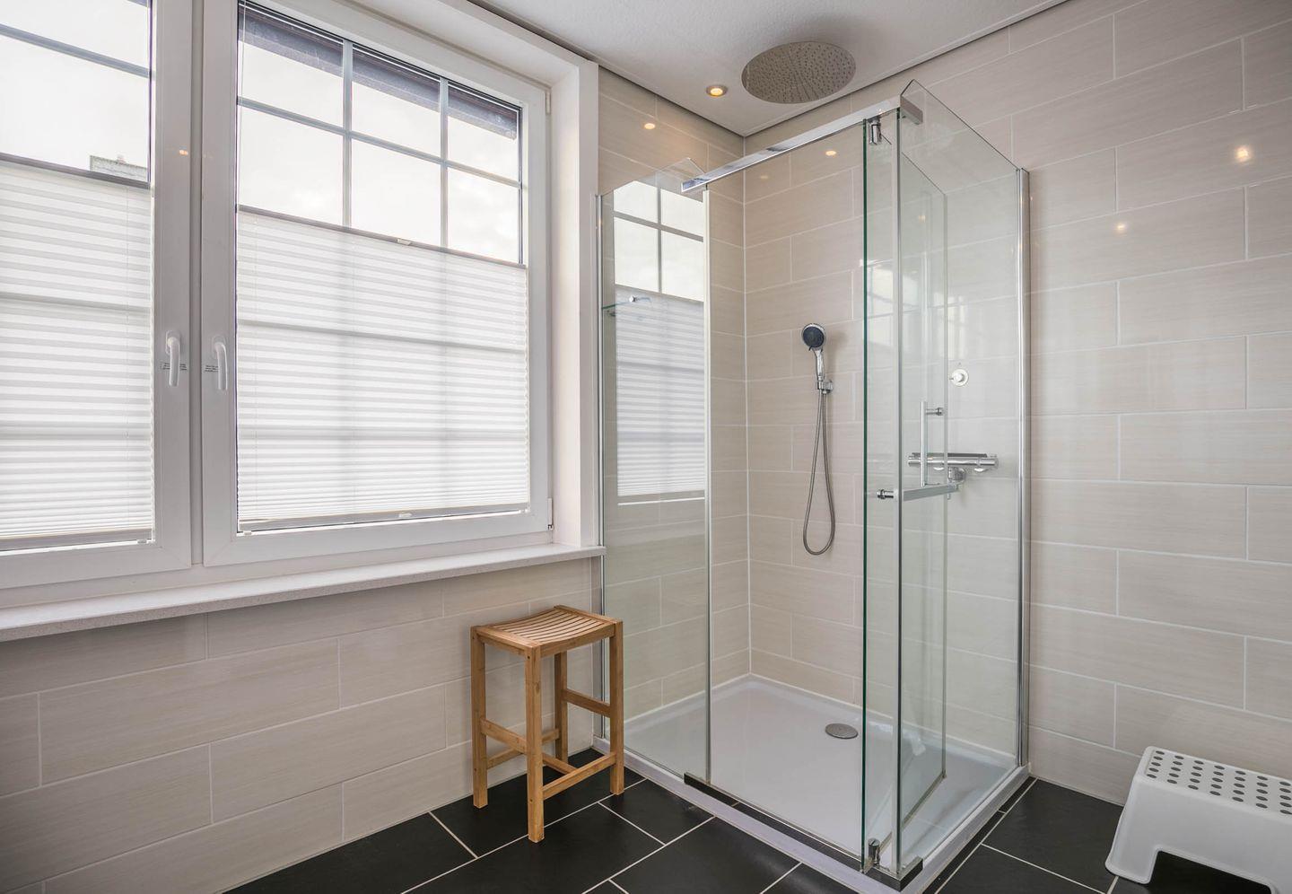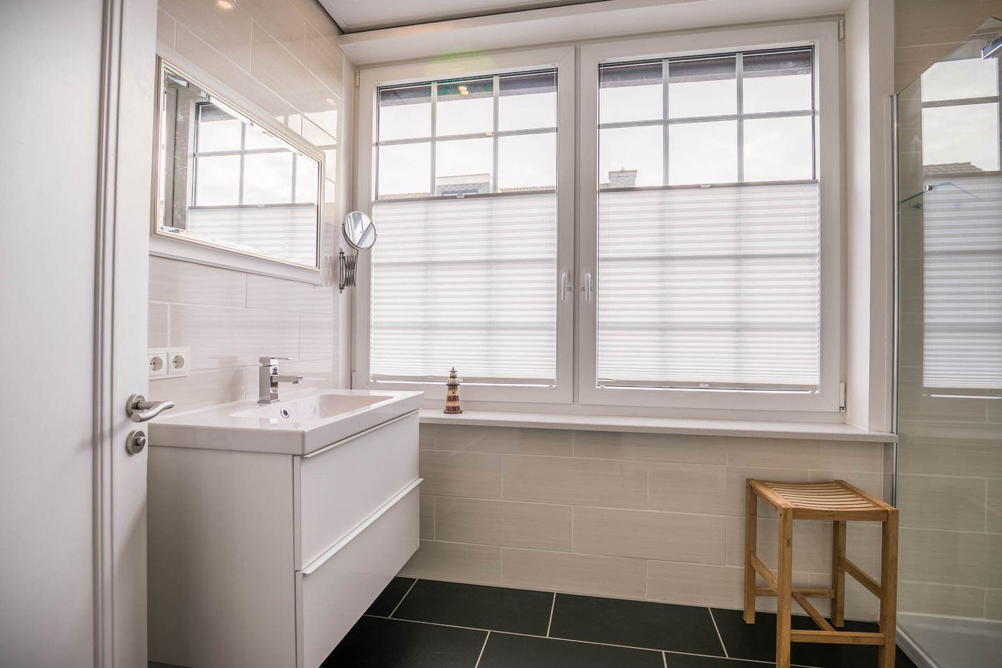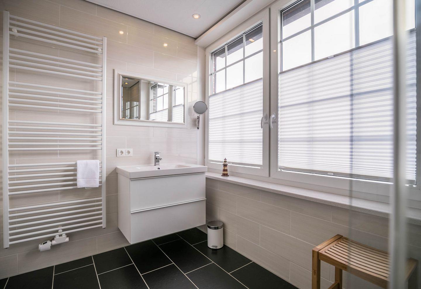 Sanitär: Tageslicht - Duschbad (Regendusche), WC separat, Handtuchheizung, Haar-Föhn, Kosmetikspiegel