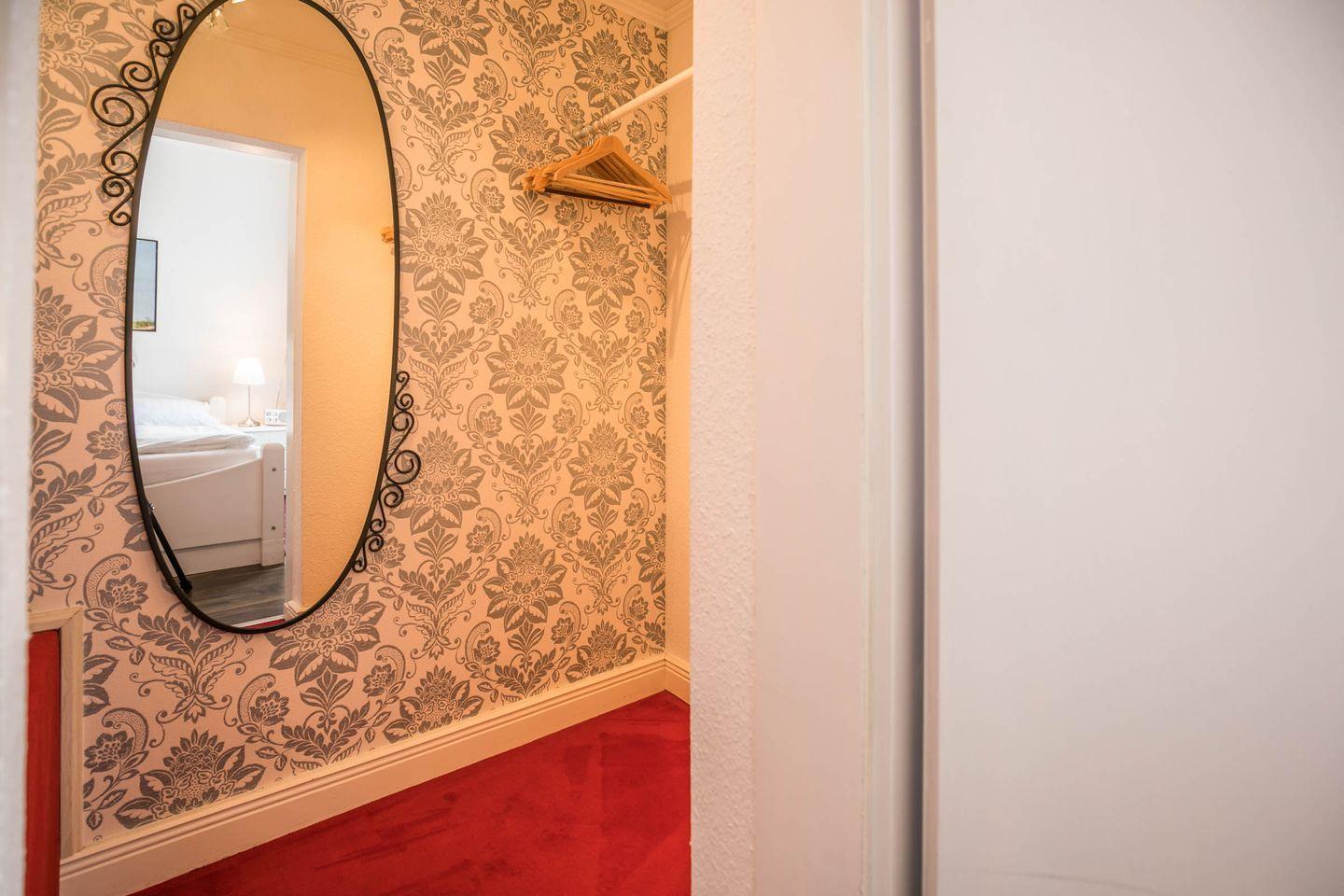 Aufgeteilt ist das gemütliche Altbau-Appartement in einen Wohn- und Essbereich mit offener Küche (Kücheninsel). Die Küche ist mit einem Herd, Backofen, einer Mikrowelle und einer Geschirrspülmaschine ausgestattet. Von dem Wohnbereich gelangen Sie in das Schlafzimmer. Im gemütlichen Schlafzimmer befindet sich ein Doppelbett. Das Highlight des Schlafzimmers ist eindeutig der begehbare Kleiderschrank. Von dem Wohnbereich gelangen Sie in das Tageslichtduschbad (begehbar, Regendusche) und in das separate Bad (ebenfalls Tageslicht) mit einem WC.