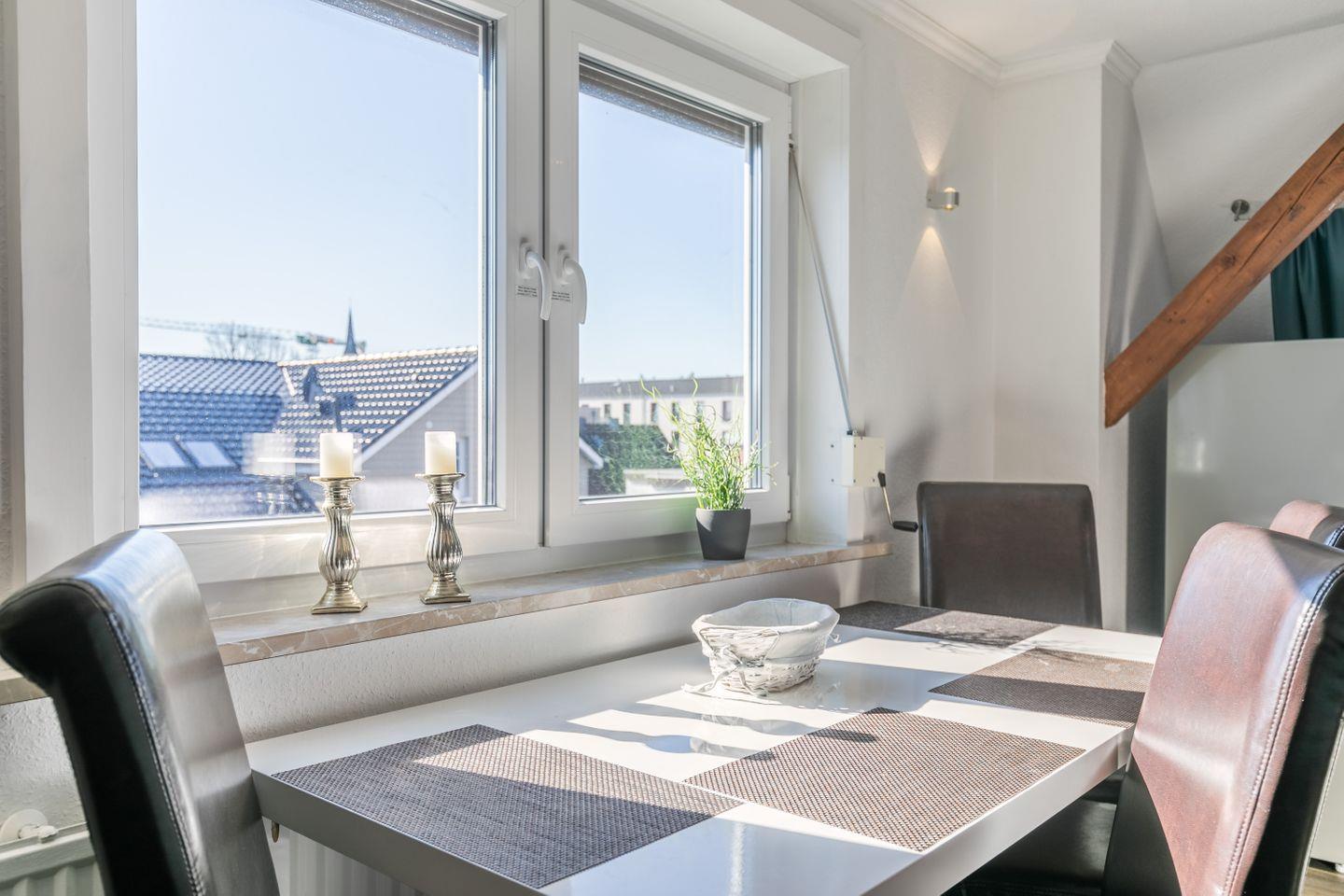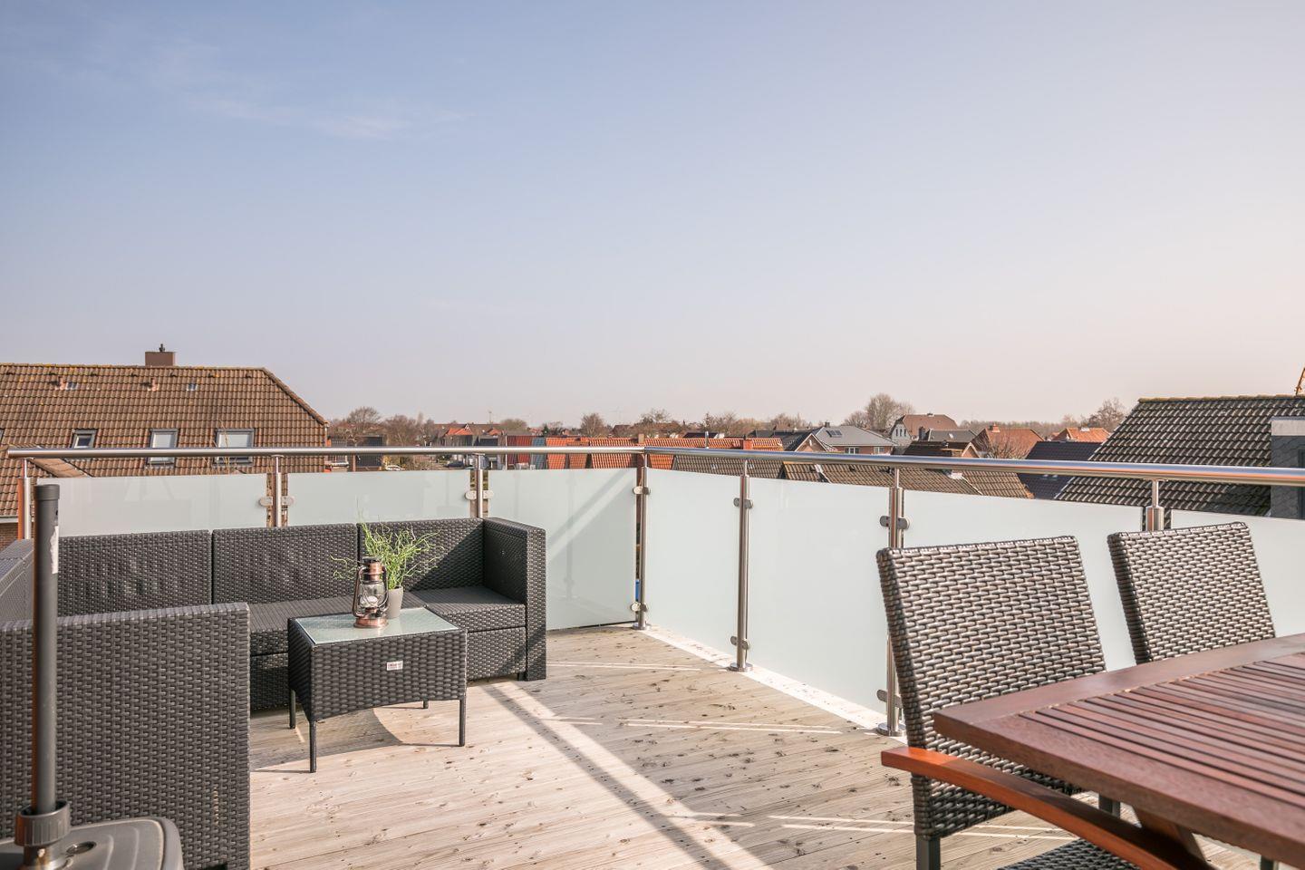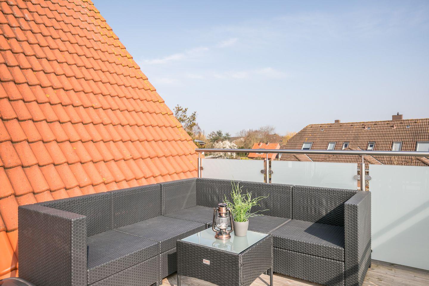 Aufgeteilt ist das Apartment in einen Wohn- und Essbereich mit einer offenen Küche. Die Küche ist mit einem Herd, Backofen, einer Mikrowelle und einer Geschirrspülmaschine ausgestattet. Das absolute Highlight der Wohnung ist die geräumige Dachterrasse. Diese ist von dem Flur zu erreichen und ist mit Lounge Möbeln ausgestattet.